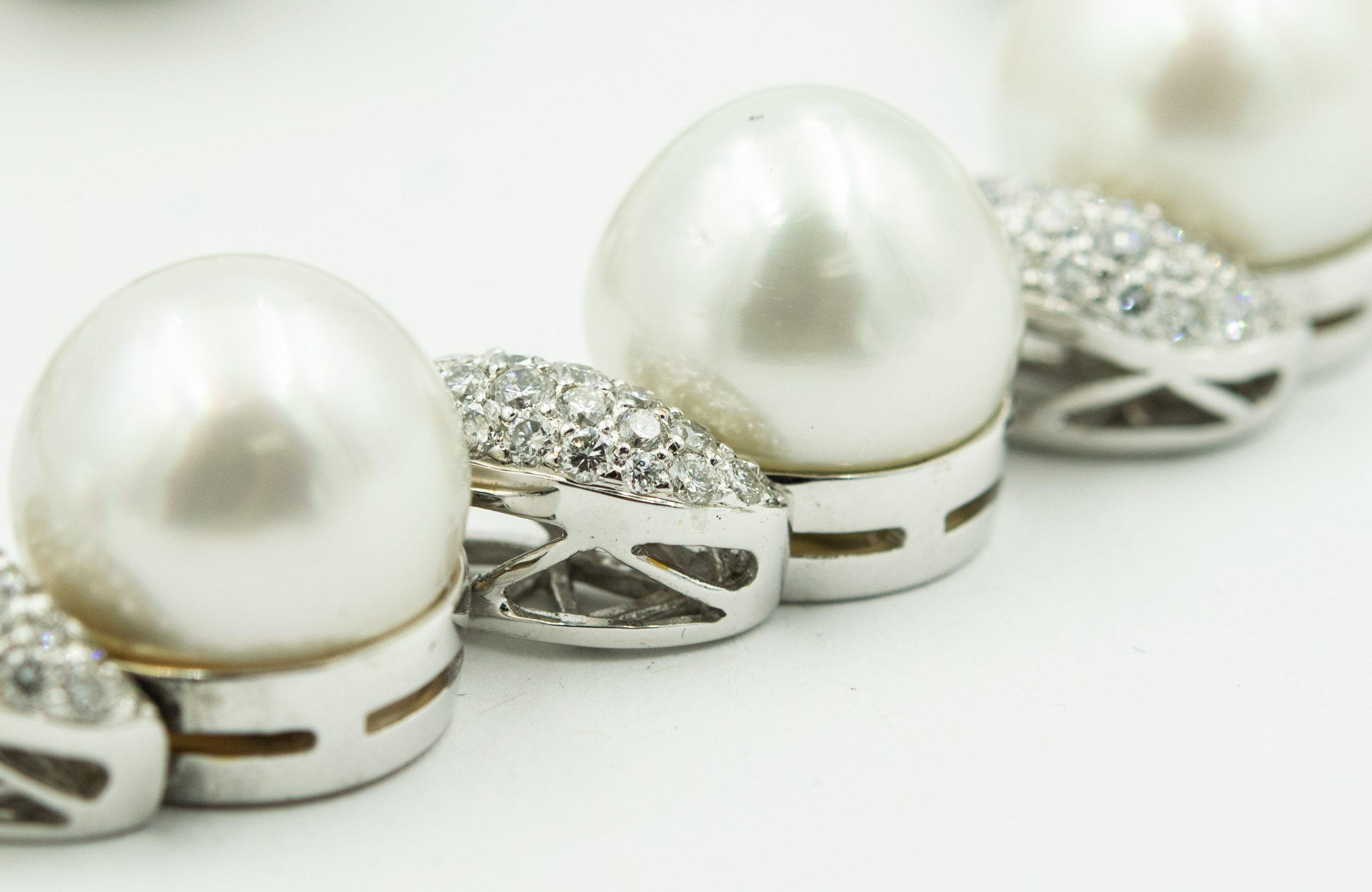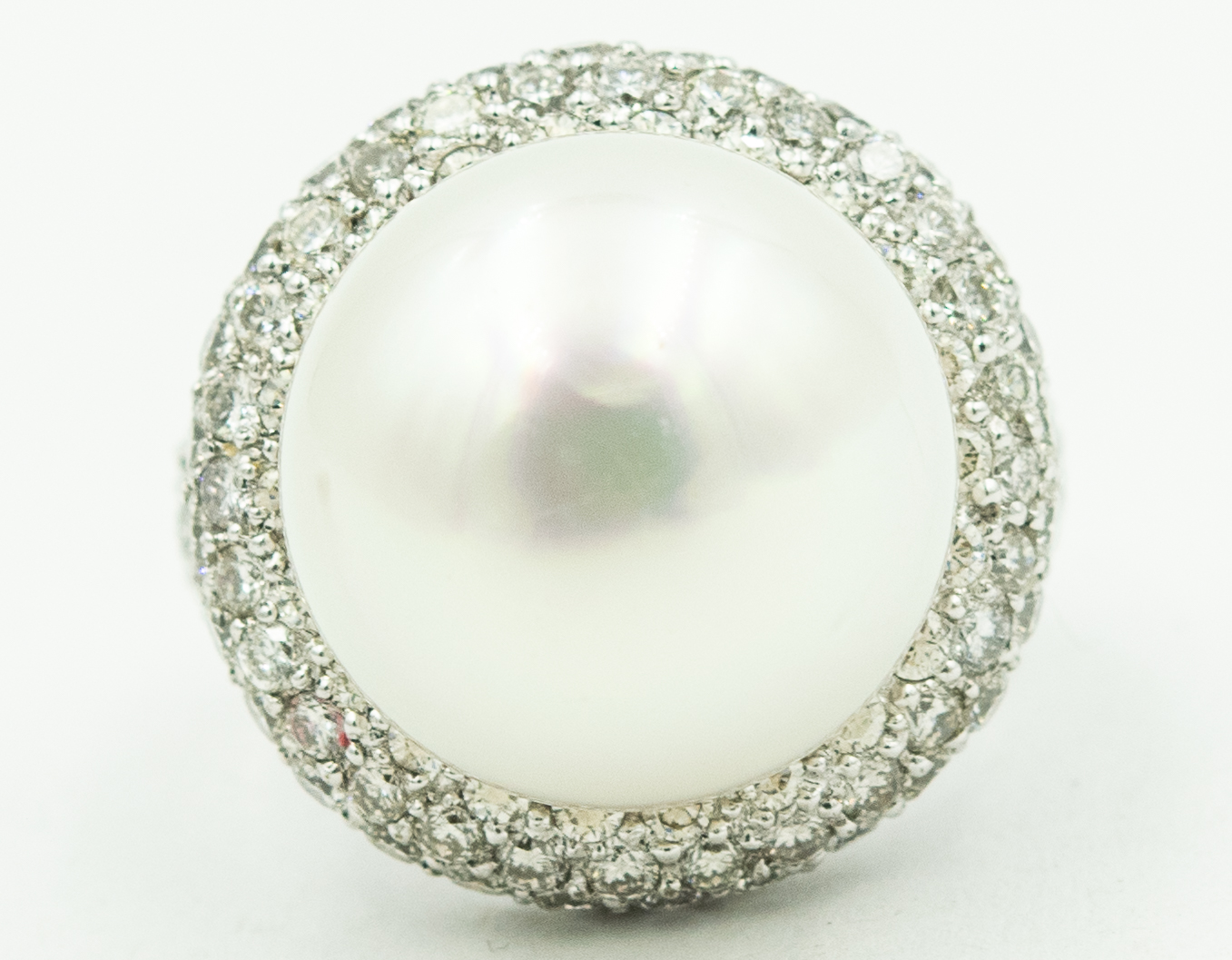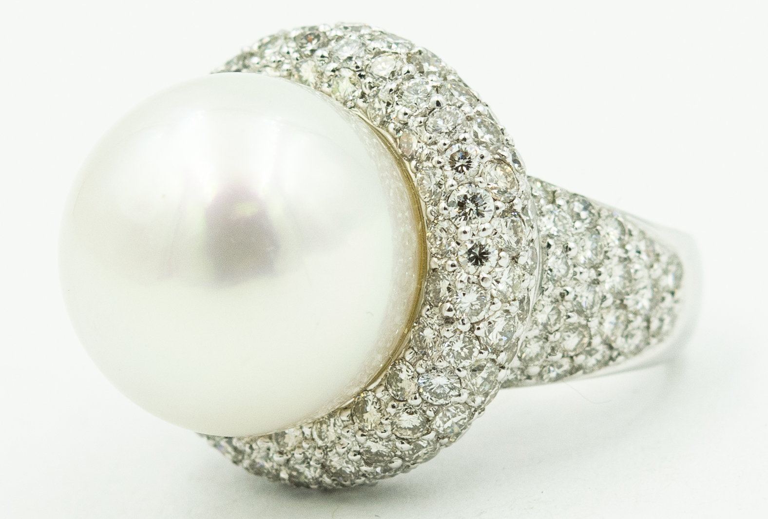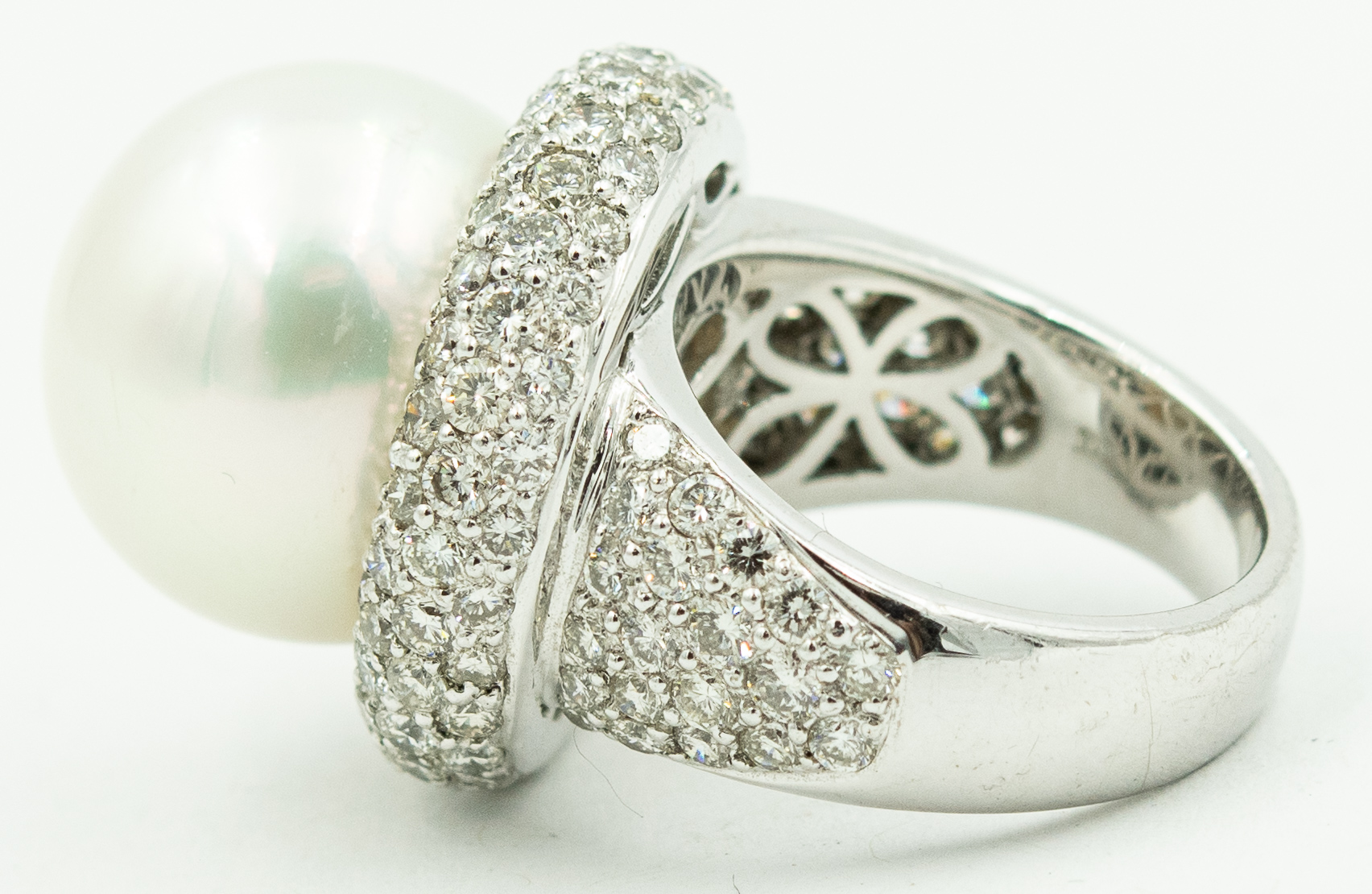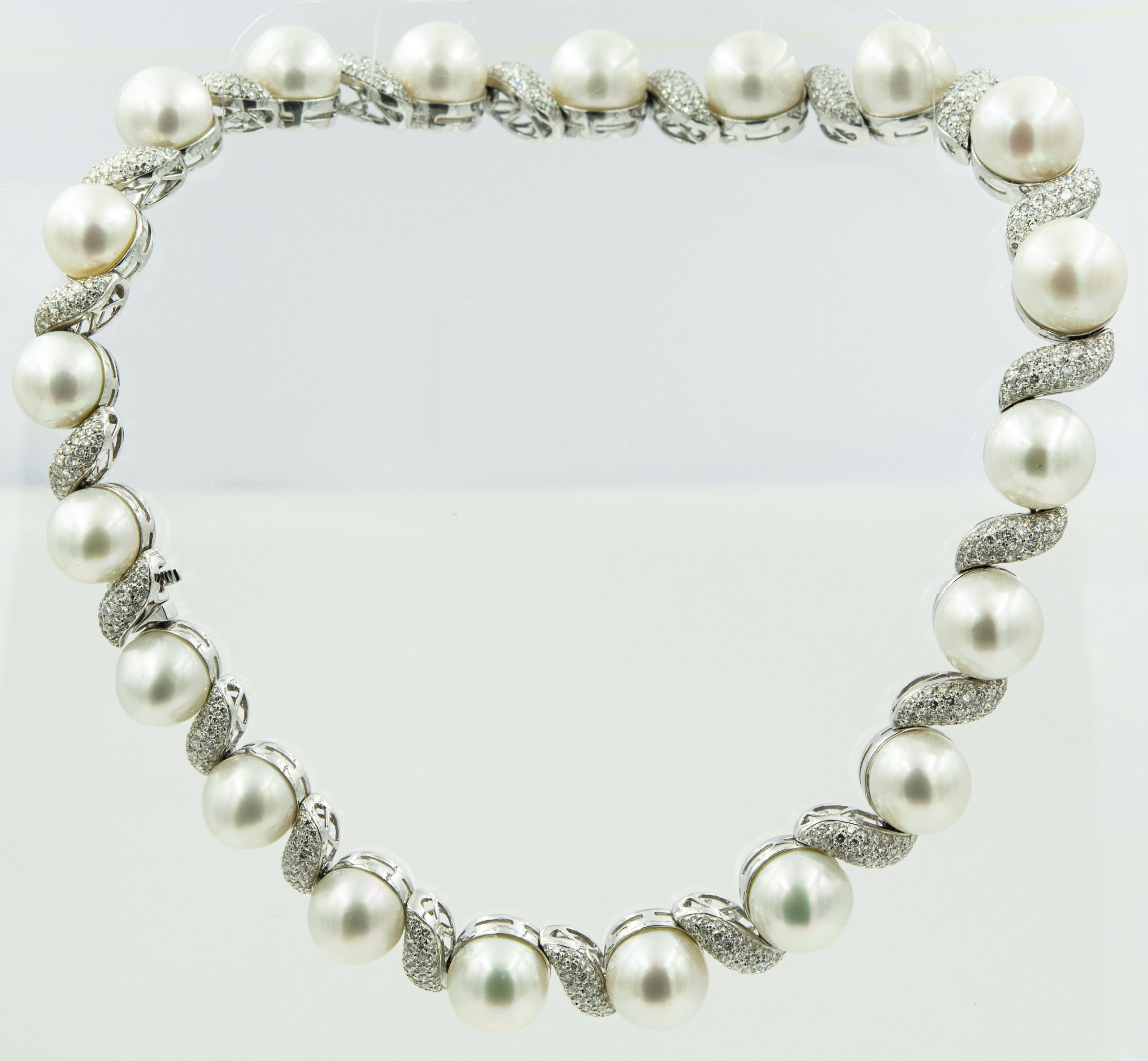 Estate South Sea Pearl and Diamond Necklace Earrings and Ring Suite; 18k white gold; 152.0dwt