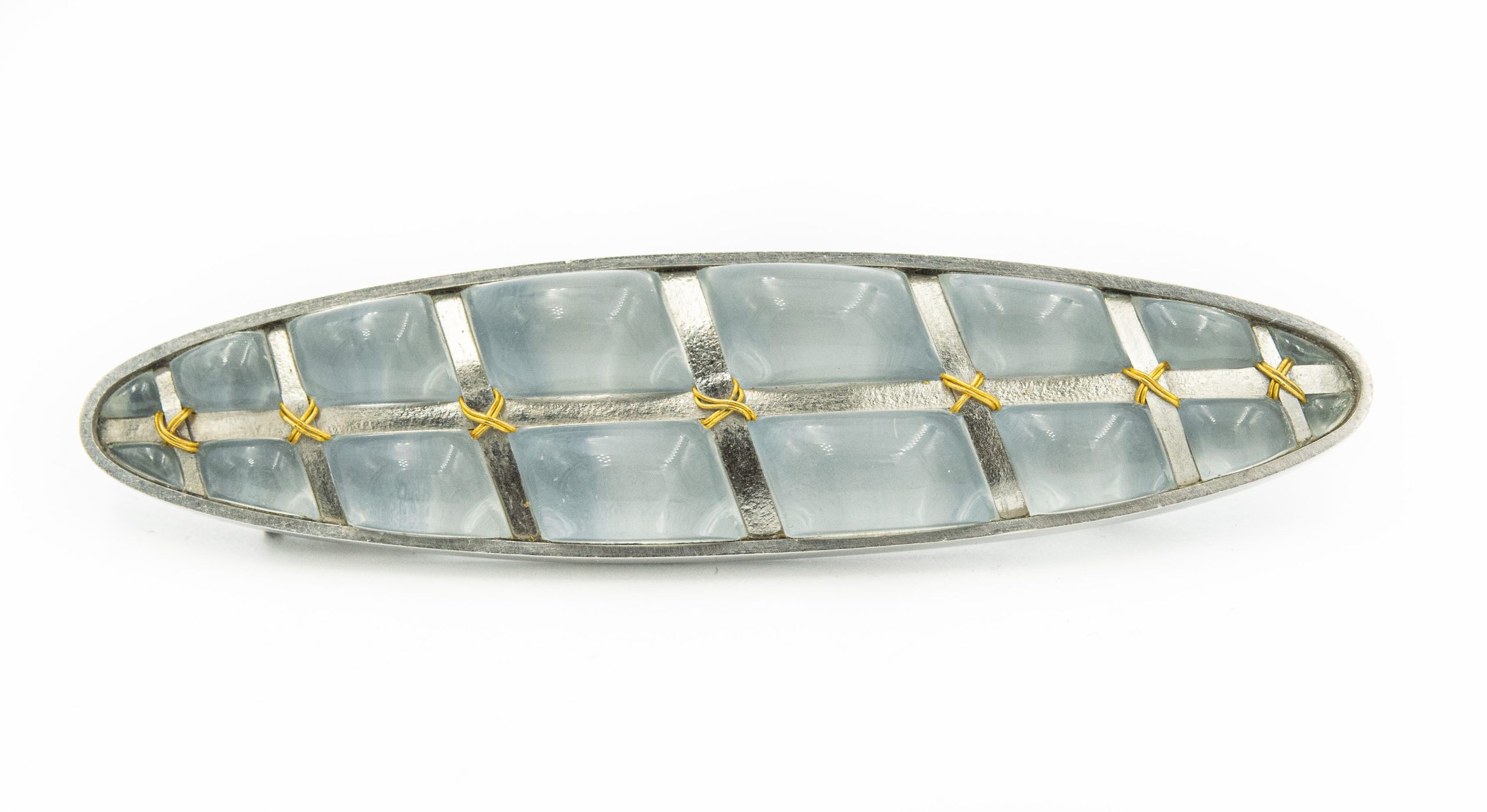 Estate Sterling Silver and Artist Glass Brooch Circa 1997; sterling silver; 1.30otz; 3 3/4". The brooch features a navette shaped design with a basket weave blue glass inlayed with silver and gold straps.