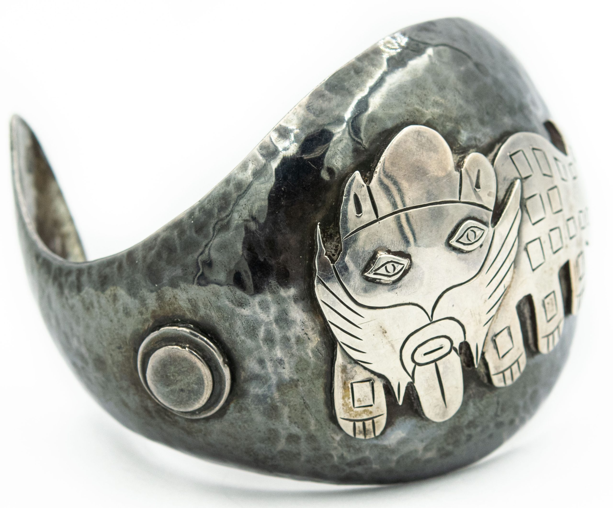 Estate Sterling Silver Imposed Inca Mythical Beast Bangle and Brooch Suite