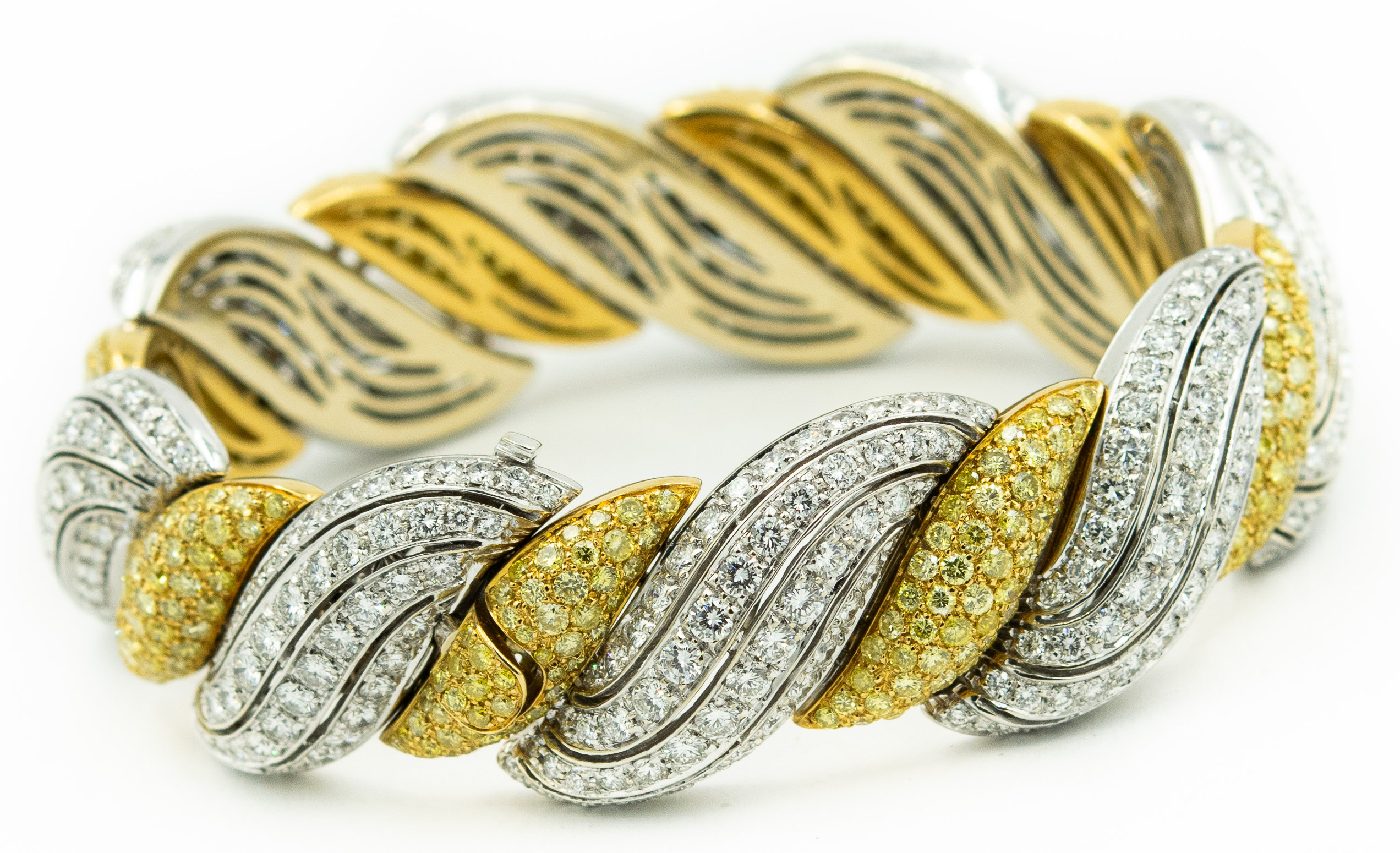 Estate Two Toned Gold and Fancy Color Diamond Bracelet; 18k two toned gold; 60.0dwt/93.60g; 460 fancy colored yellow diamonds and 460 colorless diamonds 41.50cts; 7 1/2"