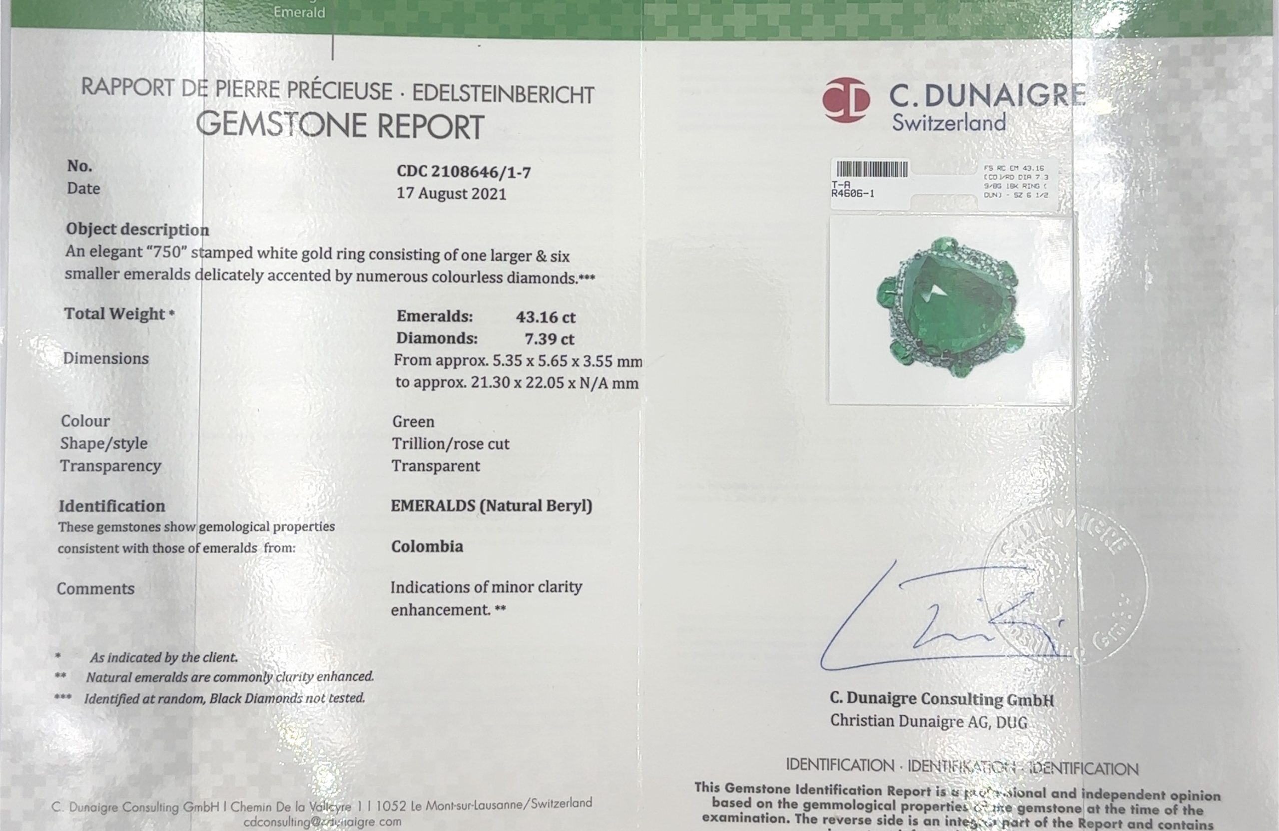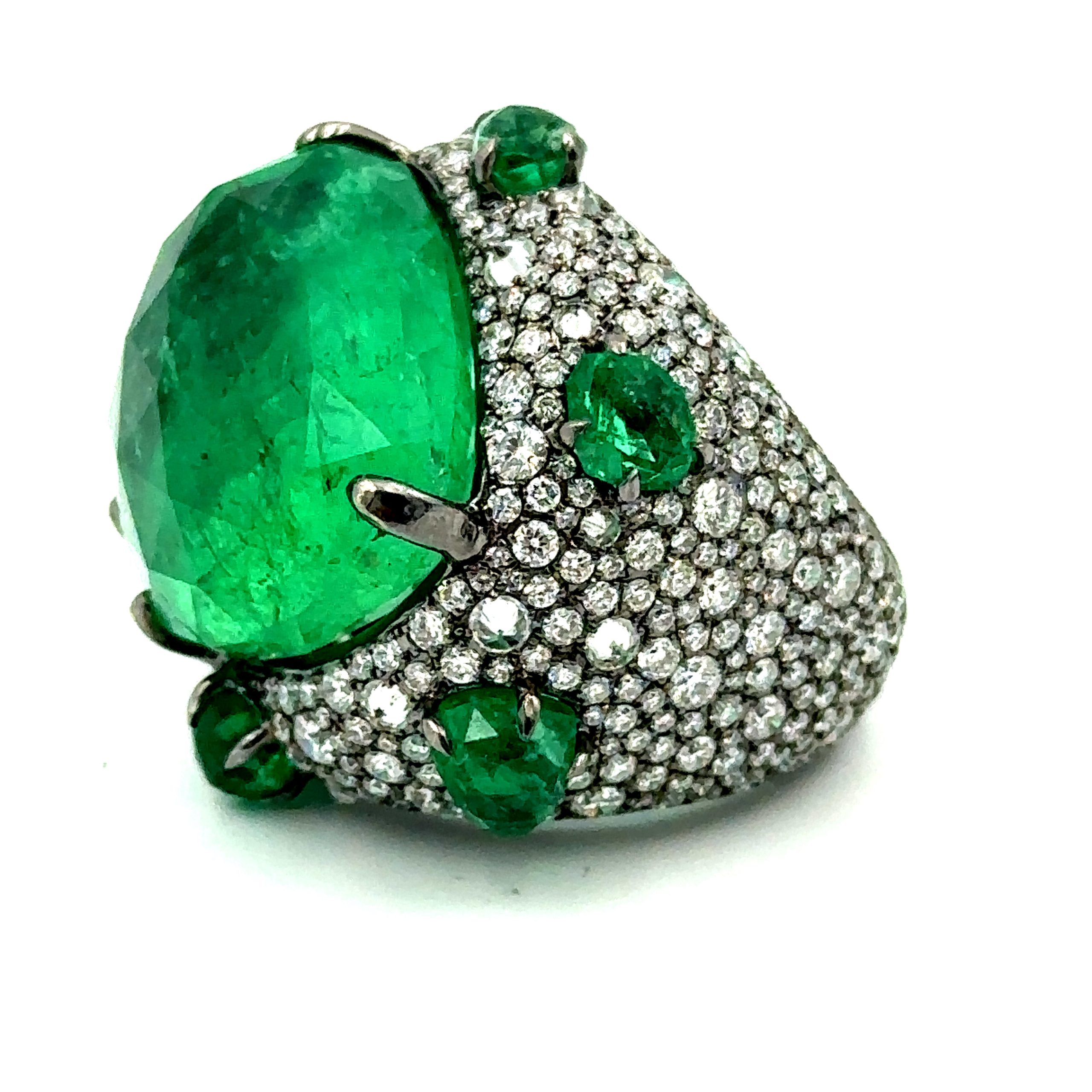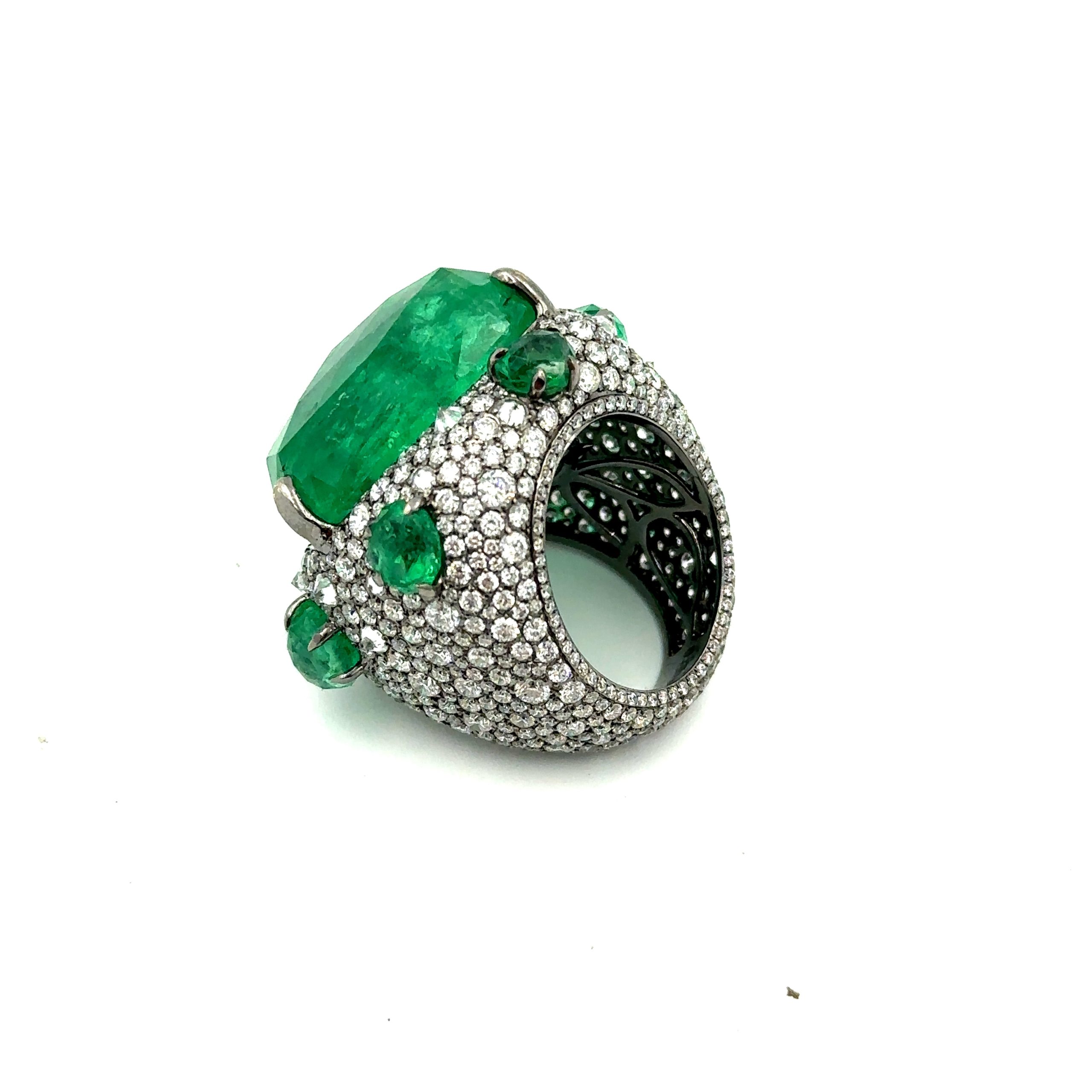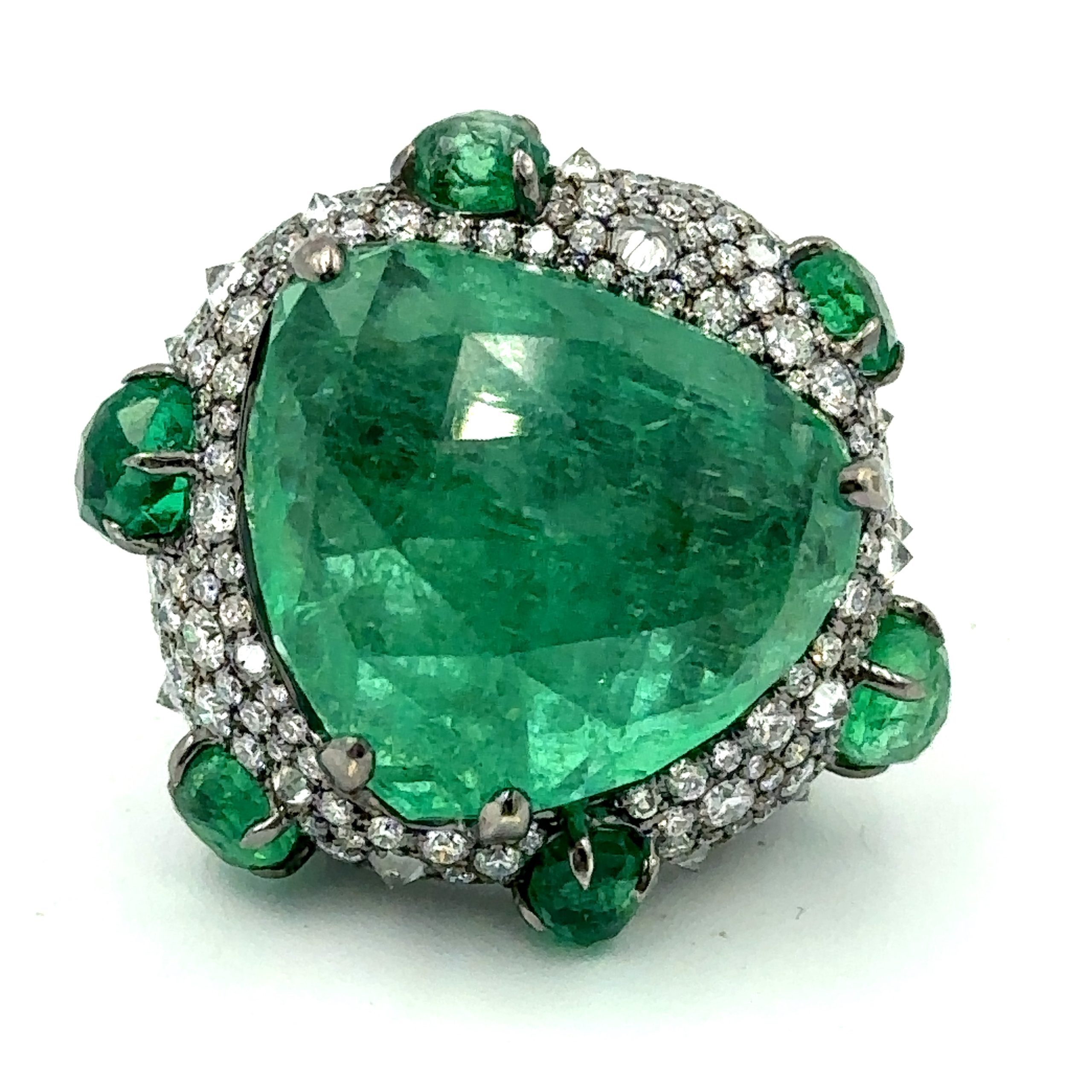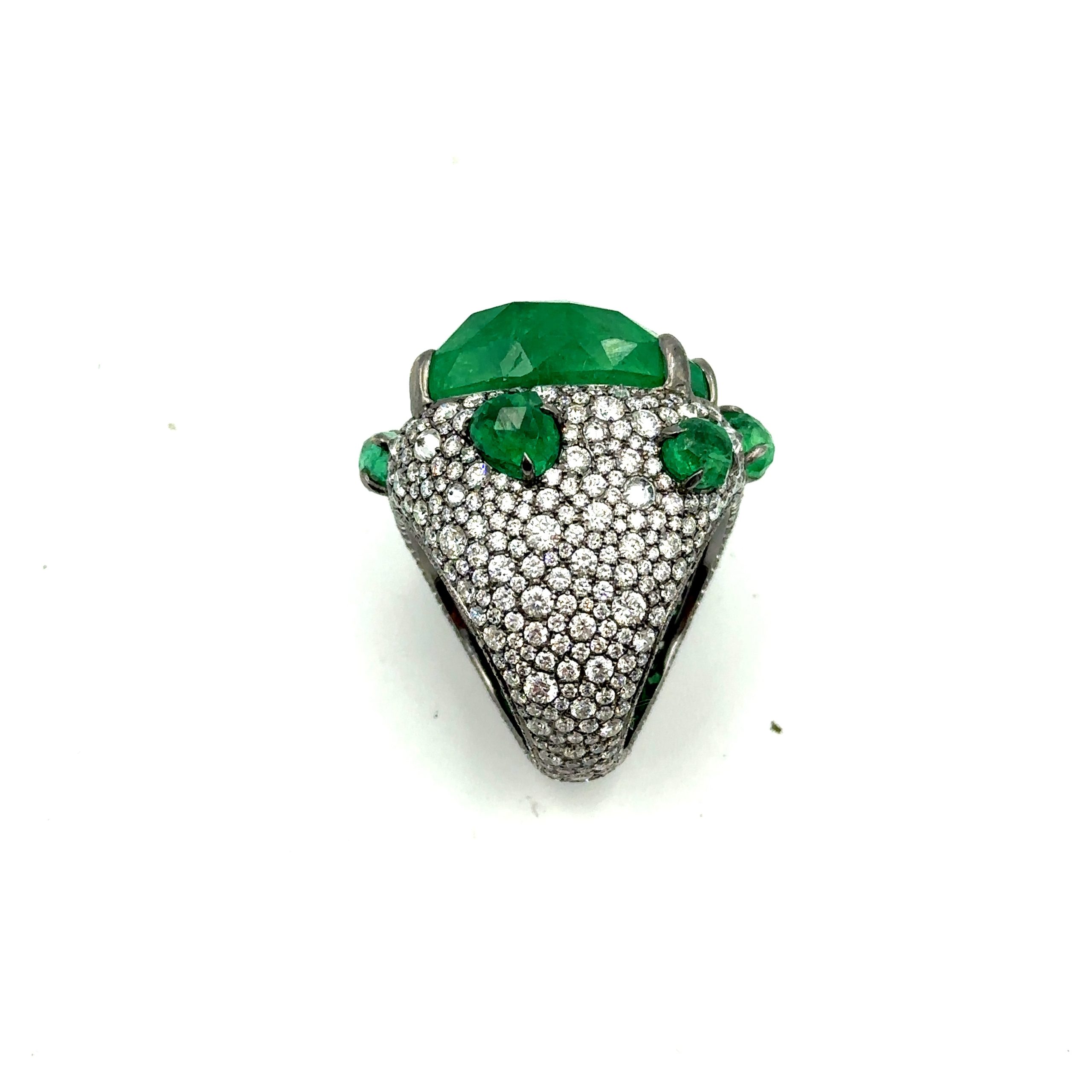 Estate Unique Contemporary Gold, Diamond and Emerald Ring By Piranesi; 18k gold; The ring is centrally set with a large faceted free formed faceted emerald crystal that weighs 37.87cts. It is framed with (6) smaller matching emeralds that weigh 5.29cts. They are set in a handmade 18k gold mounting that is pave set with round cut diamonds weighing 7.39cts. The ring is size 6 3/4 and it is accompanied with a Swiss Colored Stone Report.