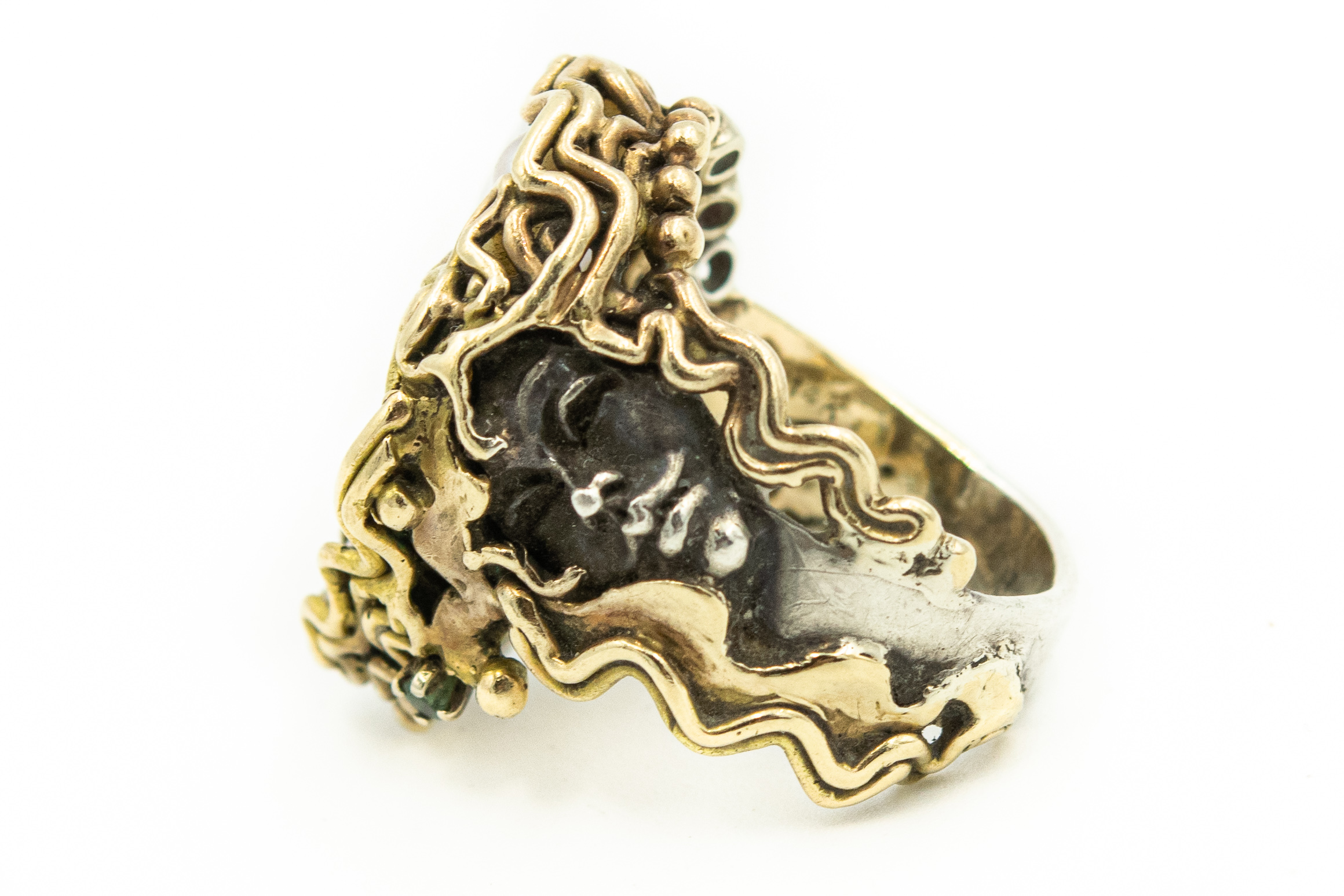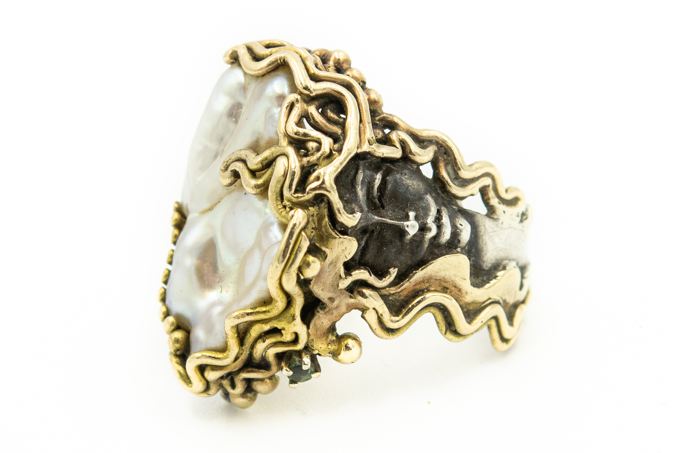 Estate Unusual Artisan Yellow Gold and Sterling Silver Baroque Pearl Temptress Ring