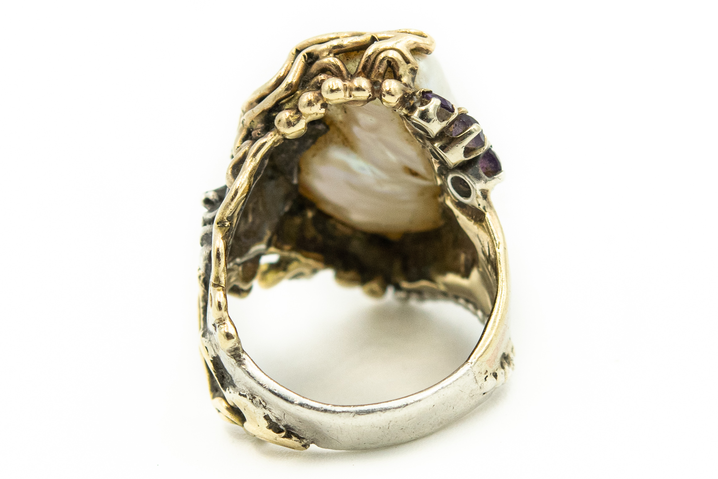 Estate Unusual Artisan Yellow Gold and Sterling Silver Baroque Pearl Temptress Ring; yellow gold; 8.20dwt/12.70g; pearl 23.0mm x 15.0mm; Ring Size 7; Partial signature on shank