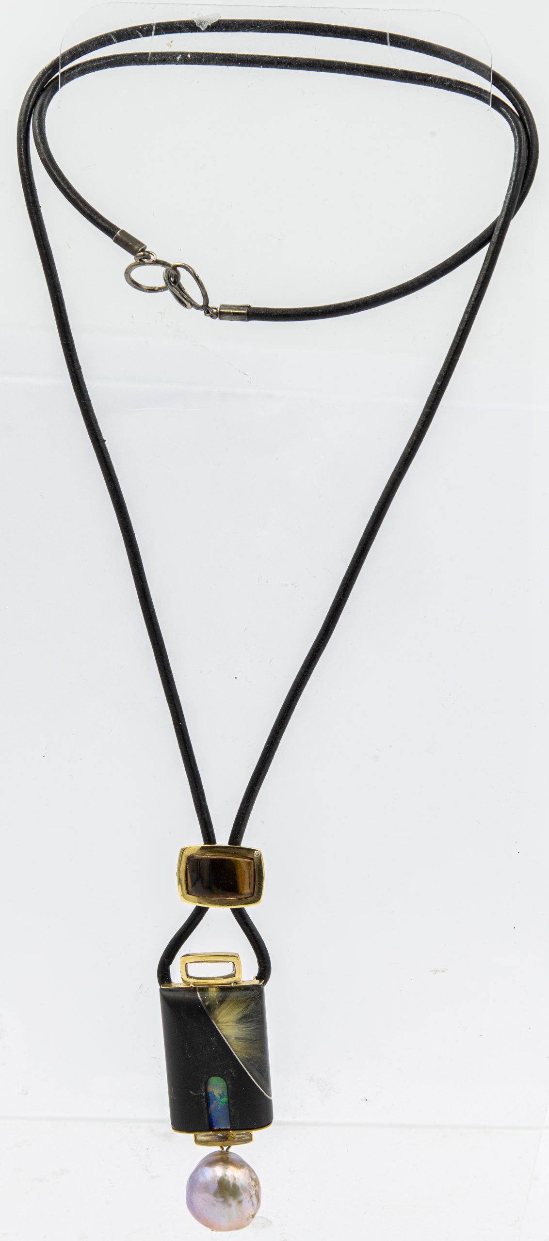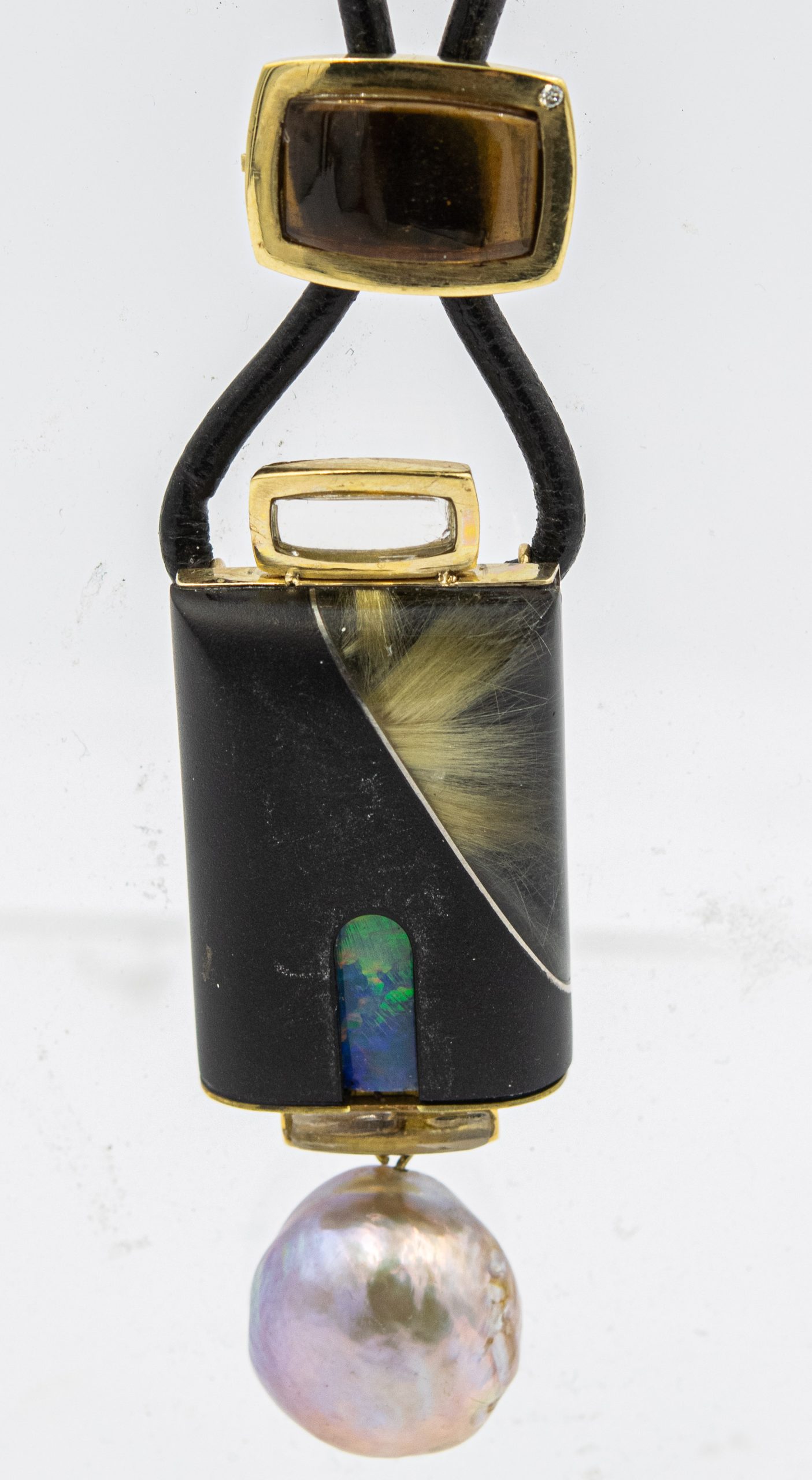 Estate Unusual Designers Black Opal Rutilated Quartz Necklace By S. Walters. The necklace featuring a rectangular design inlayed with rutilated quartz suspending a large baroque pearl that measures 18.50mm in width. It is centrally set with a black opal and framed in 14k yellow gold. It is suspended from a black cord necklace that measures 32" long.