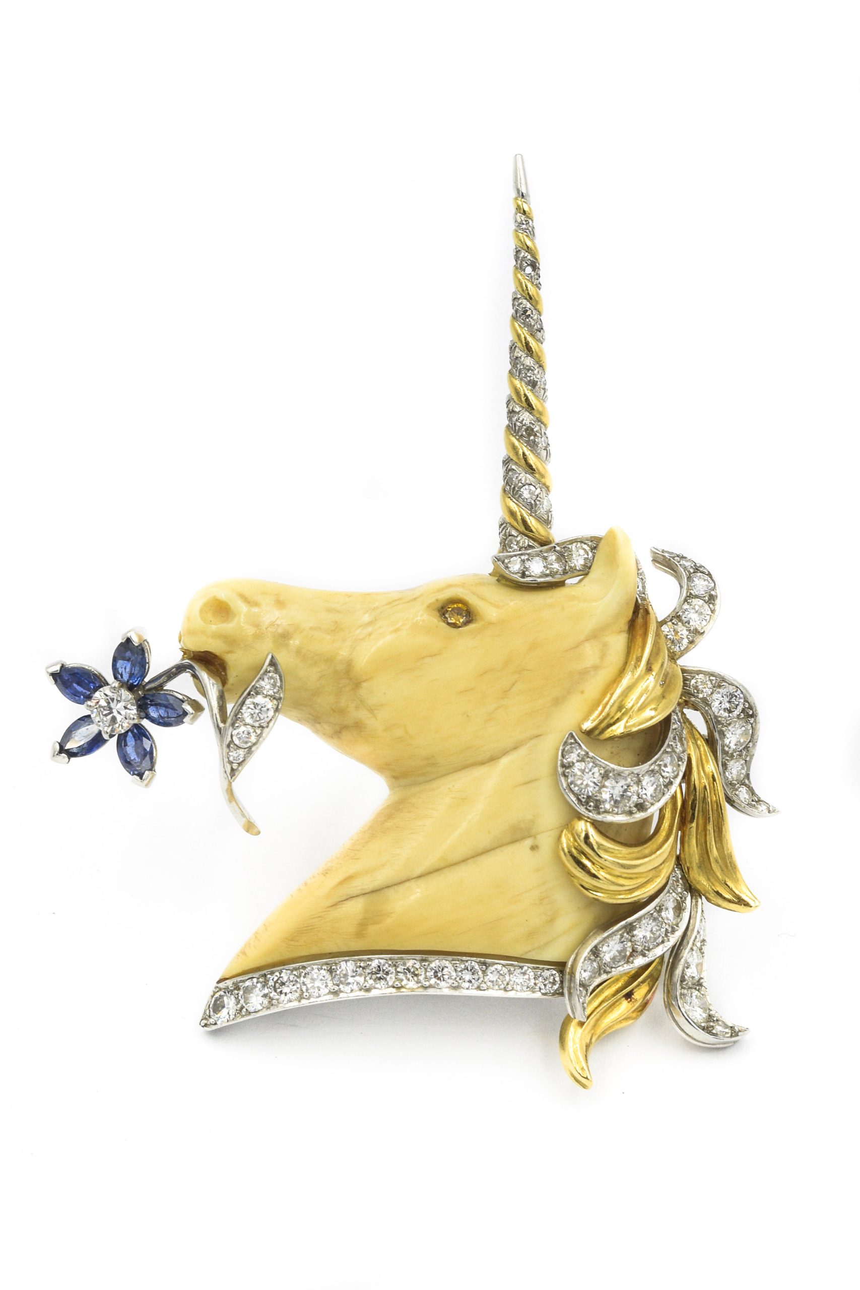 Estate Vaillant Yellow and White Gold Diamond and Blue Sapphire Unicorn Brooch; 18k yellow and white gold; 21.6dwt/33.59g; 75 round diamonds 3.50cts; 5 marquise shape sapphires 0.75cts; 2 3/4" x 2 1/16"