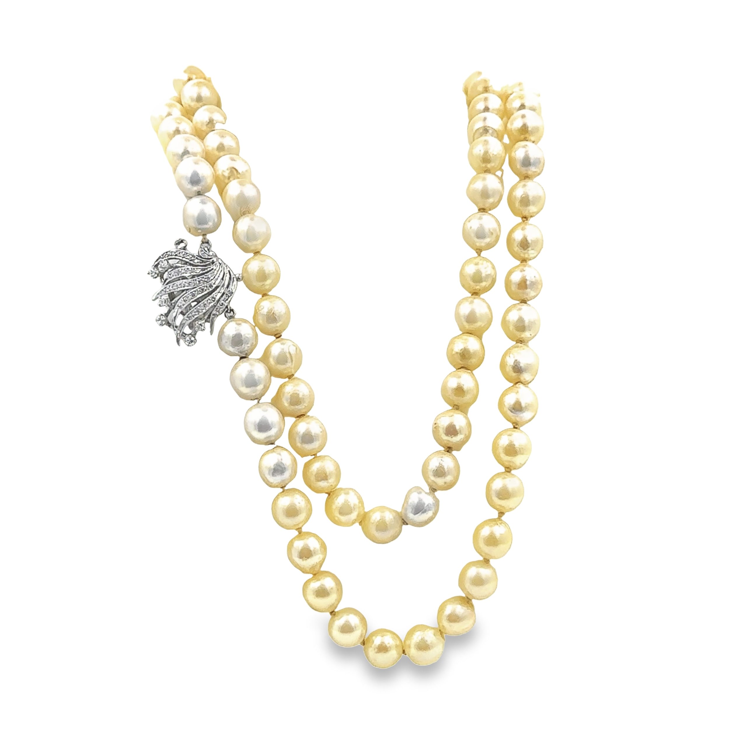 Estate Vintage Cultured Pearl and Diamond Necklace; The necklace features a single strand design strung with 80 pearls that measures 8.50mm-9.00mm in width. The necklace terminates with a 14K white gold clasp that is pave set with 63 diamonds weighing 0.33cts combined. The necklace measures 31".