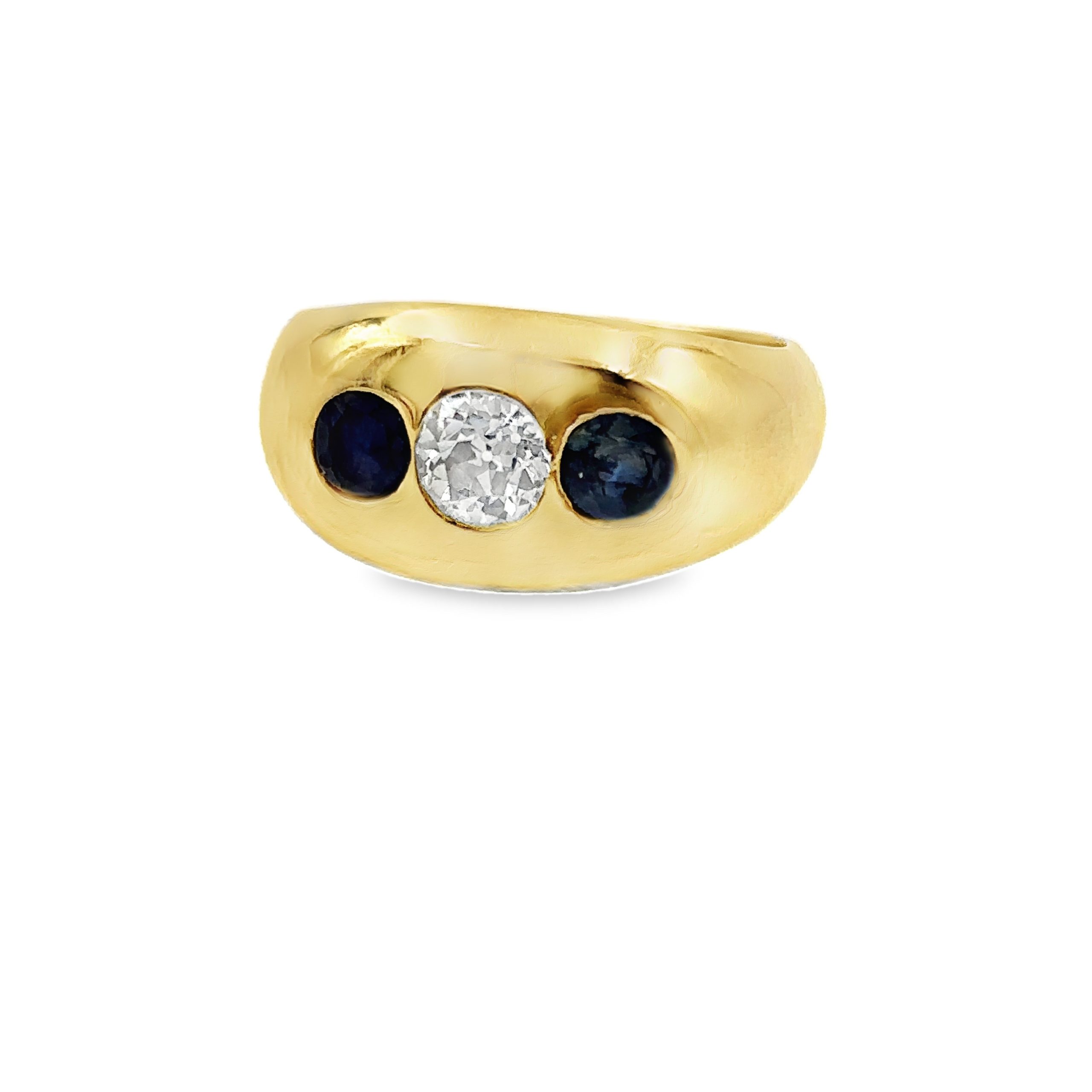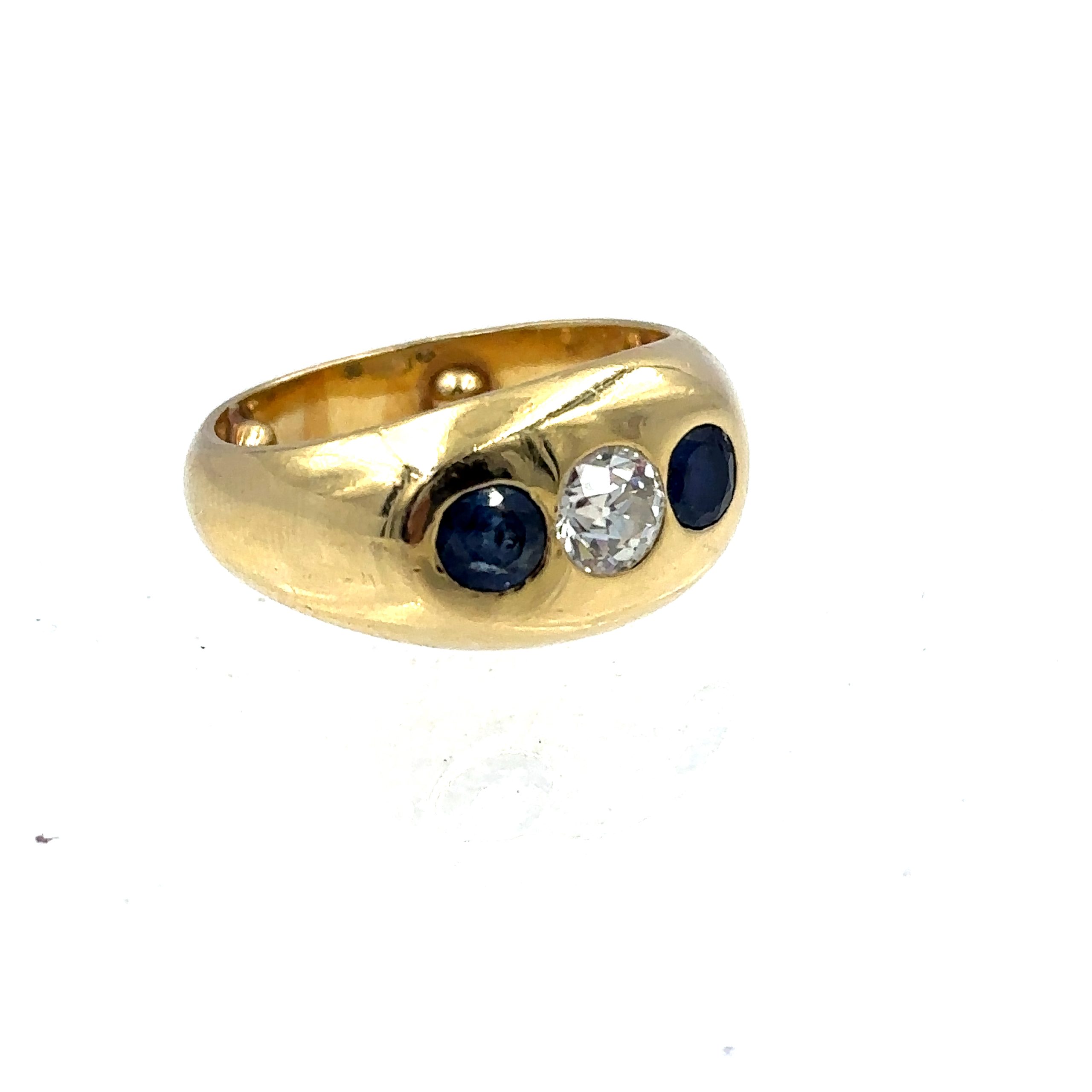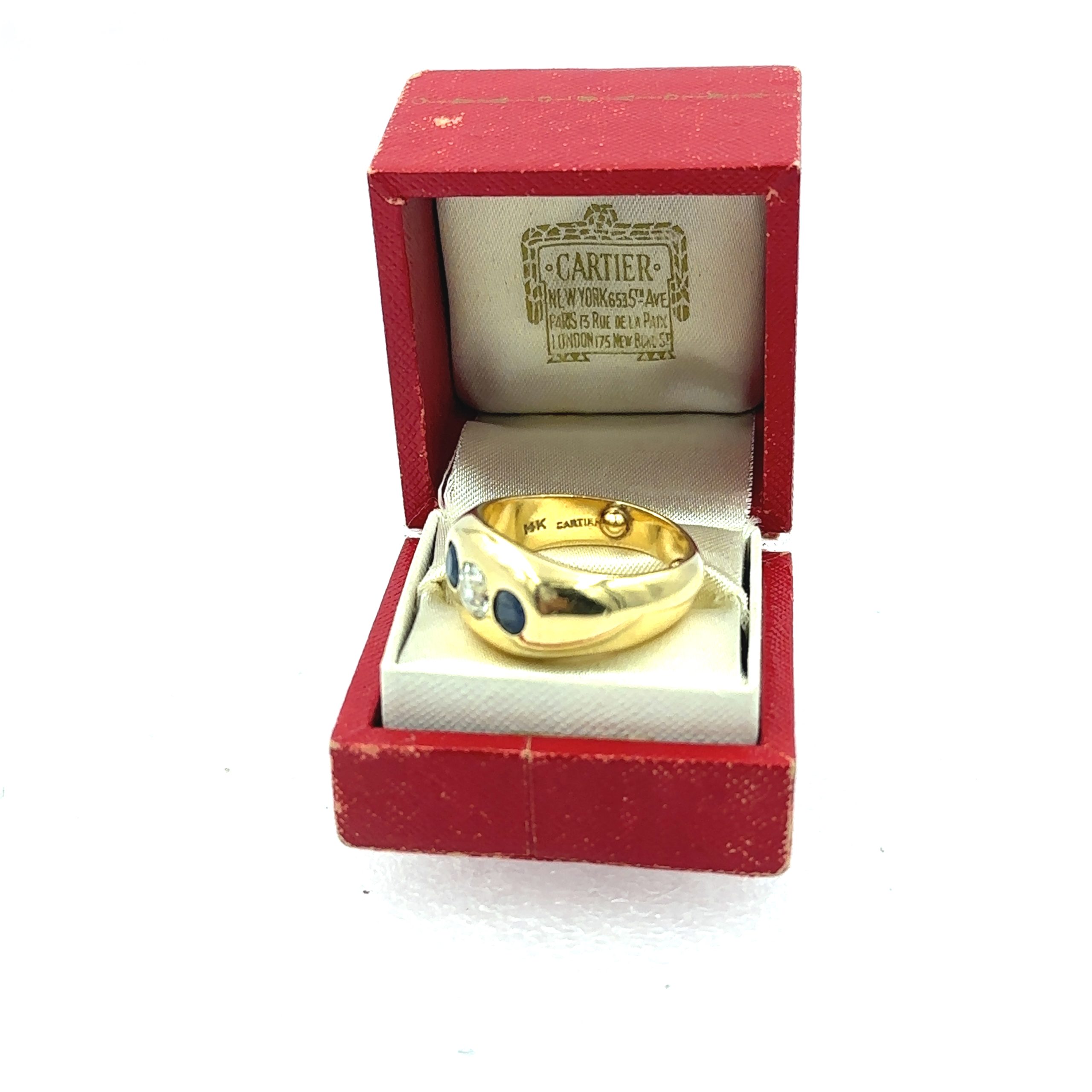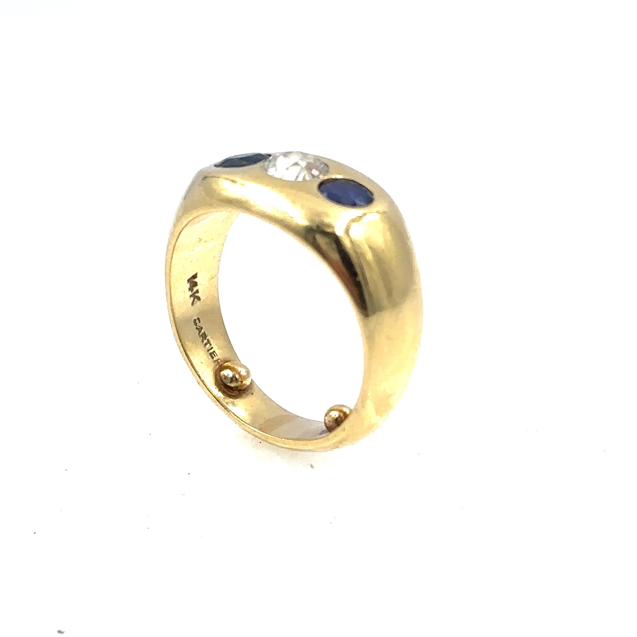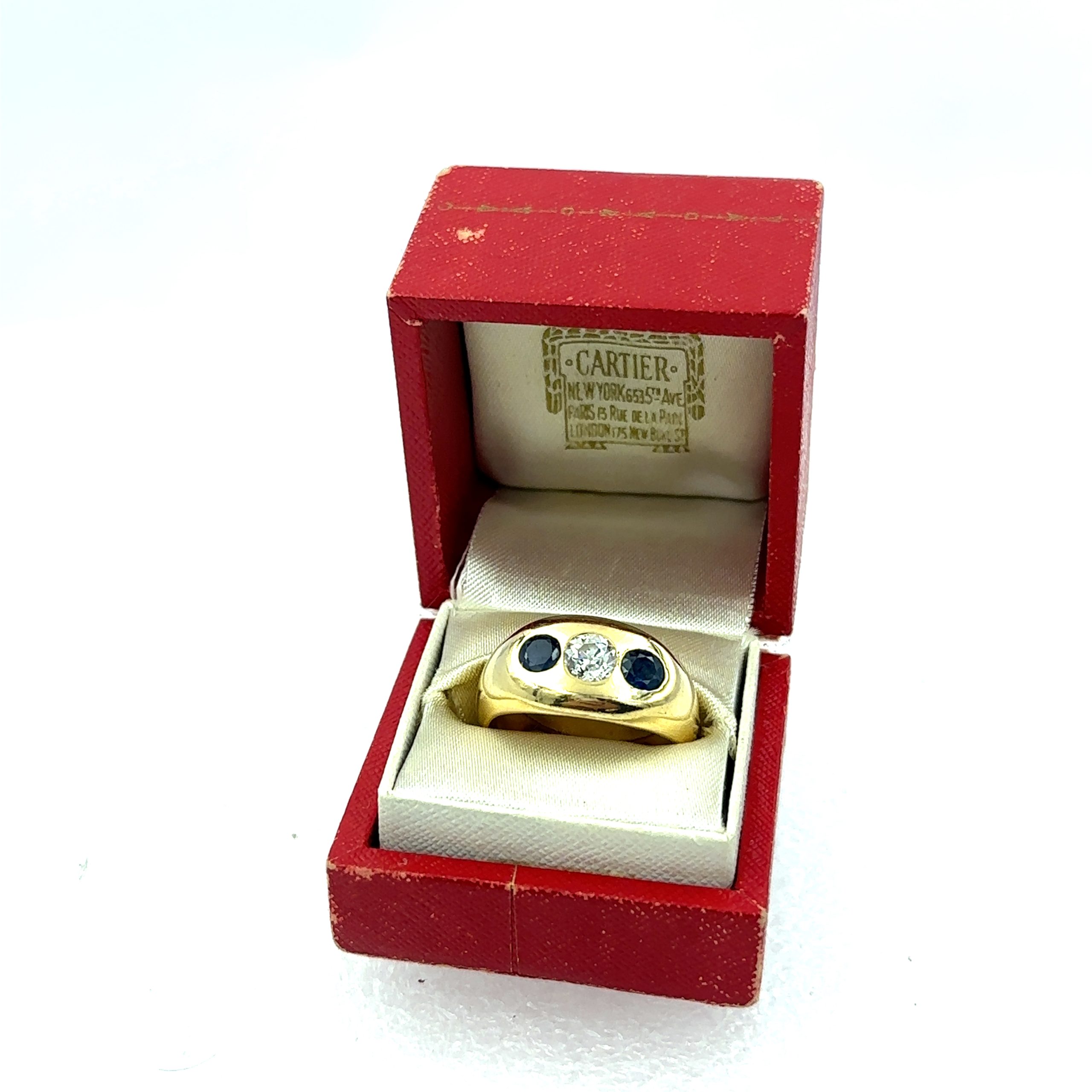 Estate Vintage Three Stone Diamond and Sapphire Cartier Ring; 14k yellow gold; 9.00dwt/14.0g; 1 old mine cut diamond 0.96cts; 2 sapphires 1.50cts; Ring Size 10; accompanied with fitted Cartier box.