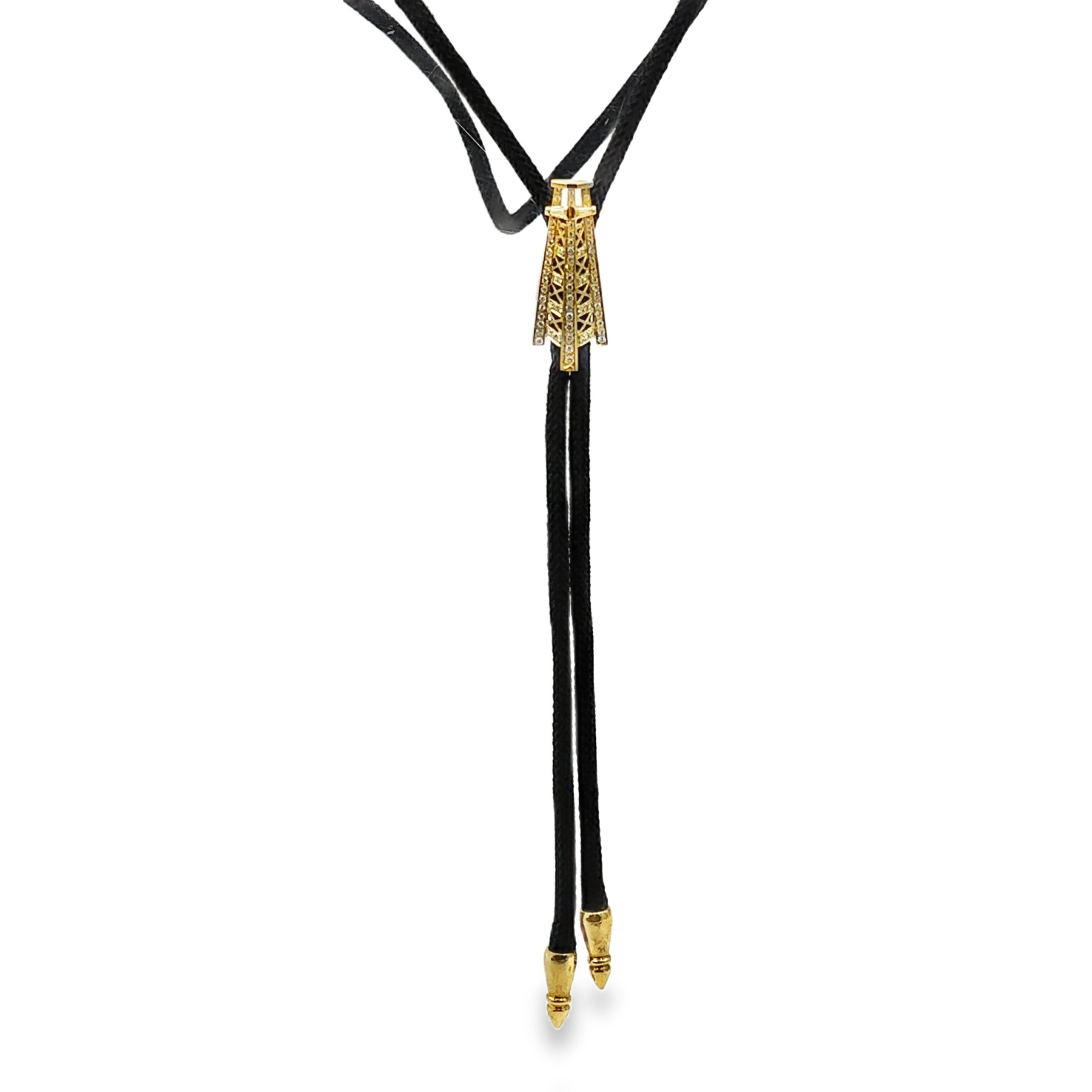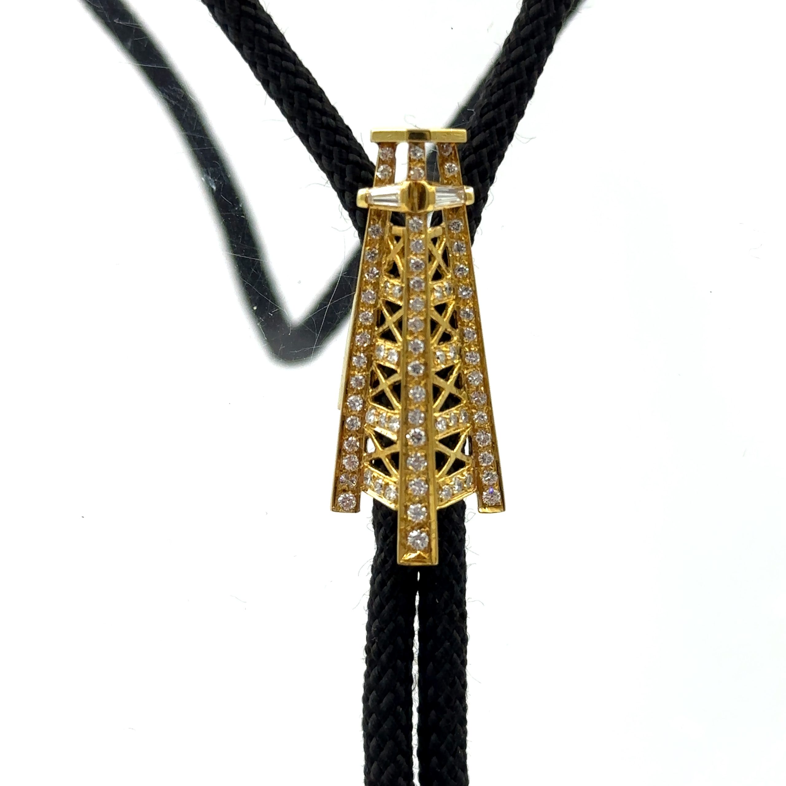 Estate Vintage Whimsical Gold and Diamond Oil Drill Bolo; gold; 13.00dwt/20.00g; 70 brilliant cut diamonds 1.00cts; black silk cord terminating with solid gold tassels; 30"