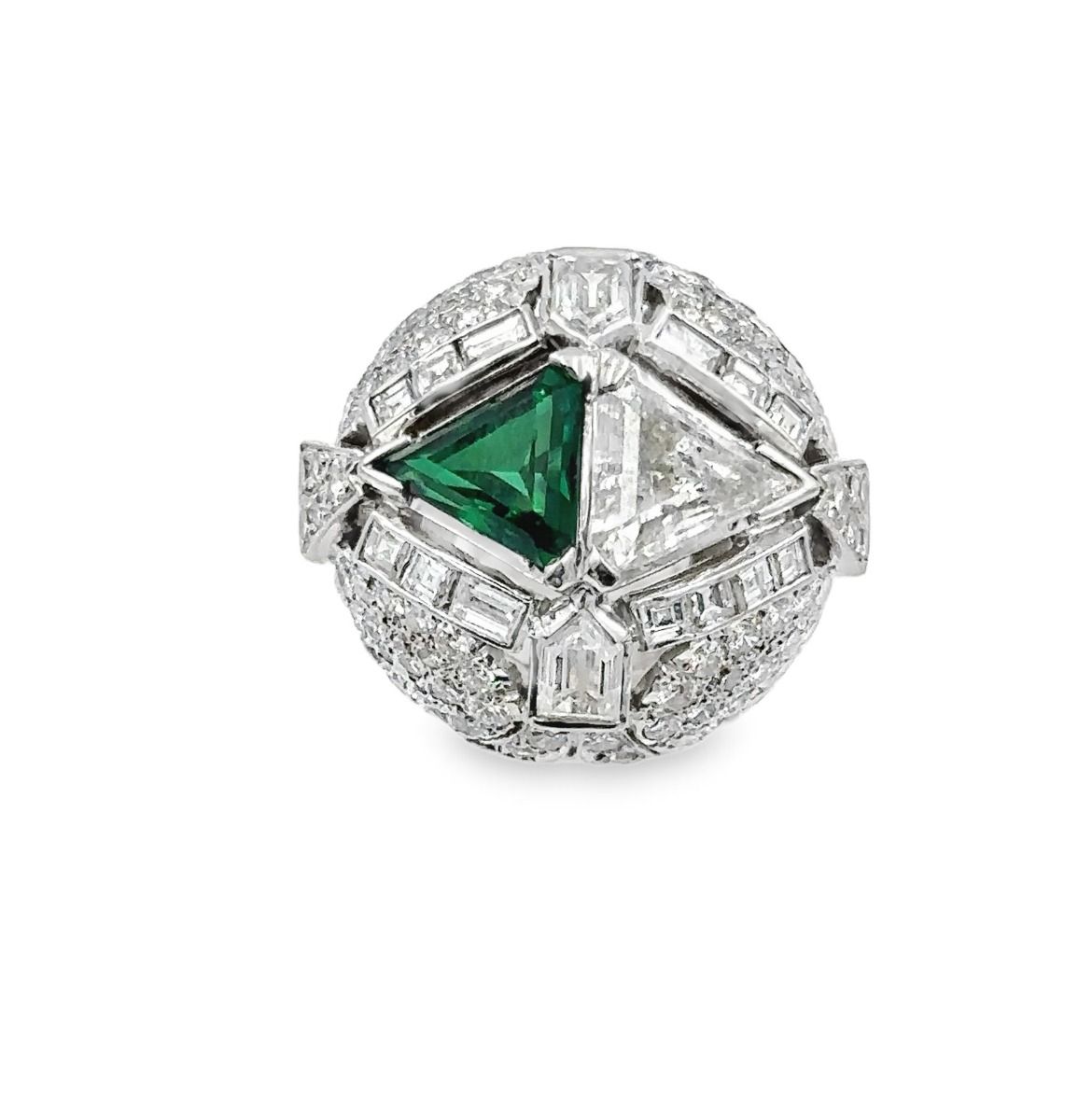Estate Vintage White Gold and Diamond Bon Bon Ring; 14k white gold; 8.50dwt/13.20g; trilliant cut diamond 2.56Cts; 109 diamonds . 4.60cts; green trilliant glass; Ring Size 6 1/4