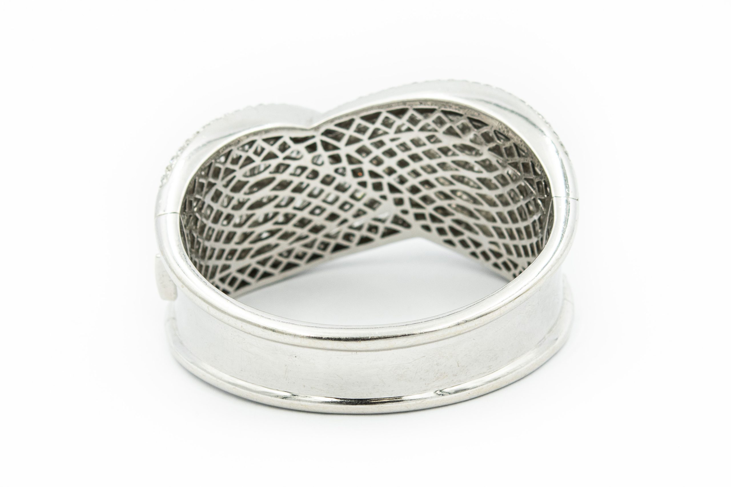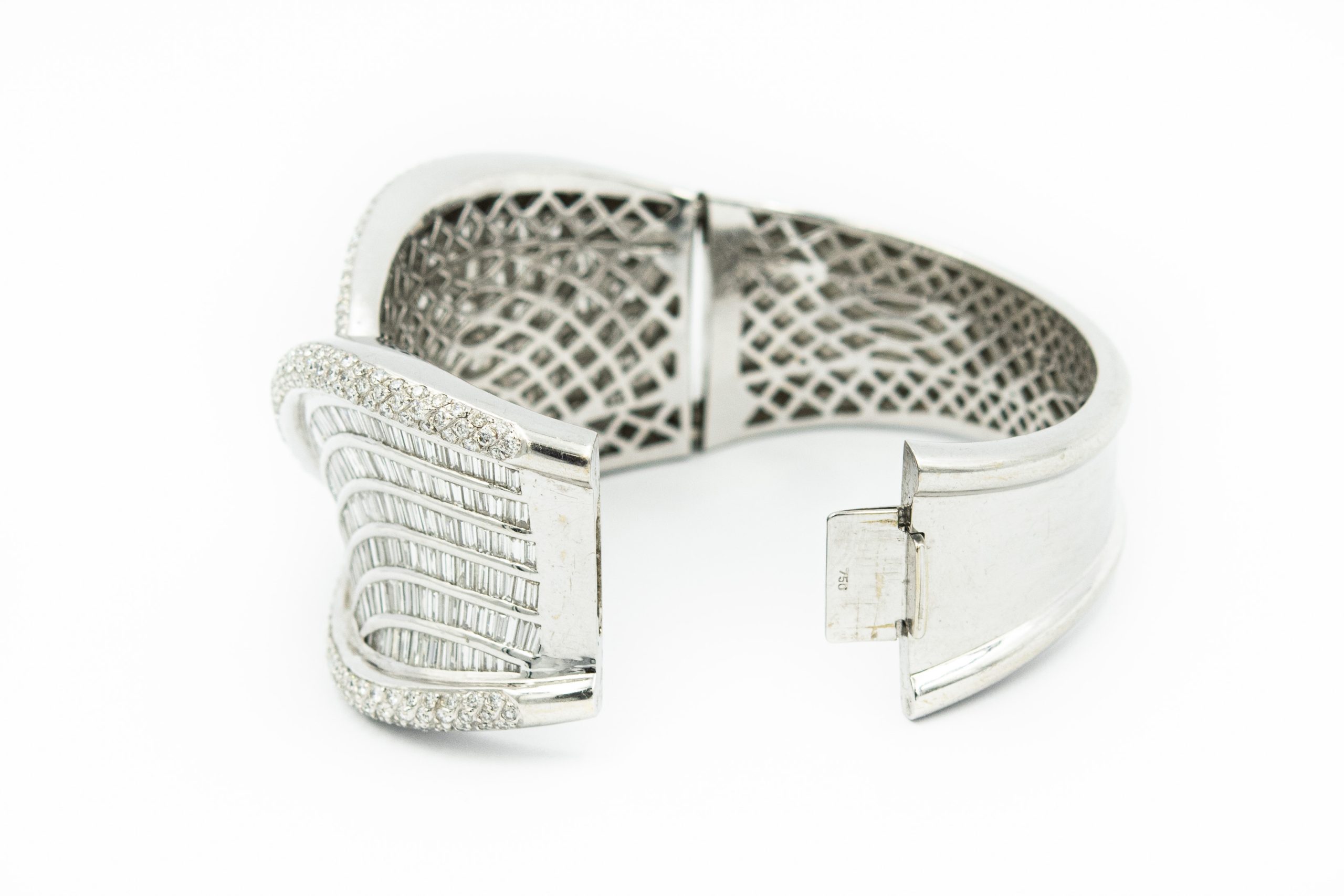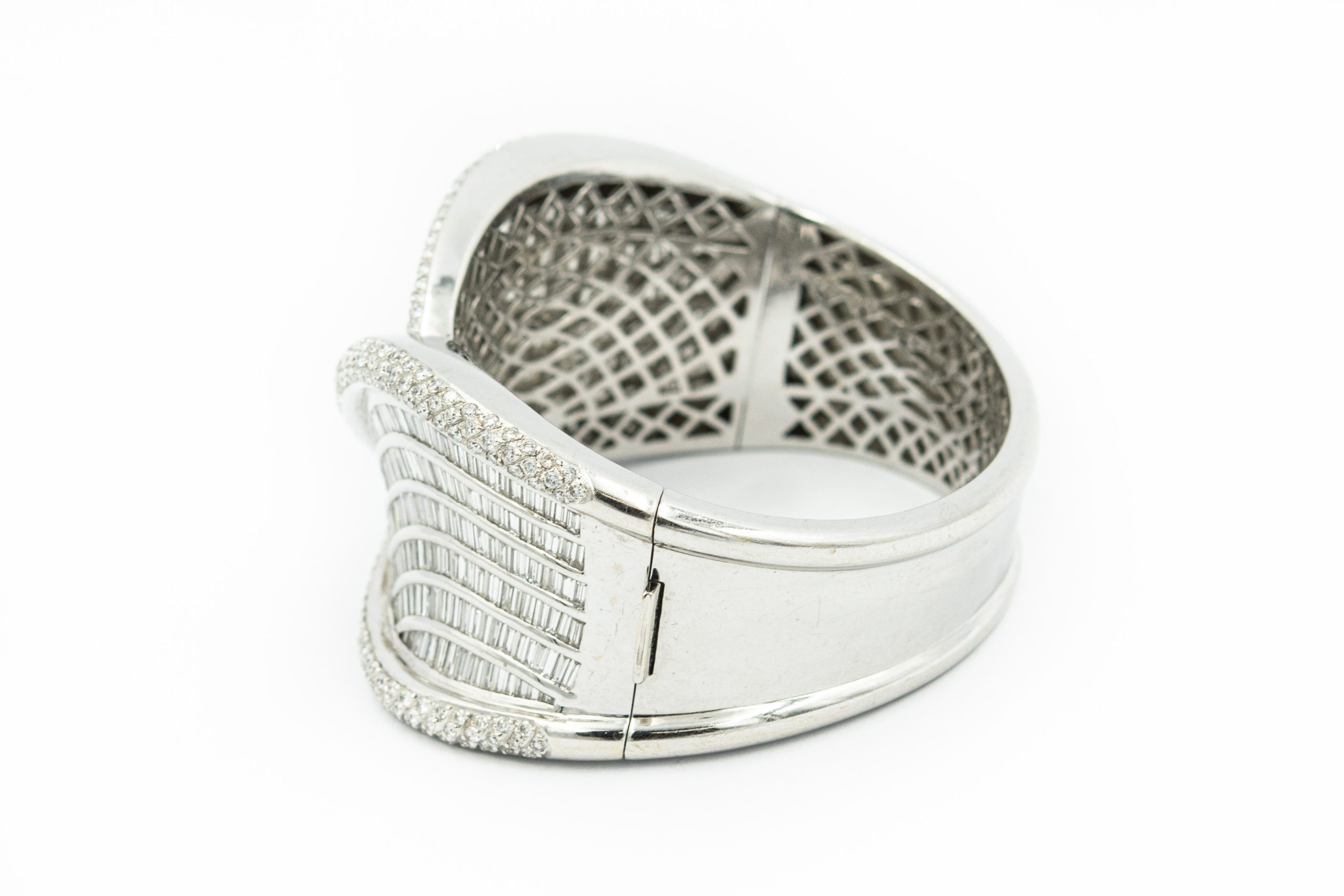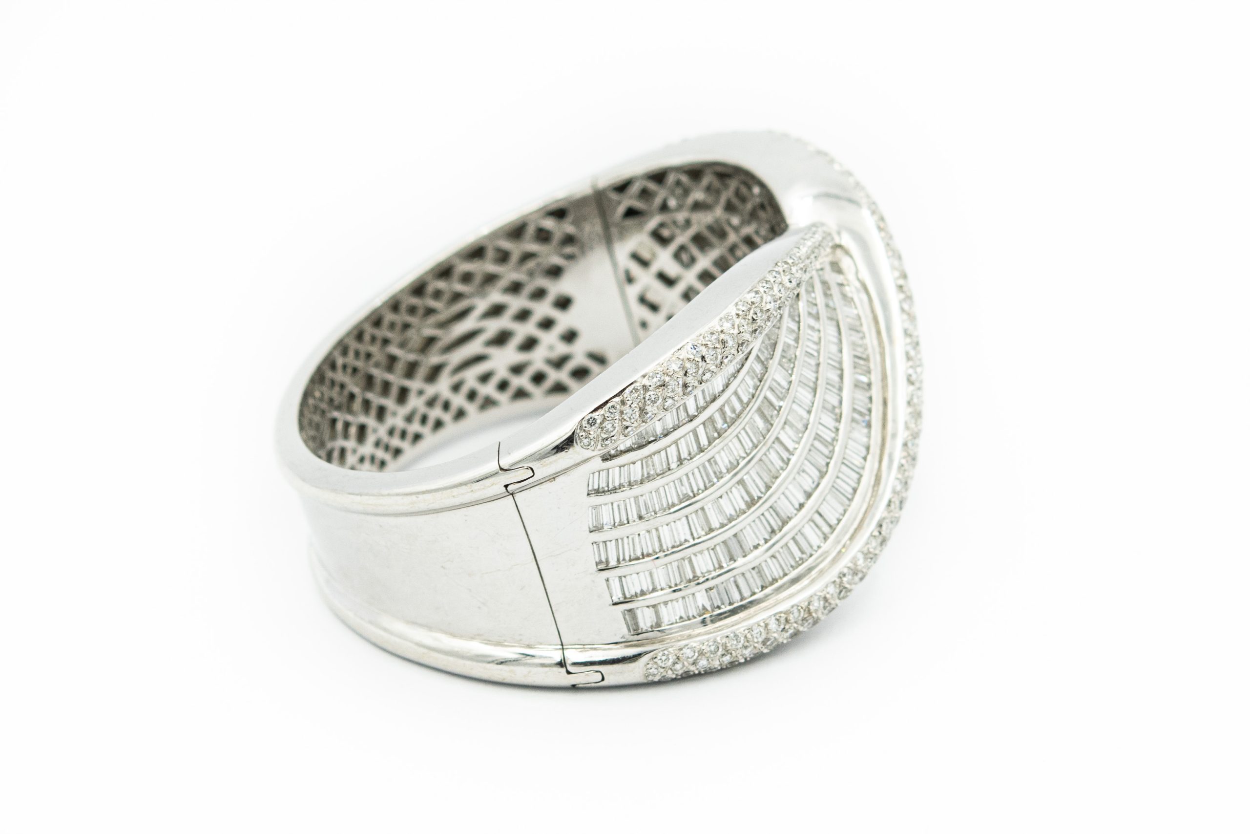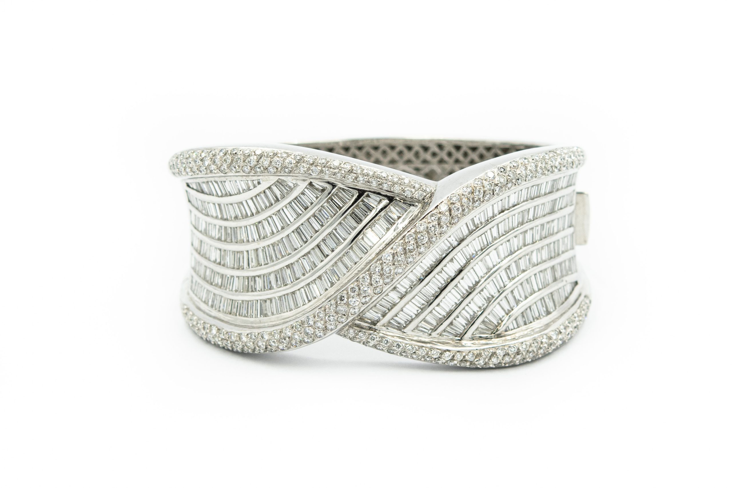 Estate White Gold and Diamond Cuff Bangle Bracelet. The bracelet features featuring 611 (350)baguette and (261) round brilliant cut diamonds weighing approx. 20.00cts combined. The diamonds are channel set in a handmade 18K white gold "ribbon" designed cuff bangle weighing 115grams/74.00dwt, measuring 6 3/4" x 1 1/3" in width.