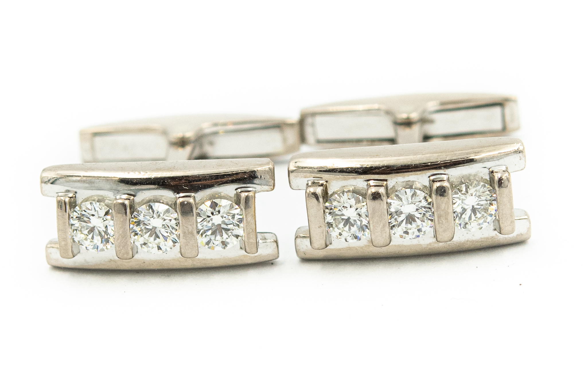 Estate White Gold and Diamond Cufflinks by Hearts On Fire; 18k white gold; 10.5dwt/16.3g; 6 round brilliant cut diamonds in a shared prong mounting 1.75cts; Signed on back "HOF"; Retail Price $6500