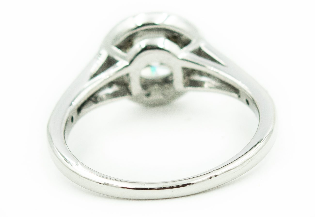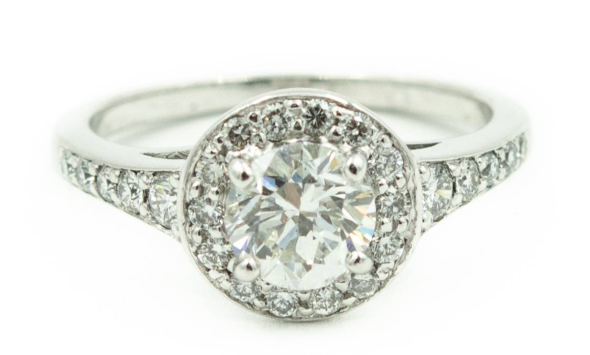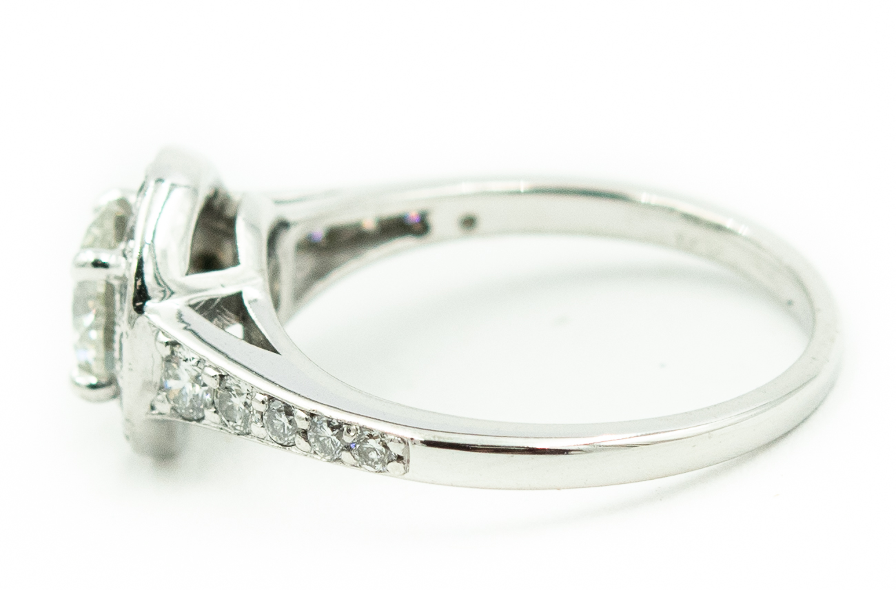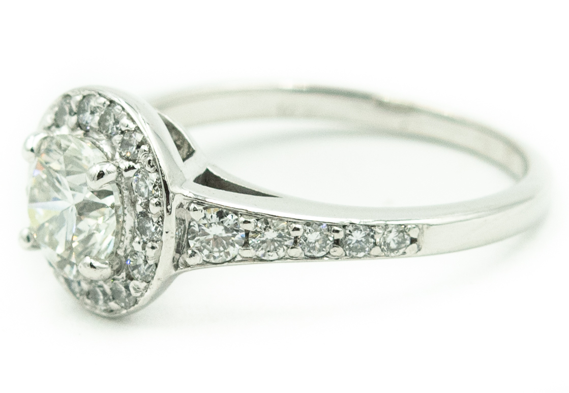 Estate White Gold and Diamond Engagement Ring; 14k white gold; 2.10dwt/3.20g; 1 brilliant cut diamond 0.94cts; 24 diamonds 0.35cts; Total Diamond Weight 1.29cts; Ring Size 6 1/2
