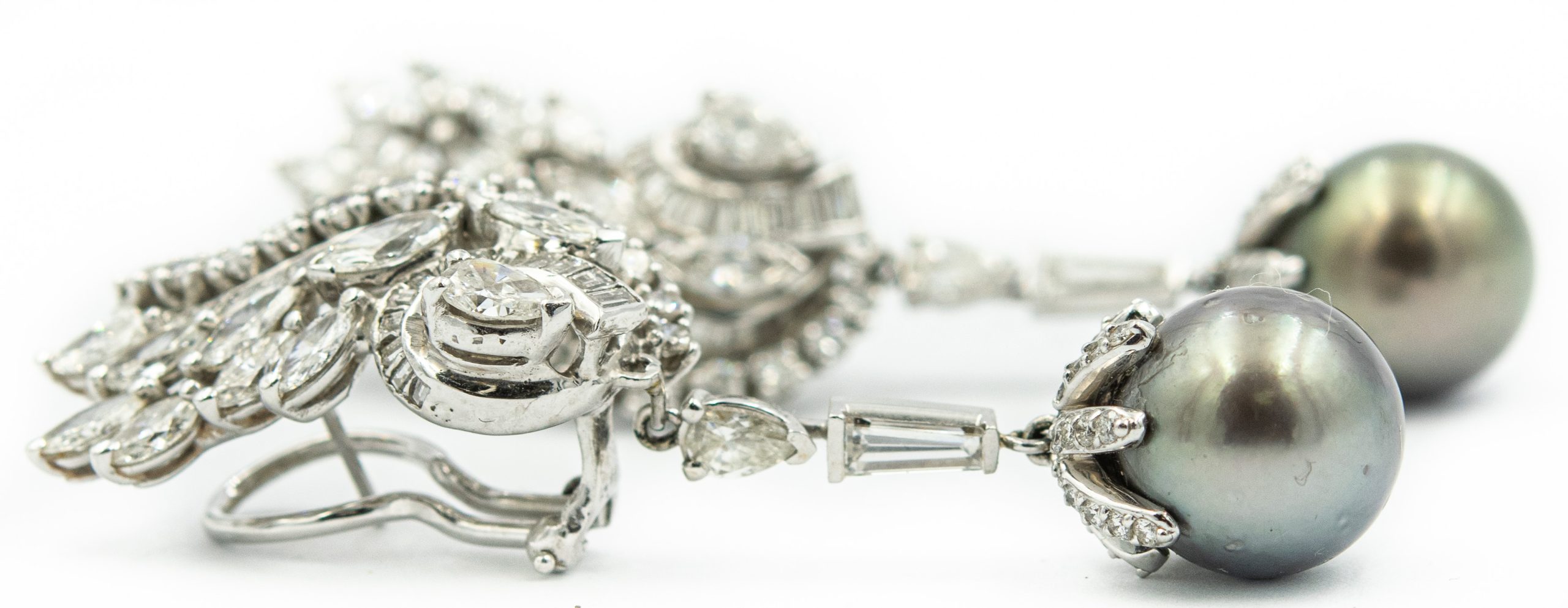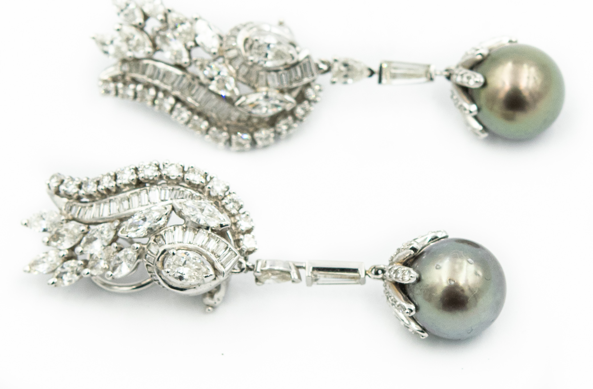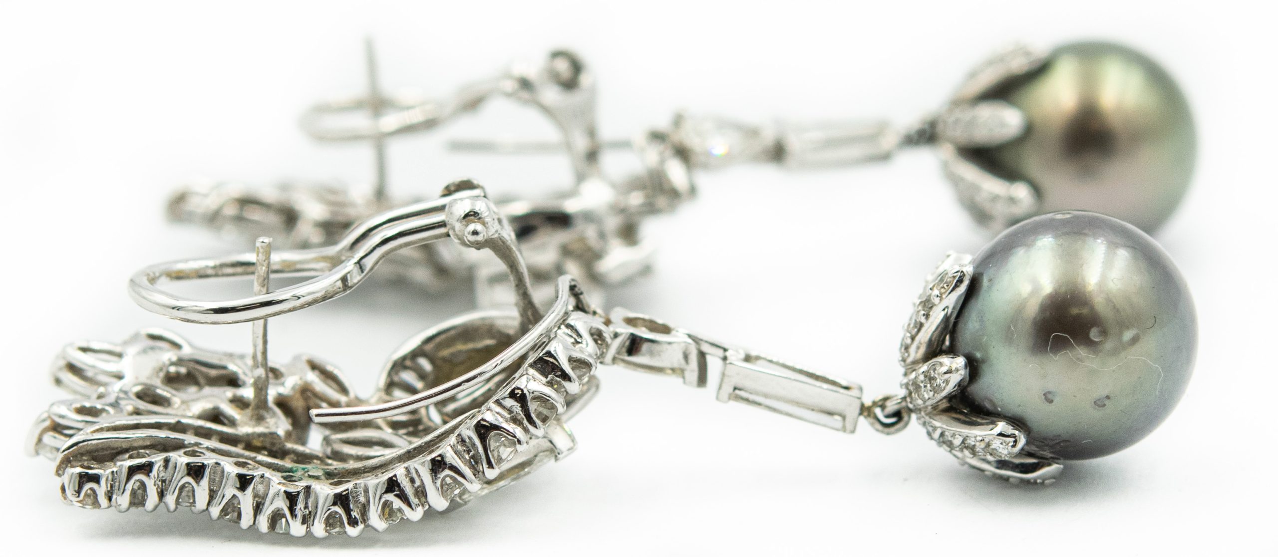 Estate White Gold Diamond and Black Cultured Pearl Day/Night Ear Pendants; 14k white gold; 17.10dwt/27.0g; 2 Grey Tahitian pearls 12.15mml 184 brilliant cut diamonds 9.50cts