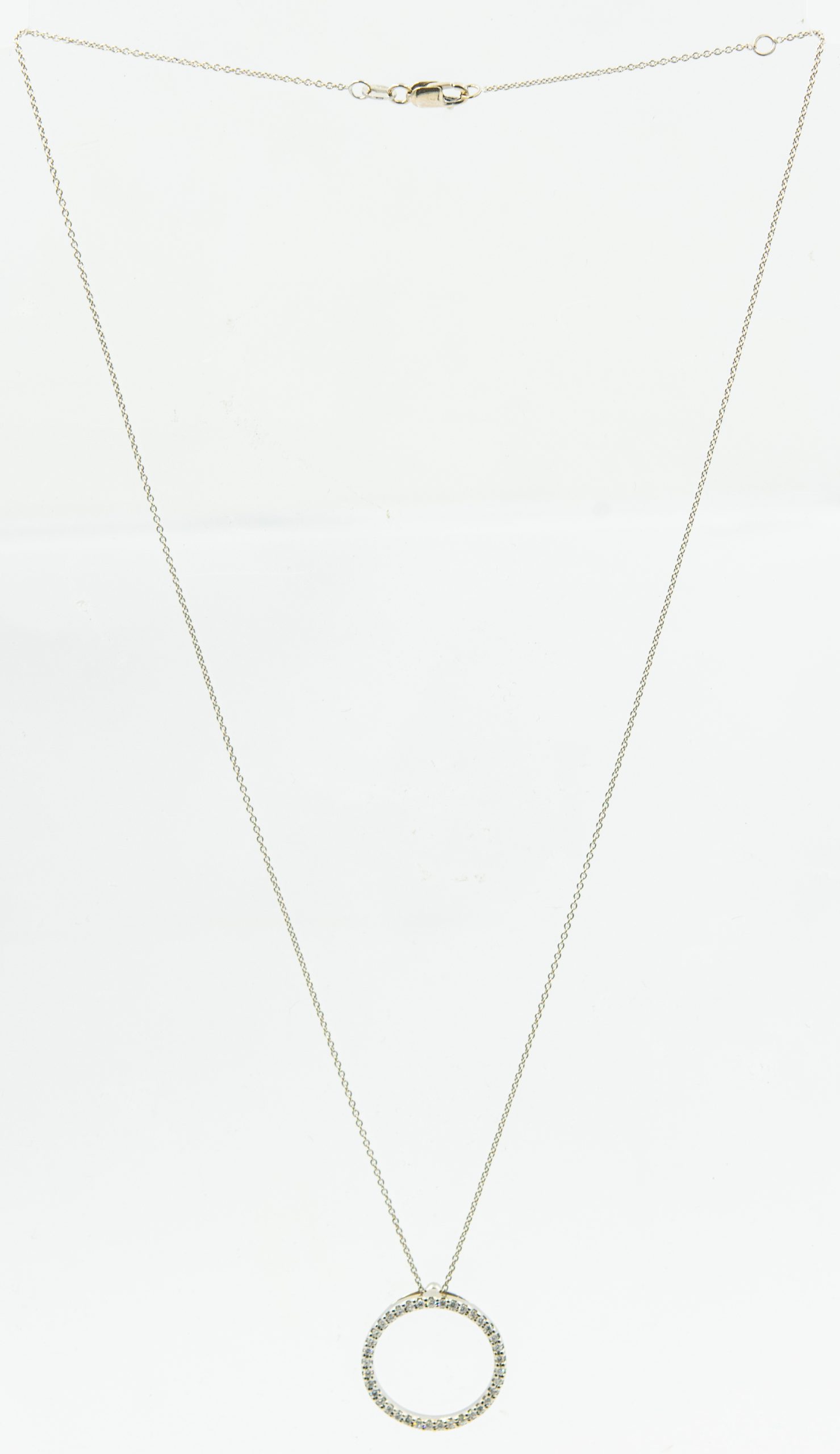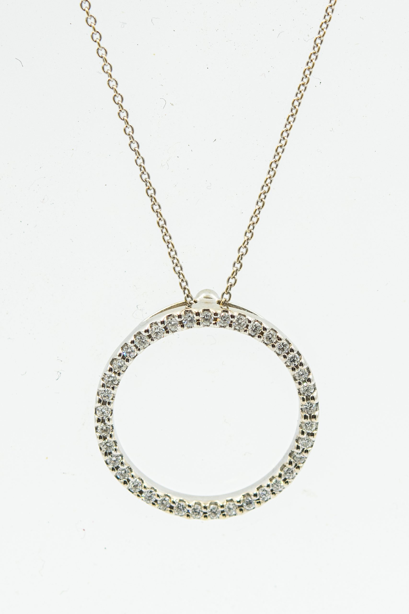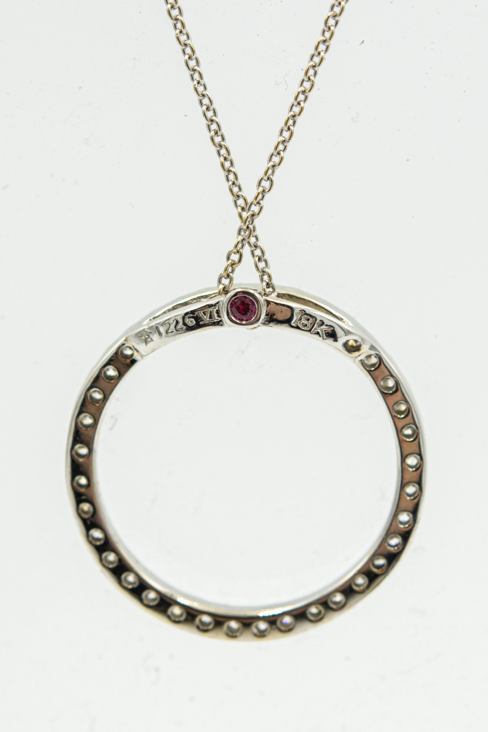Estate White Gold and Diamond Circle of Life Pendant/Necklace by Roberto Coin. The necklace is framed with 37 round brilliant cut diamonds weighing .75cts combined. The necklace is 18k white gold and weighs 2.50dwt/3.90g and measures 18".
