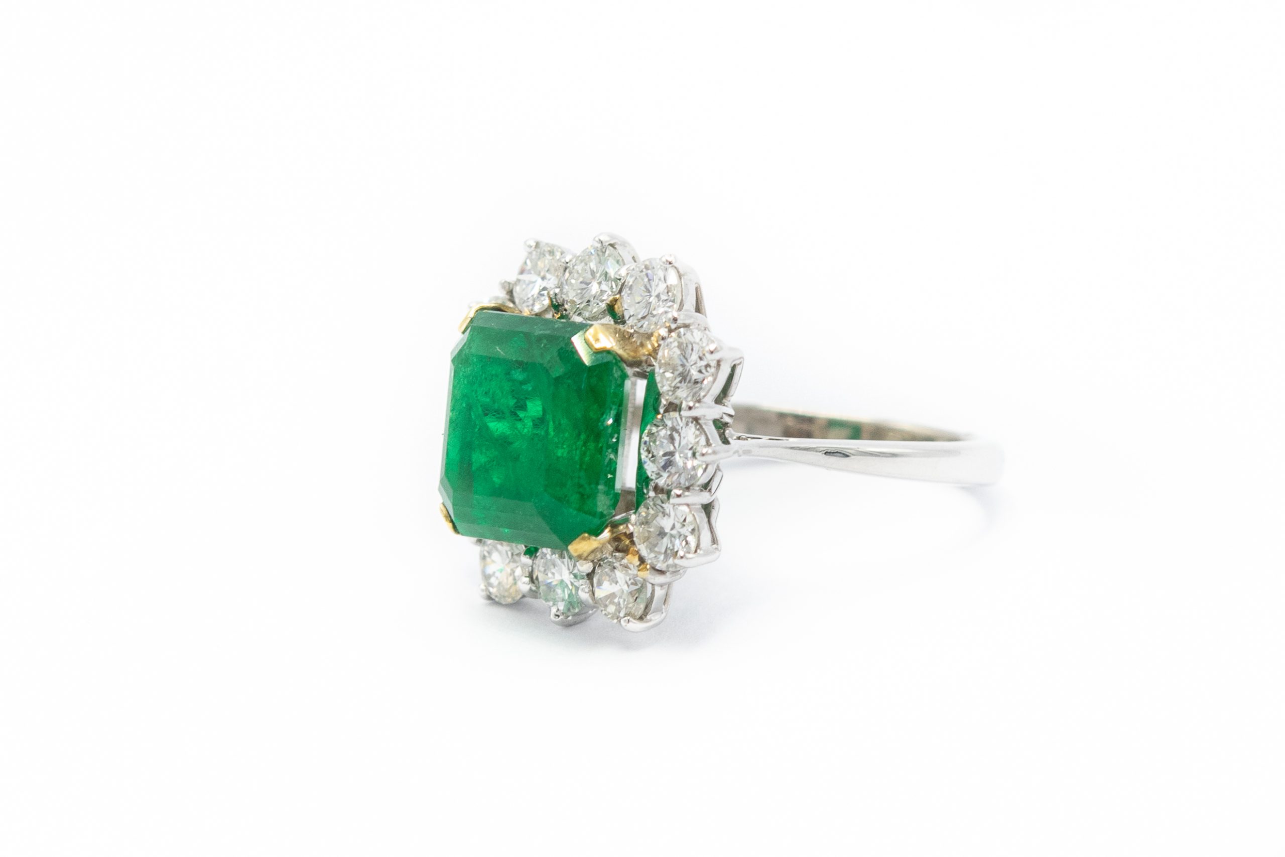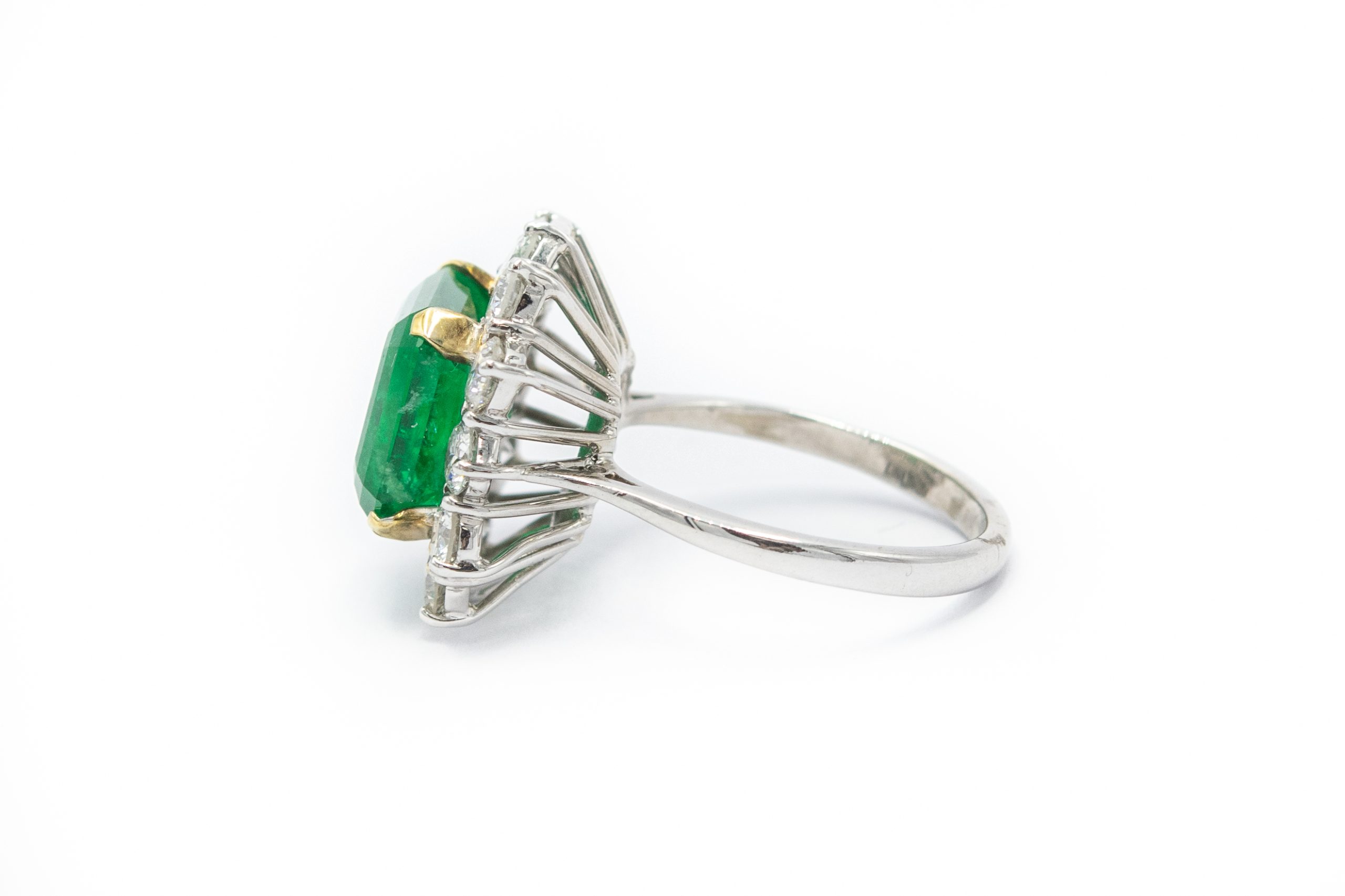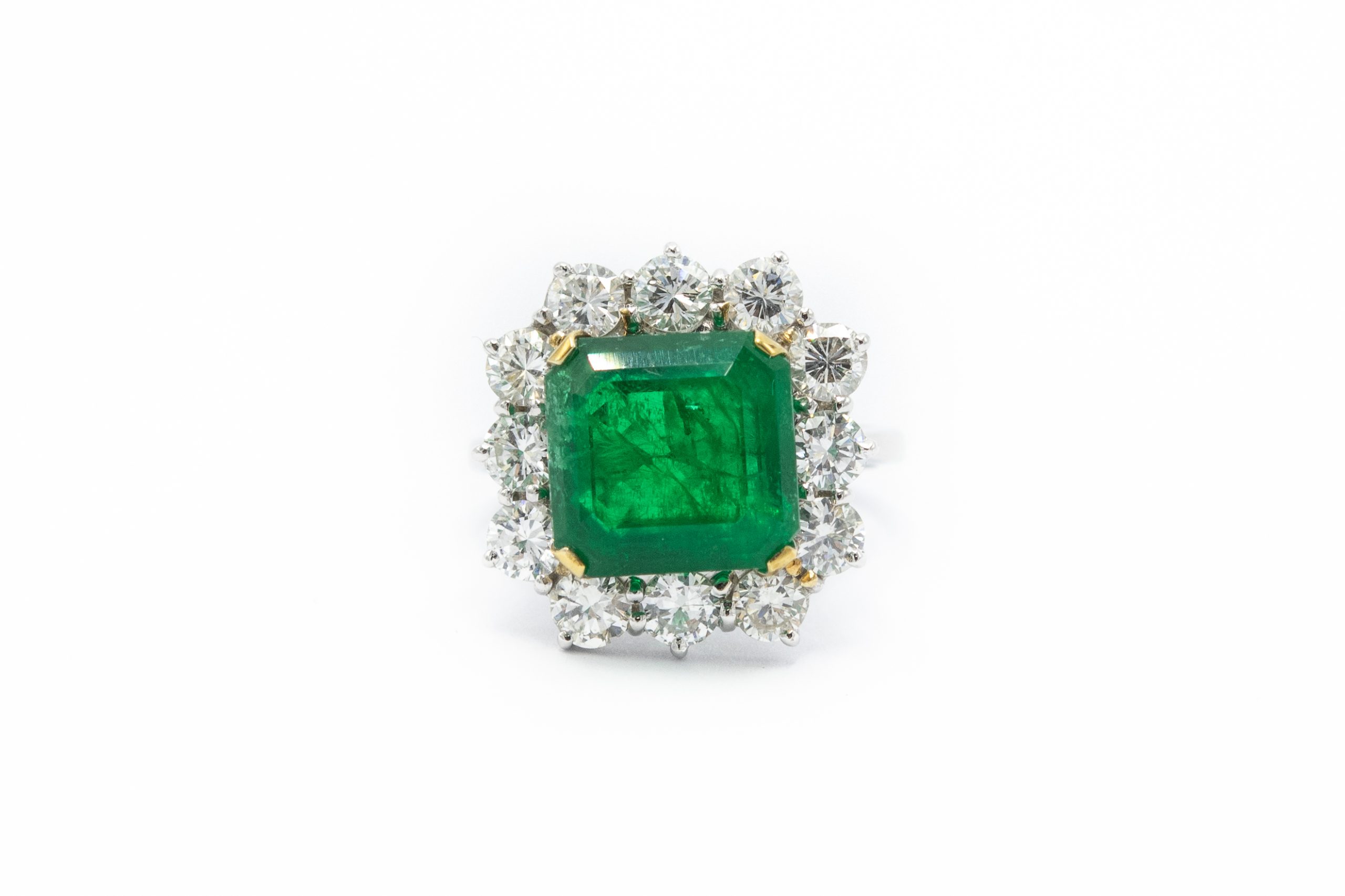 Estate White Gold Emerald and Diamond Ring: AGL Document No. 1110724; 18k white gold; 4.8dwt/7.46g; 12 round brilliant cut diamonds 2.50cts; 1 center natural beryl square cut emerald 5.72cts; Ring Size 7 1/4
