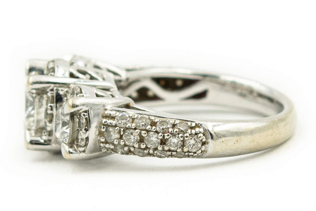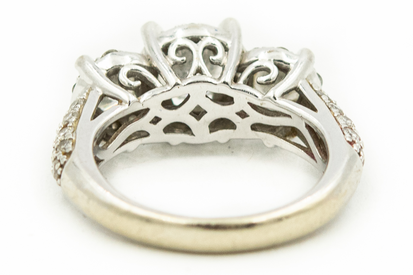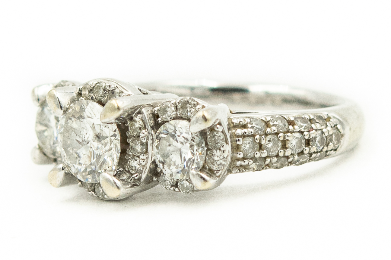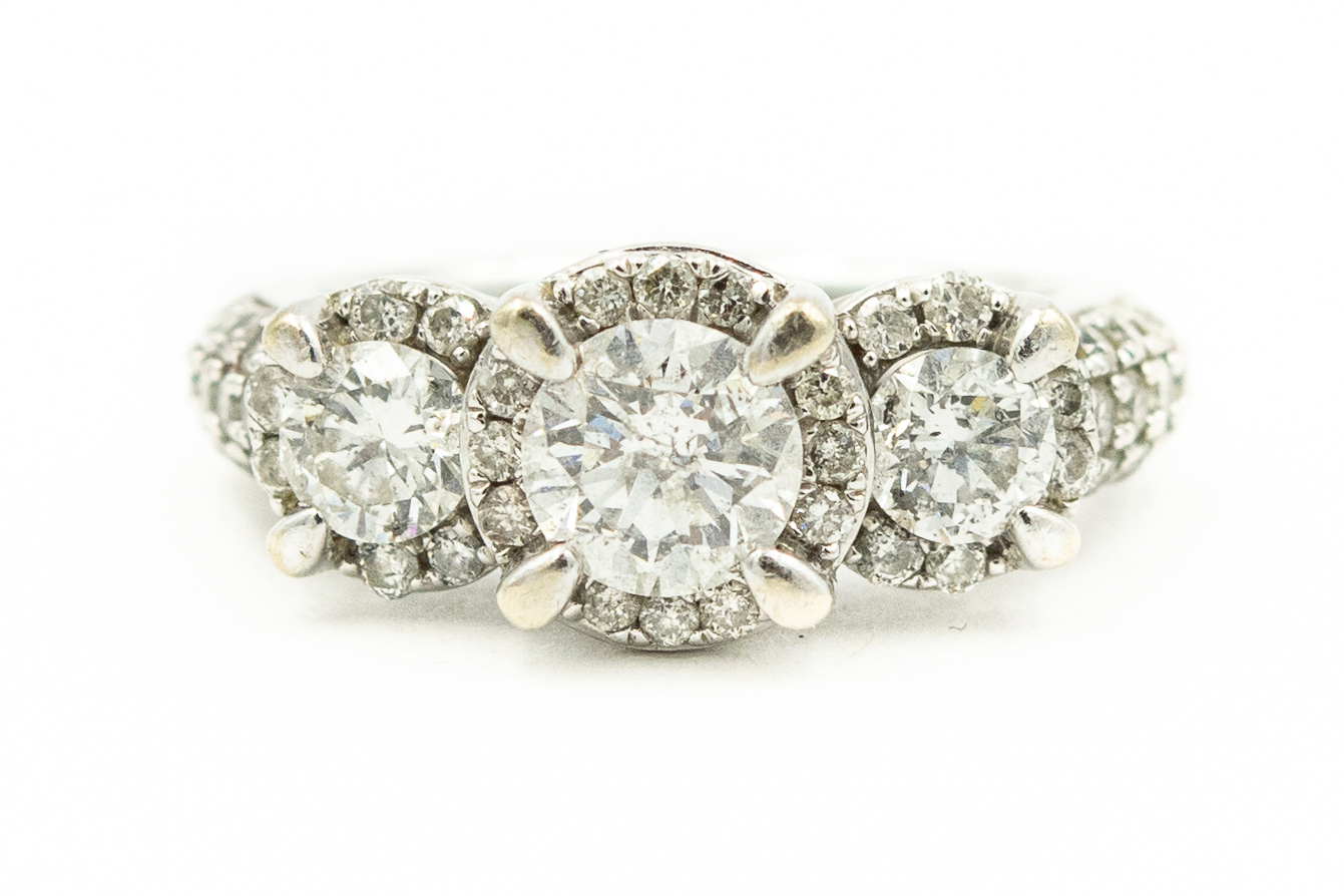 Estate White Gold Three Stone Diamond Engagement Ring; 14k white gold; 3.40dwt/5.30g; 3 brilliant cut diamonds 1.25cts; 50 diamonds 0.50cts; Total Diamond Weight 1.75cts; Ring Size 4 1/2