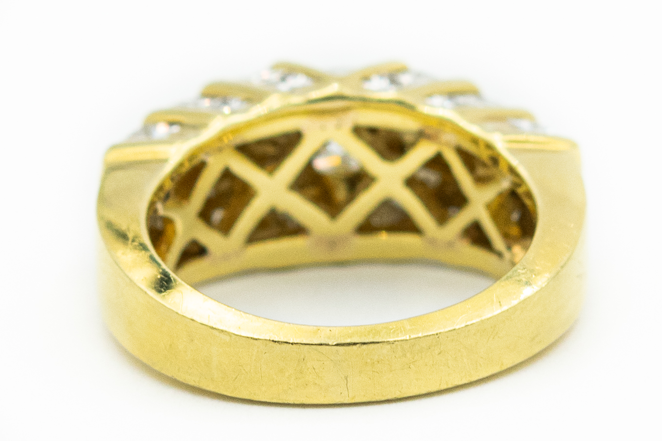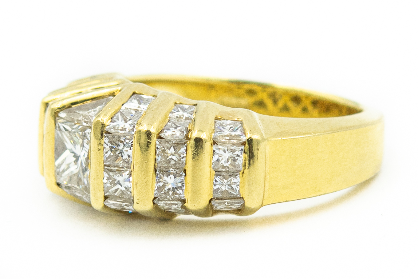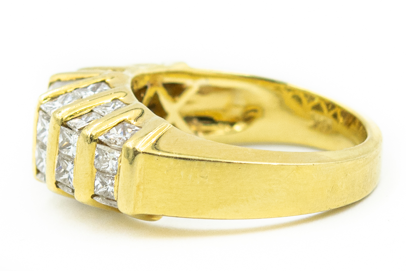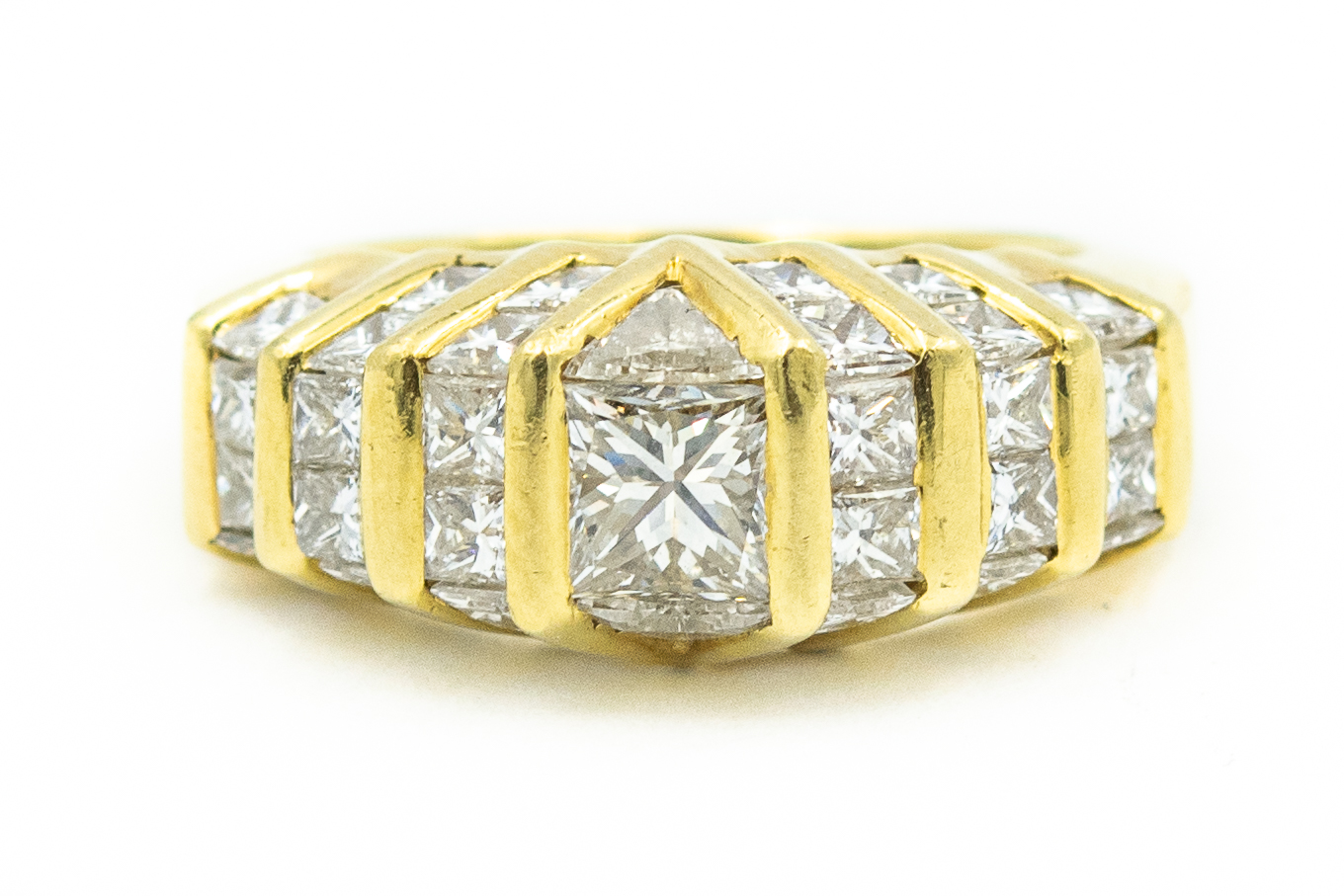 Estate Yellow Gold and Quadrillion Diamond Band; 18k yellow gold; 8.20dwt/12.70g; 1 center quadrillion brilliant cut diamond weighing 1.02cts; 32 quadrillion and 2 trillion cut diamonds weighing approximately 4.00cts; Total Diamond Weight 5.02cts; Ring Size 6 1/2