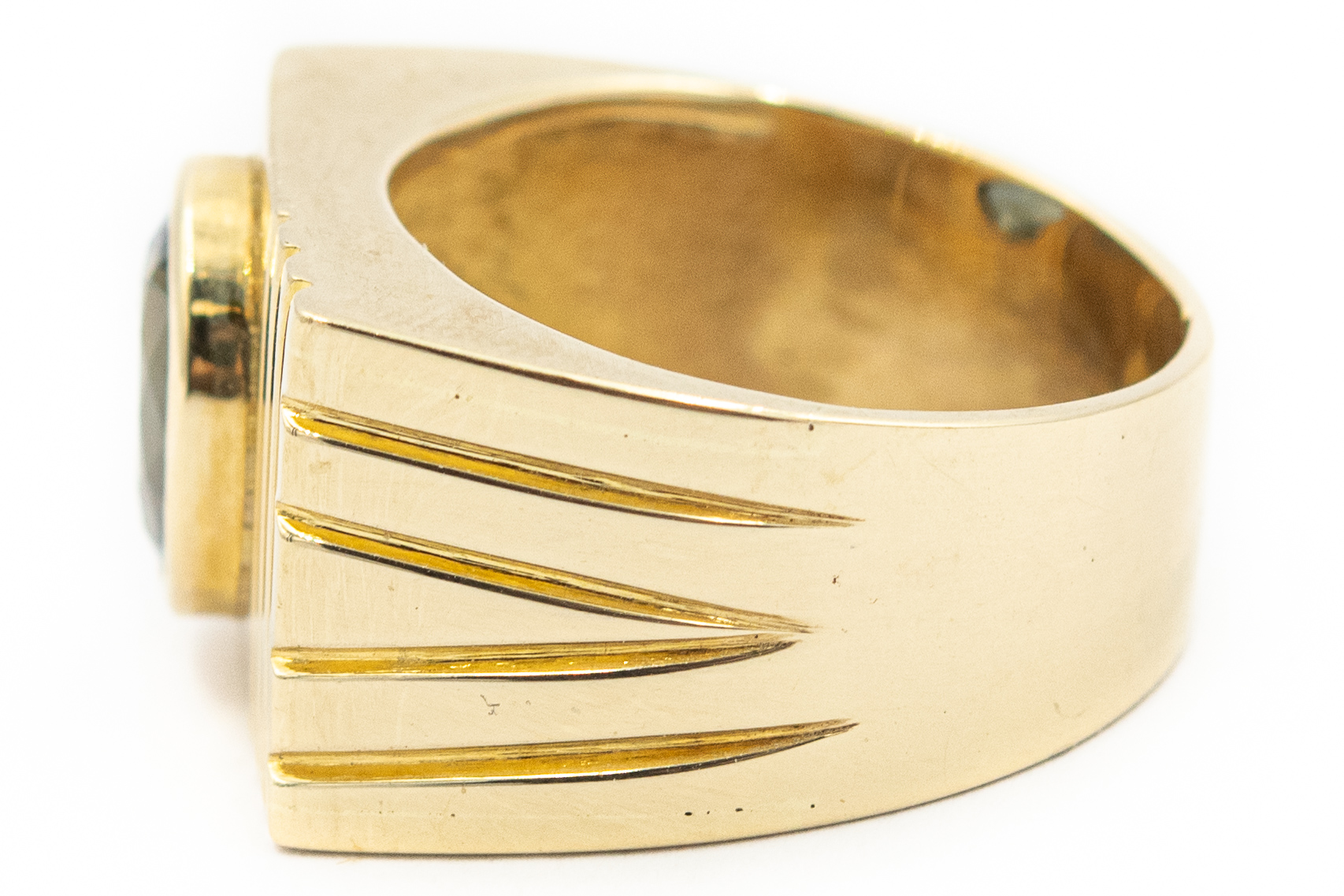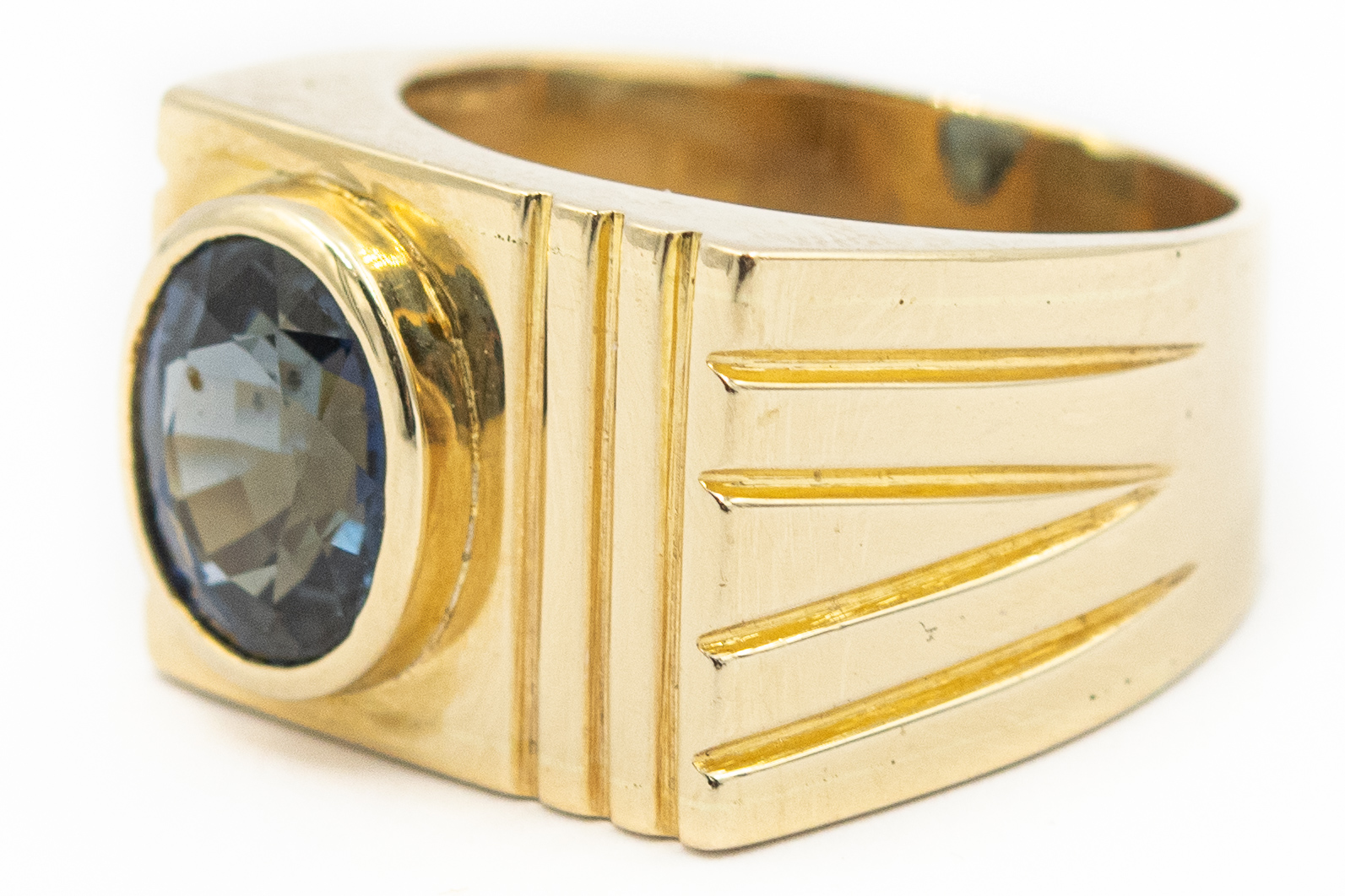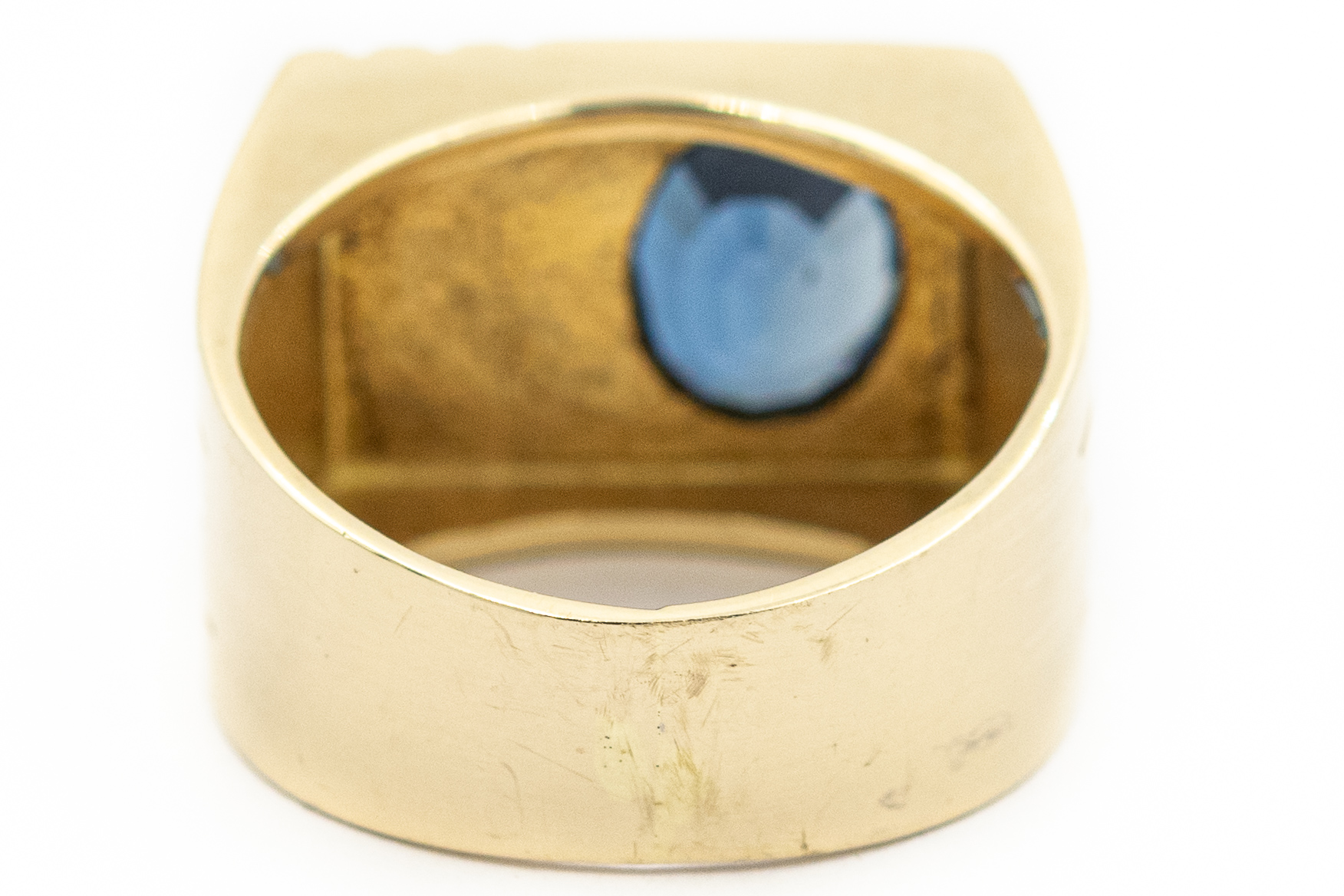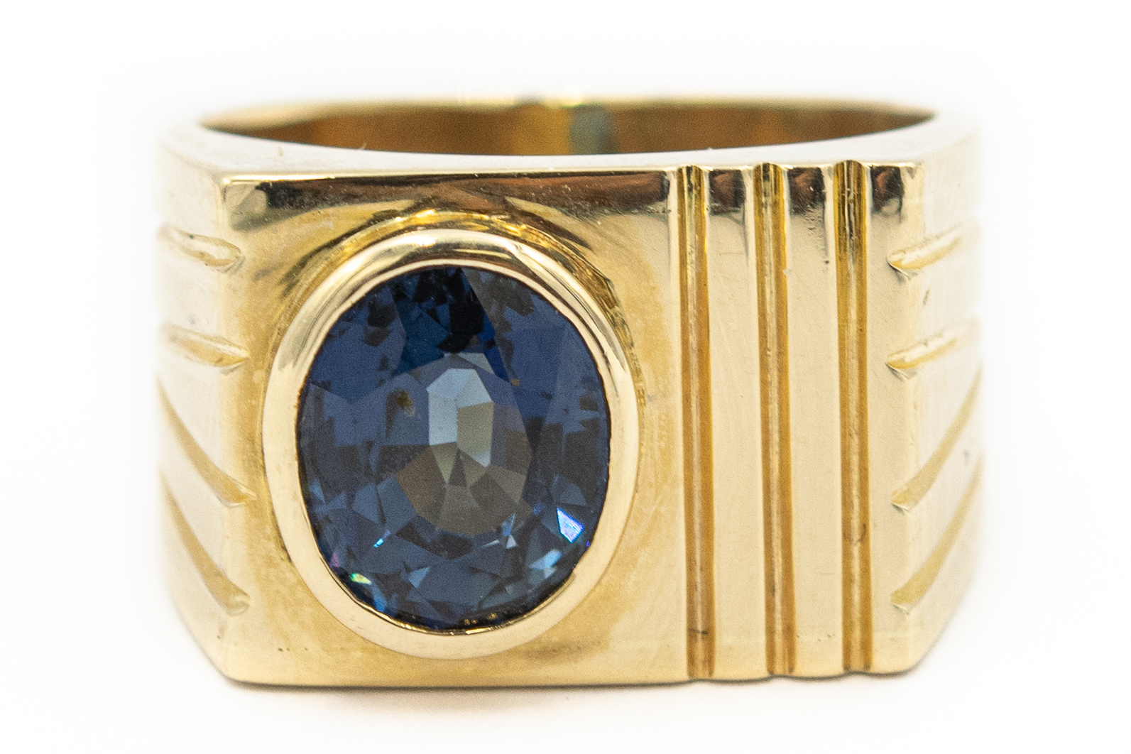 Estate Yellow Gold and Sapphire Ring; 14k yellow gold; 9.50dwt/14.80g; oval cut sapphire 4.25cts; Ring Size 10