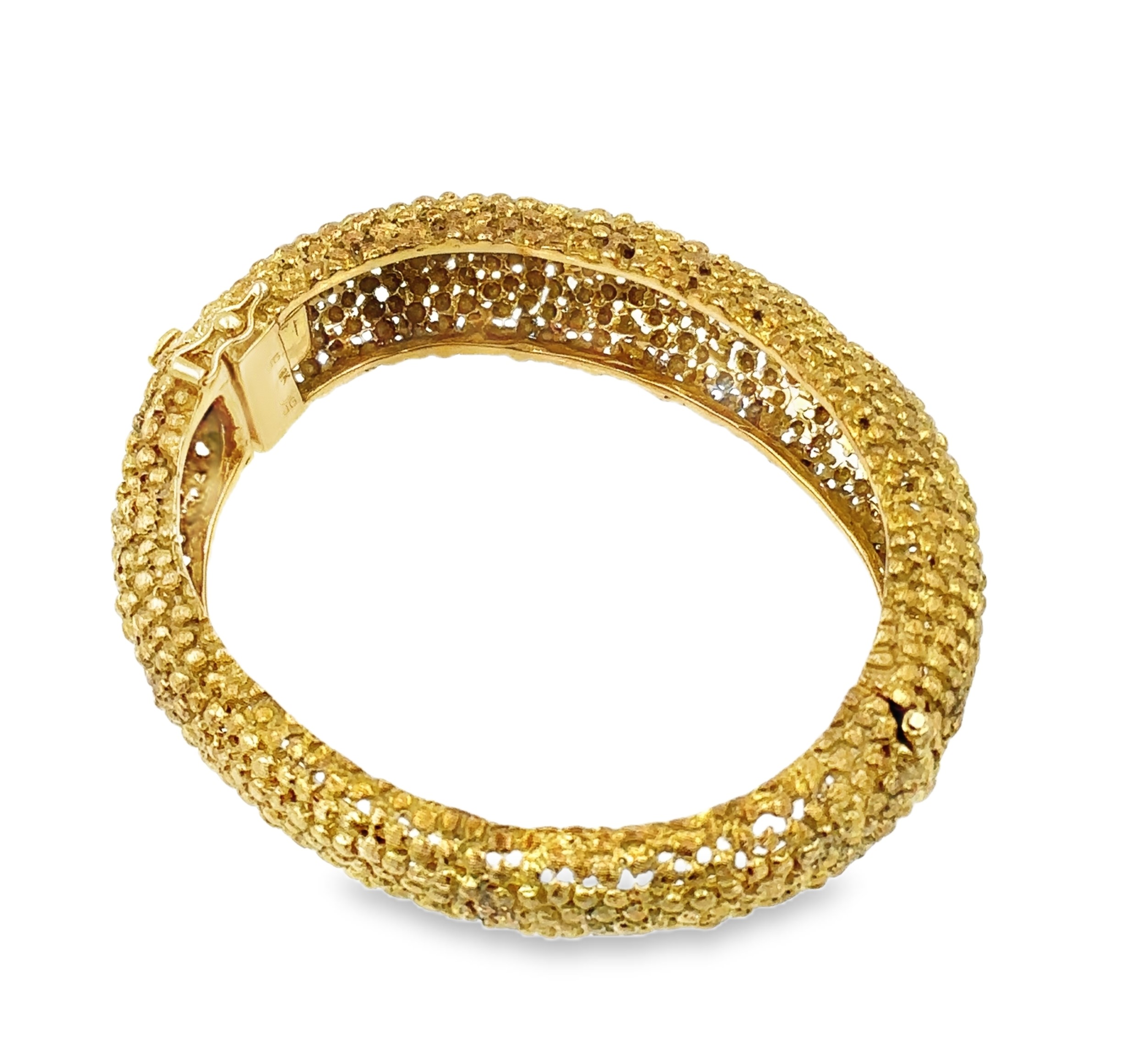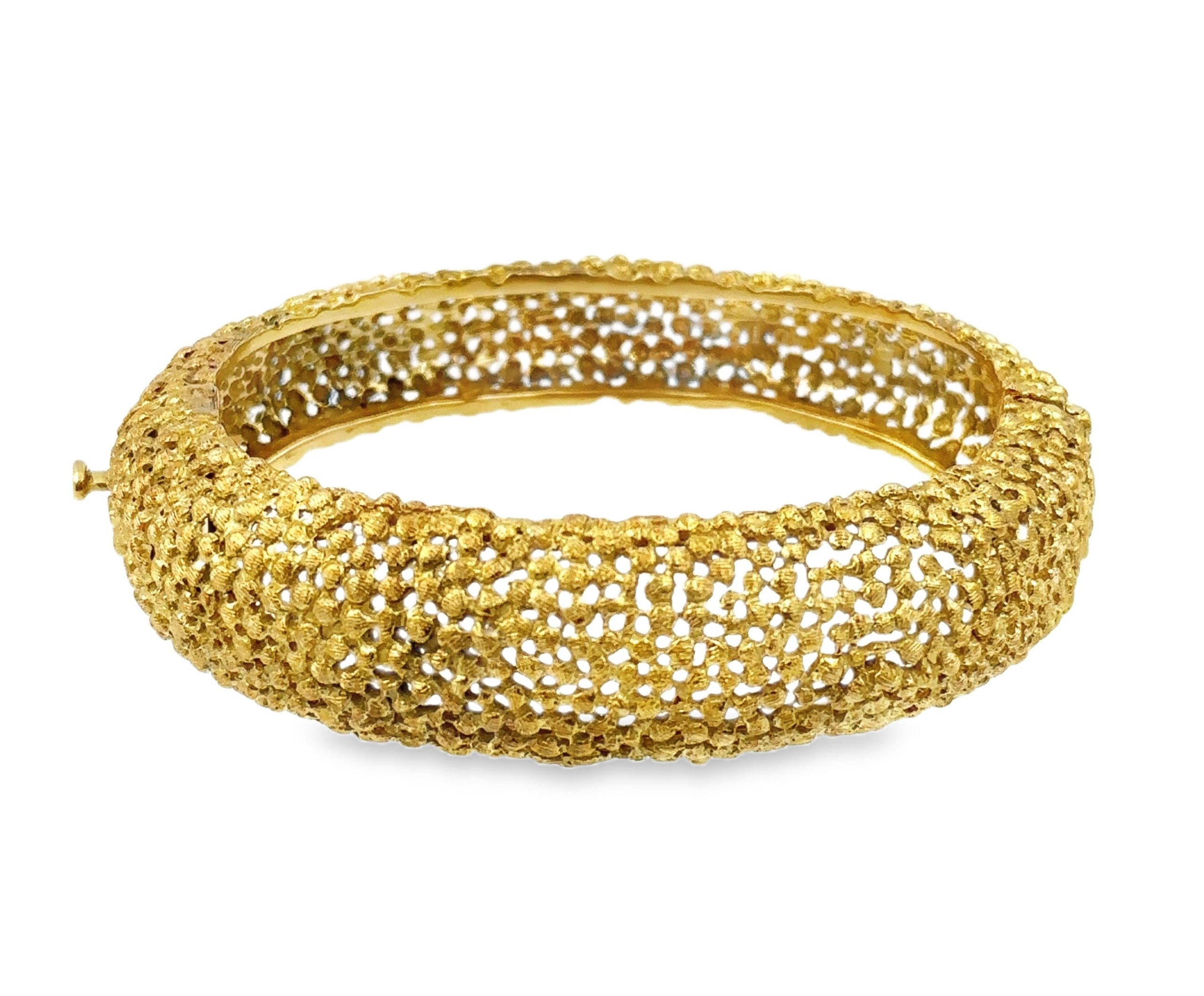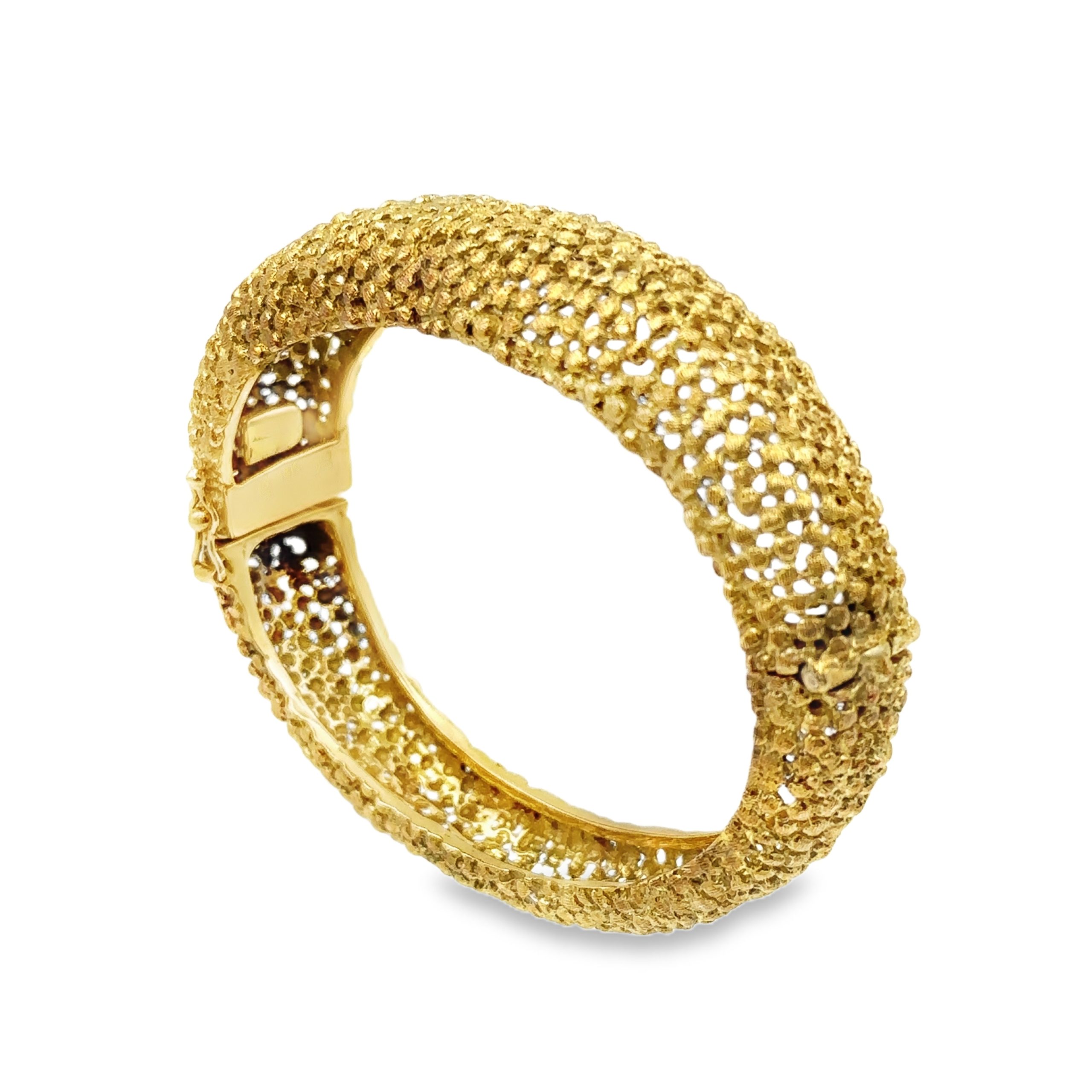 Estate Yellow Gold Brutalist Bangle Bracelet By JG Jack Gutschneider; 18k yellow gold; 34.10dwt53.00g; 6 1/2"; Signed on the clasp. Jack Gutschneider is a New York based jewelry designer. He produced pieces for a short period of 20 years from 1957 to 1975. His work featured an open work design.