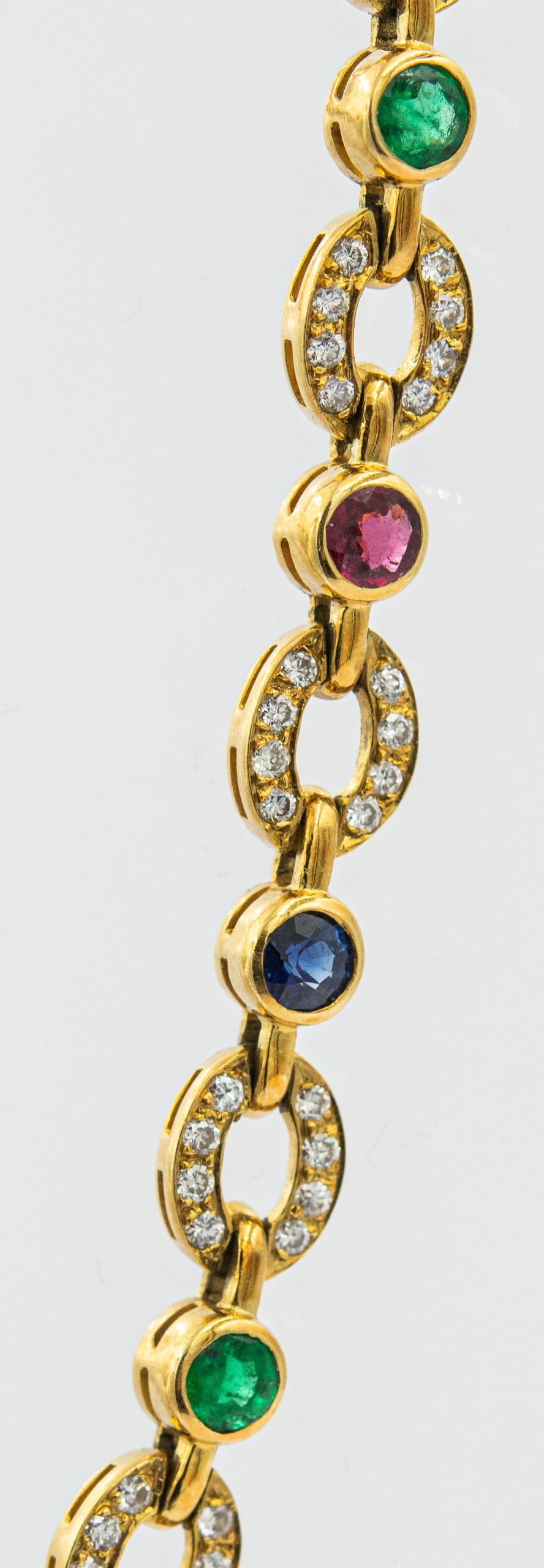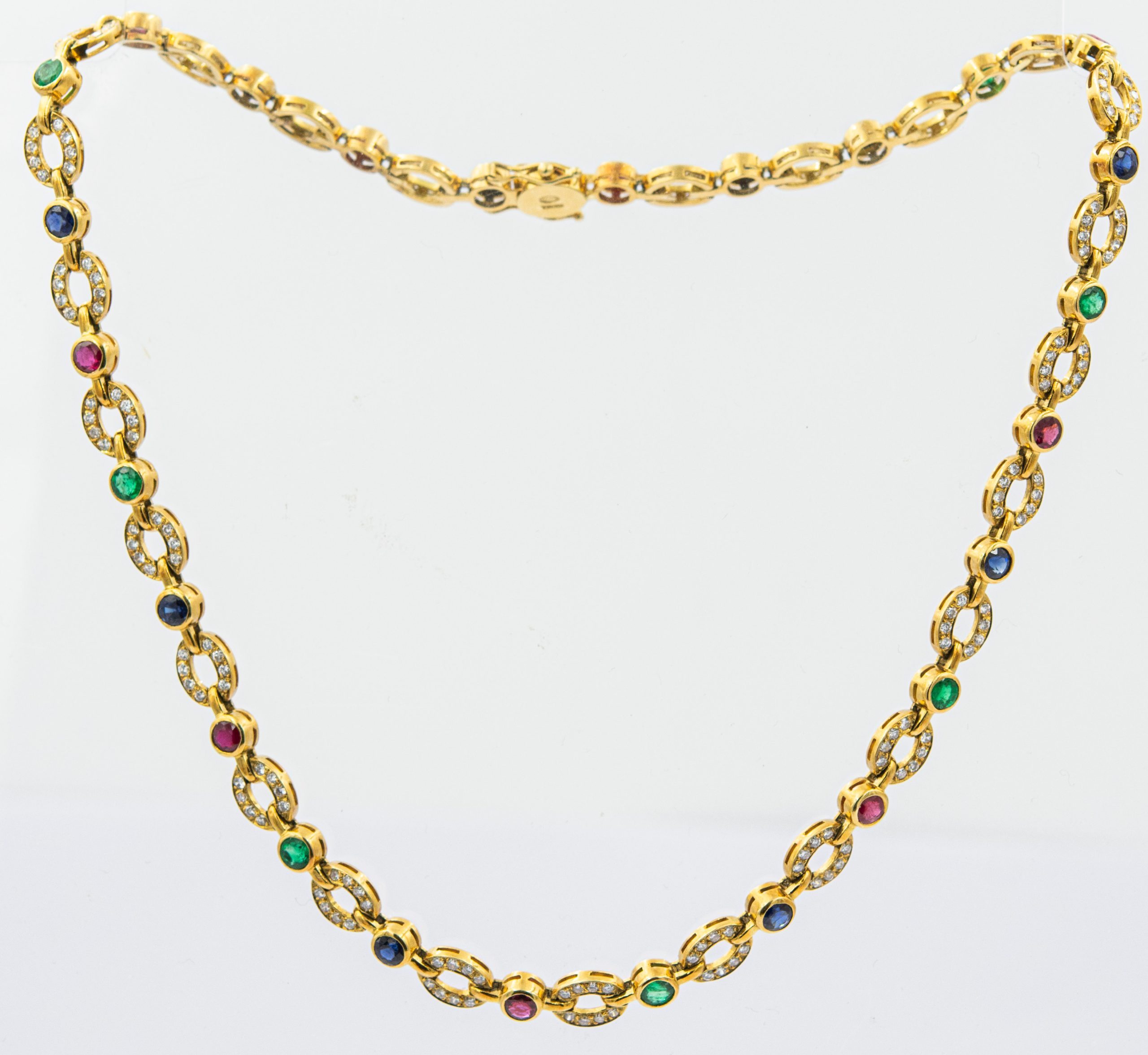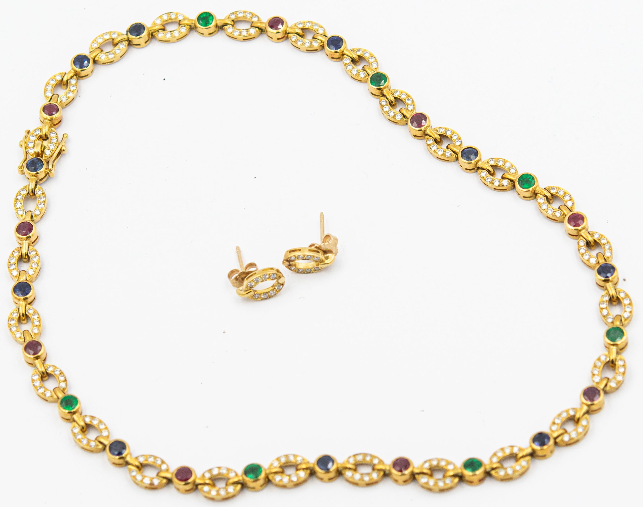 Estate Yellow Gold Diamond and Gemstone Necklace and Earrings Suite; 18k yellow gold; 20.30dwt/31.50g; 224 diamonds 4.00cts; 10 sapphires 3.50cts; 9 rubies 3.15cts; 7 emeralds 2.45cts;