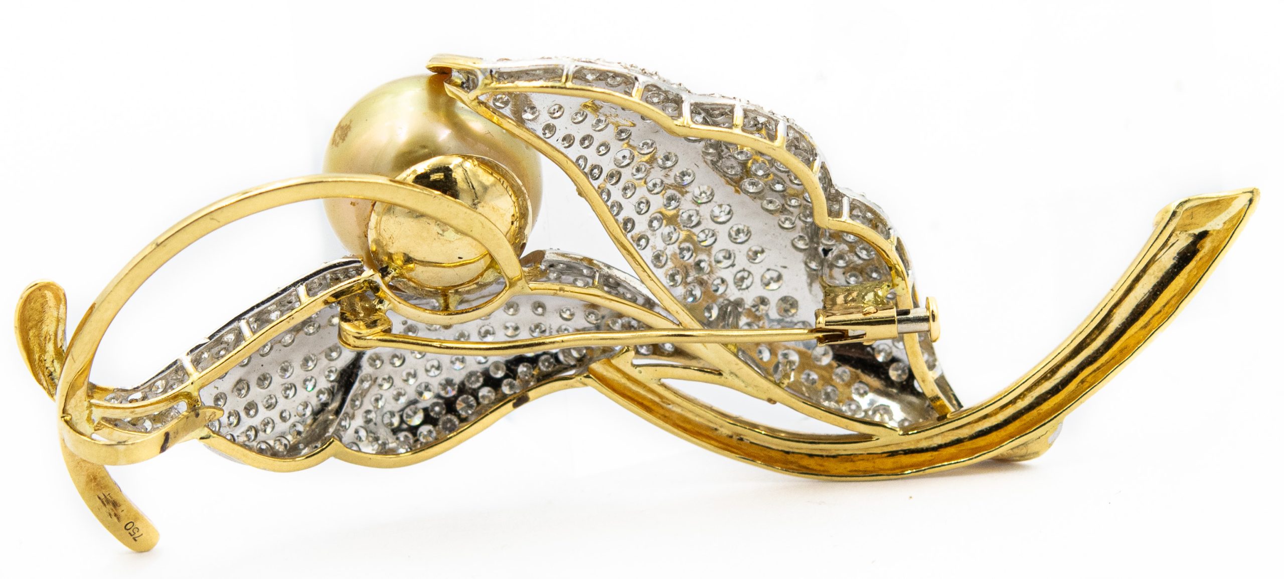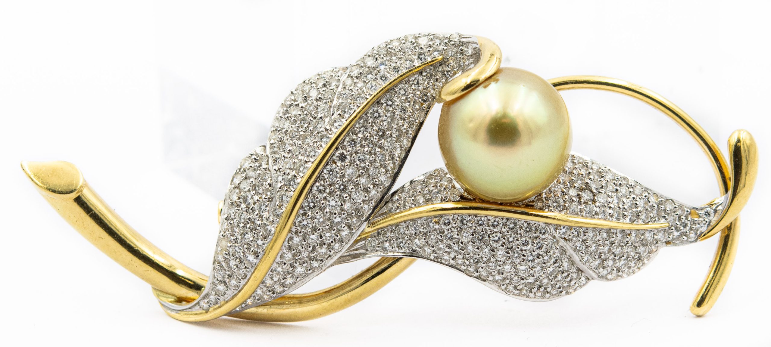 Estate Yellow Gold Diamond and Golden Pearl Leaf Motif Brooch; 18k yellow gold; 16.20dwt; round brilliant cut diamonds 4.12cts; gold pearl 15.10mm