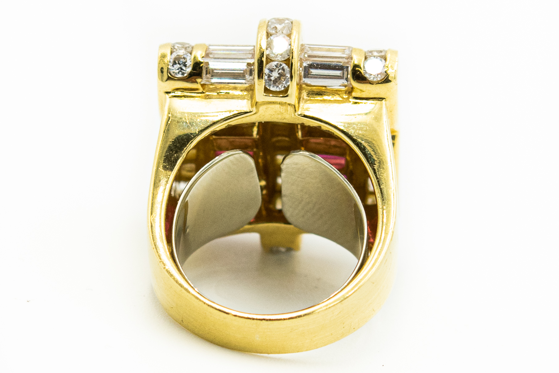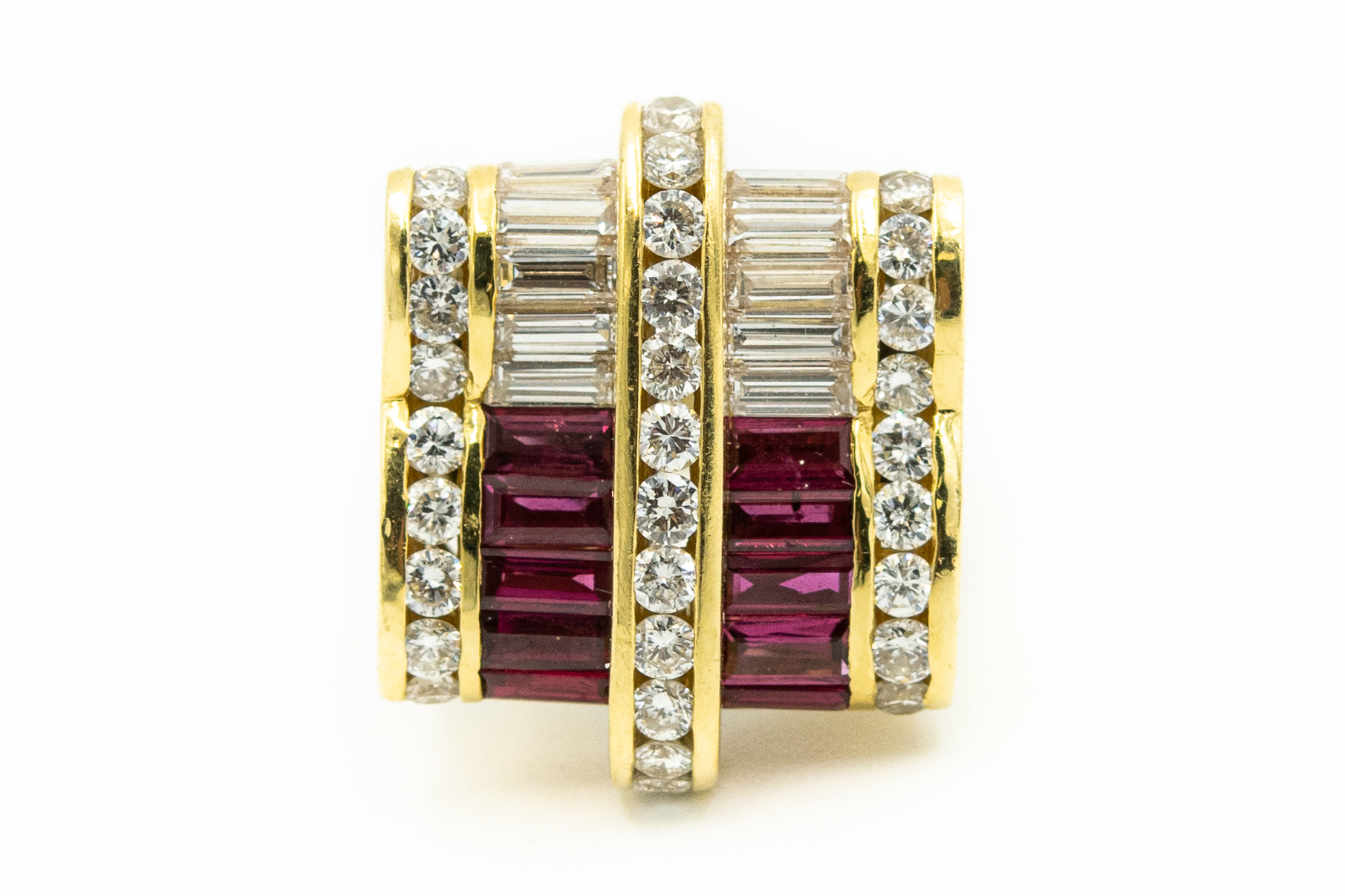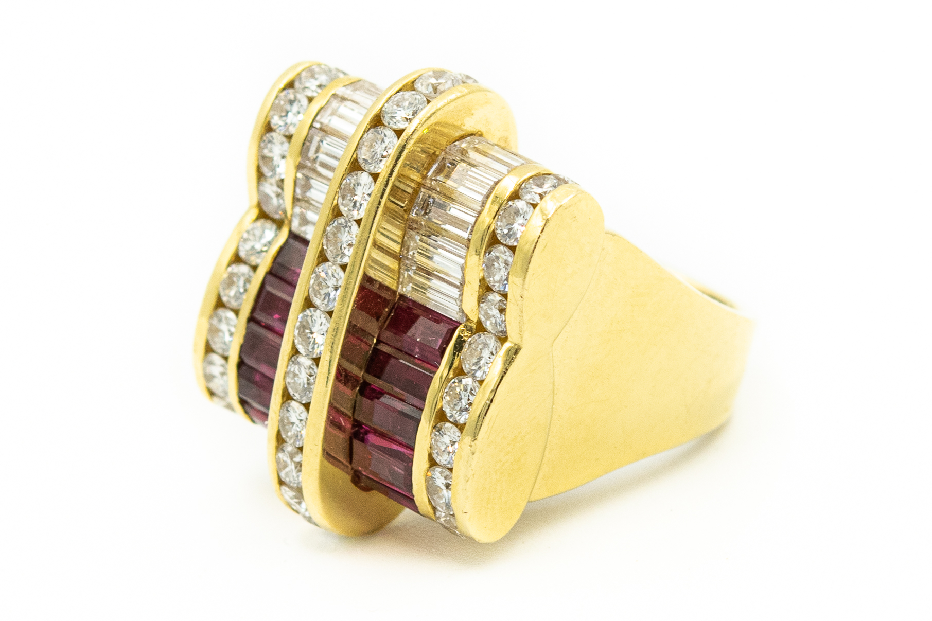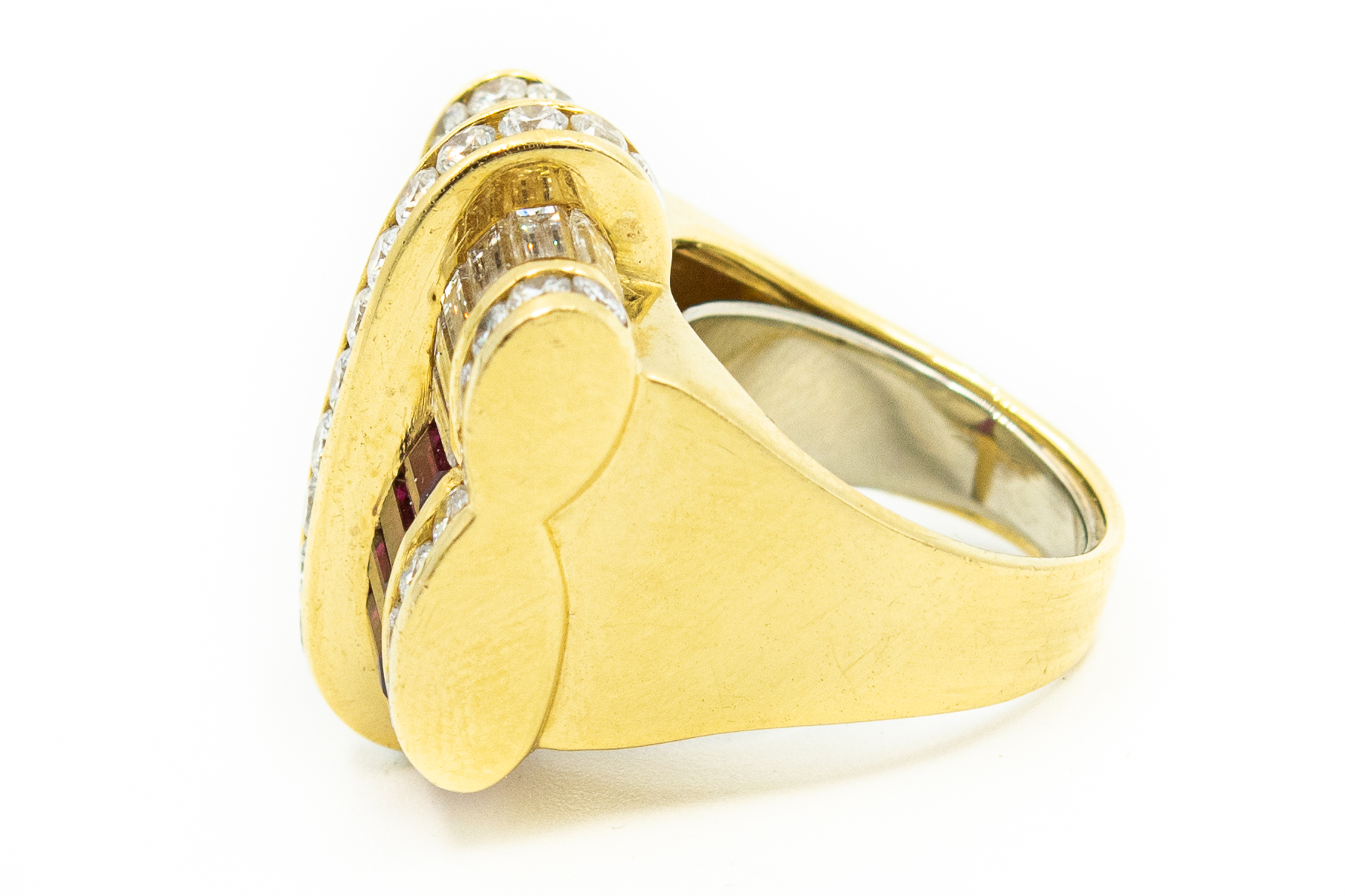 Estate Yellow Gold Diamond and Ruby Ribbon Ring by Charles Krypell Circa 1980s; 18k yellow gold; 16.50dwt/25.69g; 46 diamonds 4.18cts; 12 rubies 3.00cts; Ring Size 5 3/4