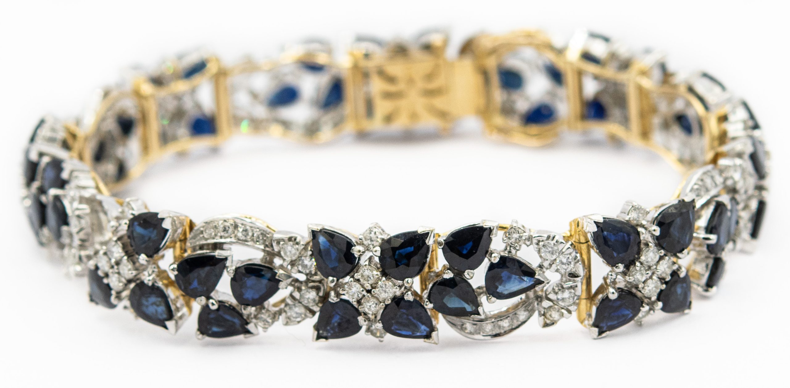 Estate Yellow Gold Diamond and Sapphire Bracelet; 14k yellow gold; 20.40dwt/31.80g; 120 brilliant cut diamonds 3.25cts; 56 sapphires 15.00cts; 7 1/8"
