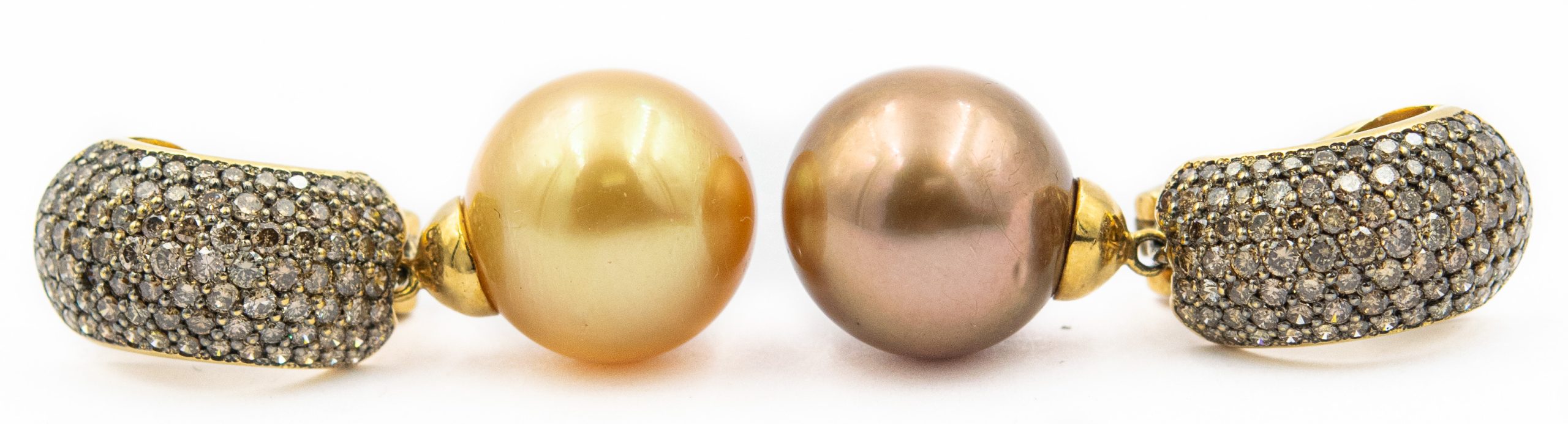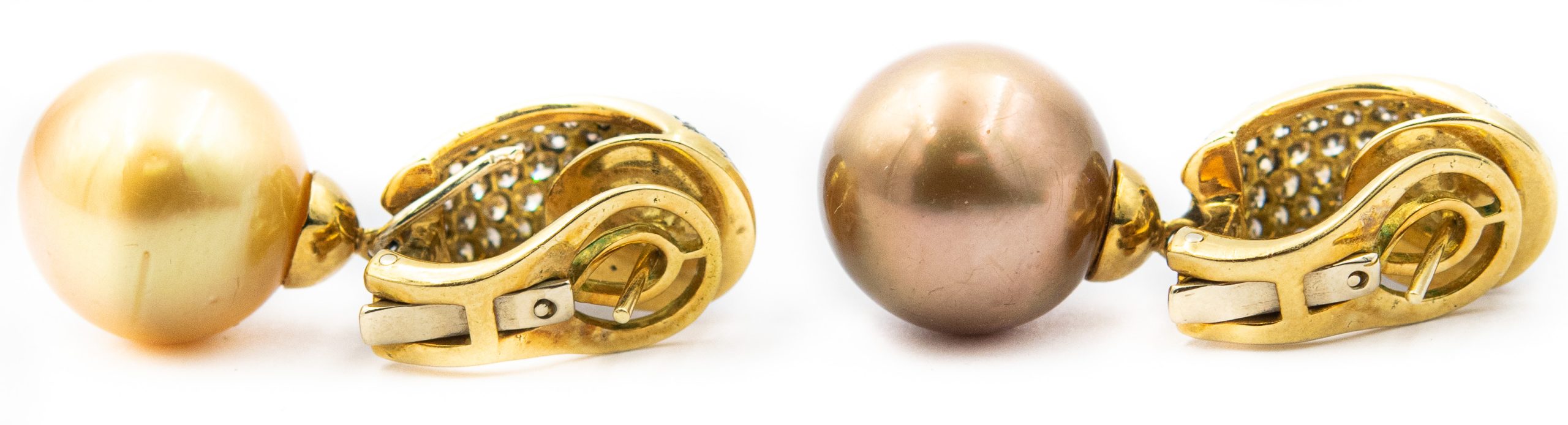 Estate Yellow Gold Diamond and South Sea Cultured Pearl Day/Night Ear Pendants; 18k yellow gold; 10.0dwt/15.5g; 172 diamonds 4.00cts; pearls 13.40mm