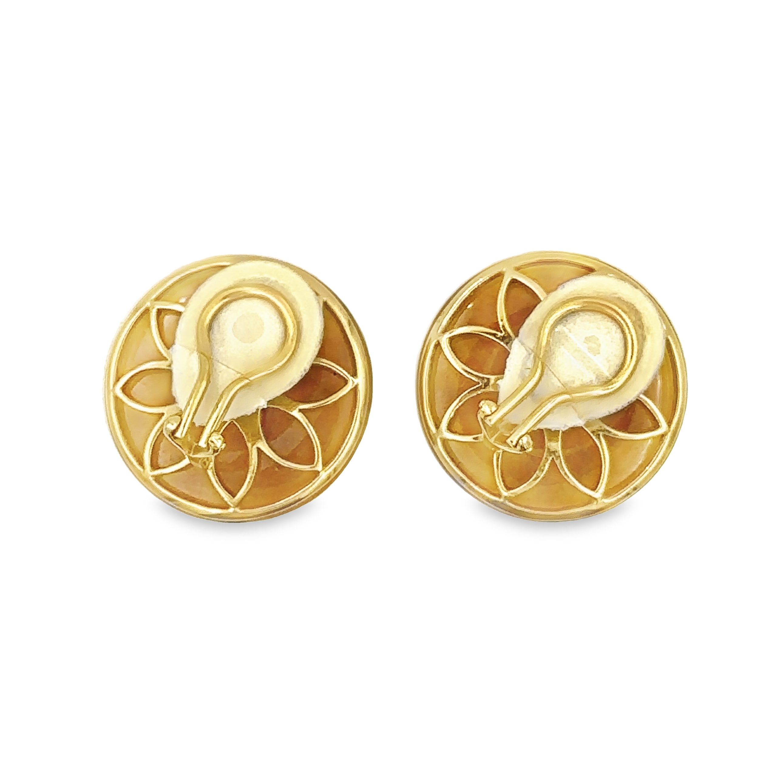 Estate Yellow Gold Nephrite Jade and Diamond Studded Flower Disk Earrings; 18k yellow gold; 14.50dwt/22.60g; 40 fancy yellow and colorless diamonds 0.50cts; jade disks measuring 26mm