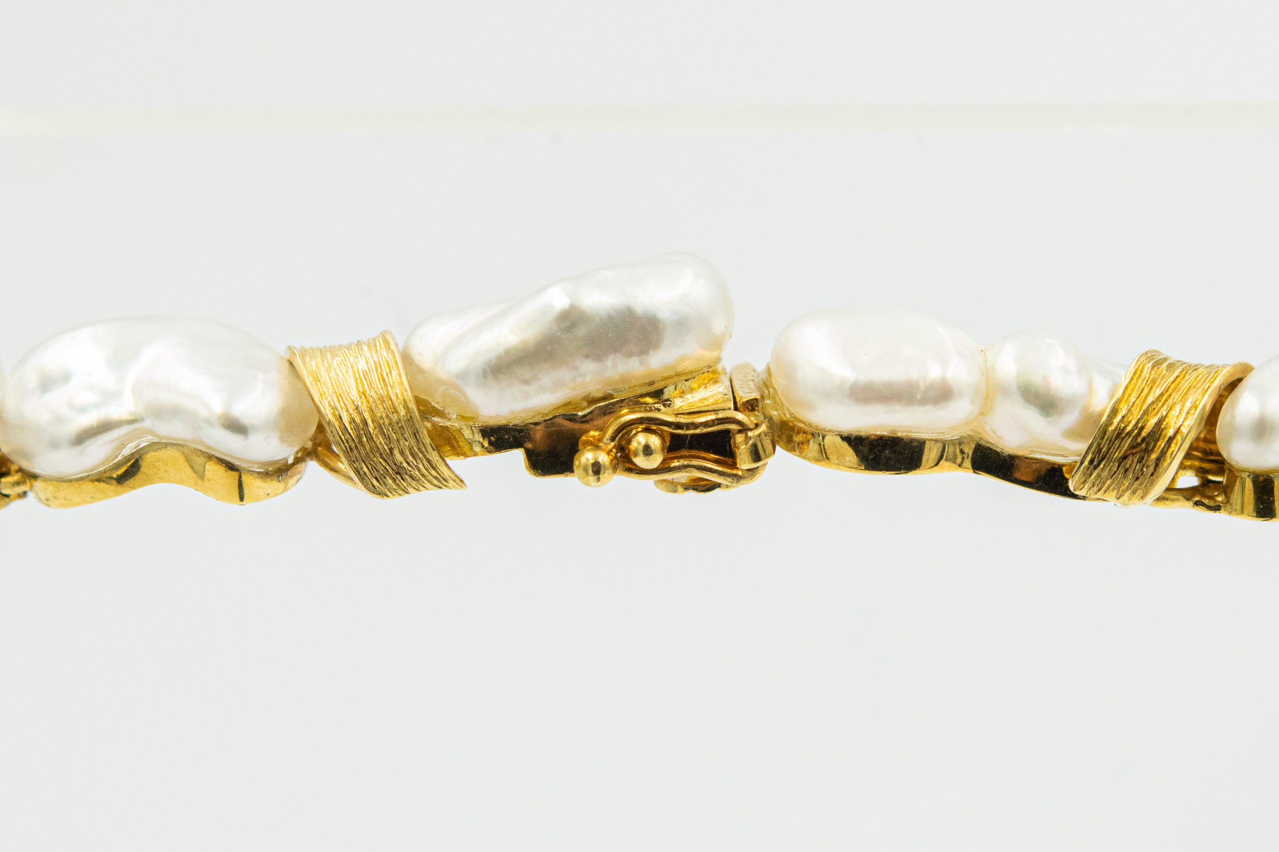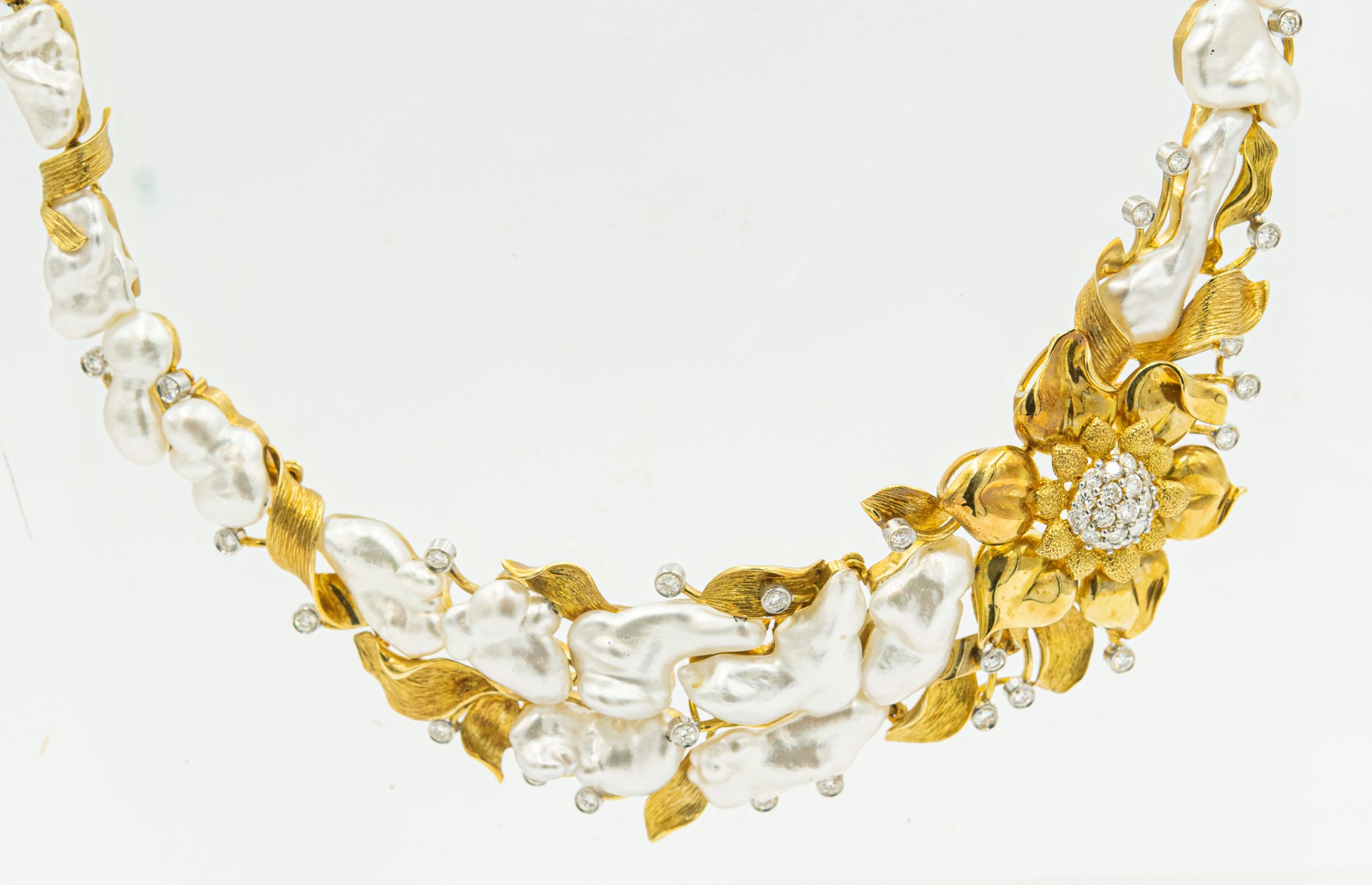 Estate Yellow Gold Pearl and Diamond Flower Necklace; 18k yellow gold; 64.1dwt/99.7g; 25 round brilliant cut diamonds 1.50cts; 19 round diamonds 1.25cts; Total Diamond Weight 2.75cts; 17"