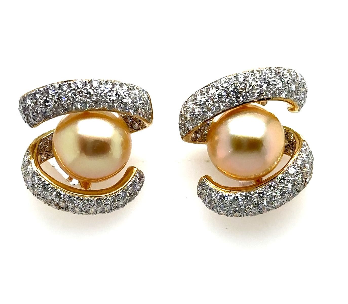 Estate Yellow Gold South Sea Gold Pearl and Diamond Earrings; 18k yellow gold; 16.20dwt/25.10g; 160 diamonds 5.00cts; pearls 13.0mm