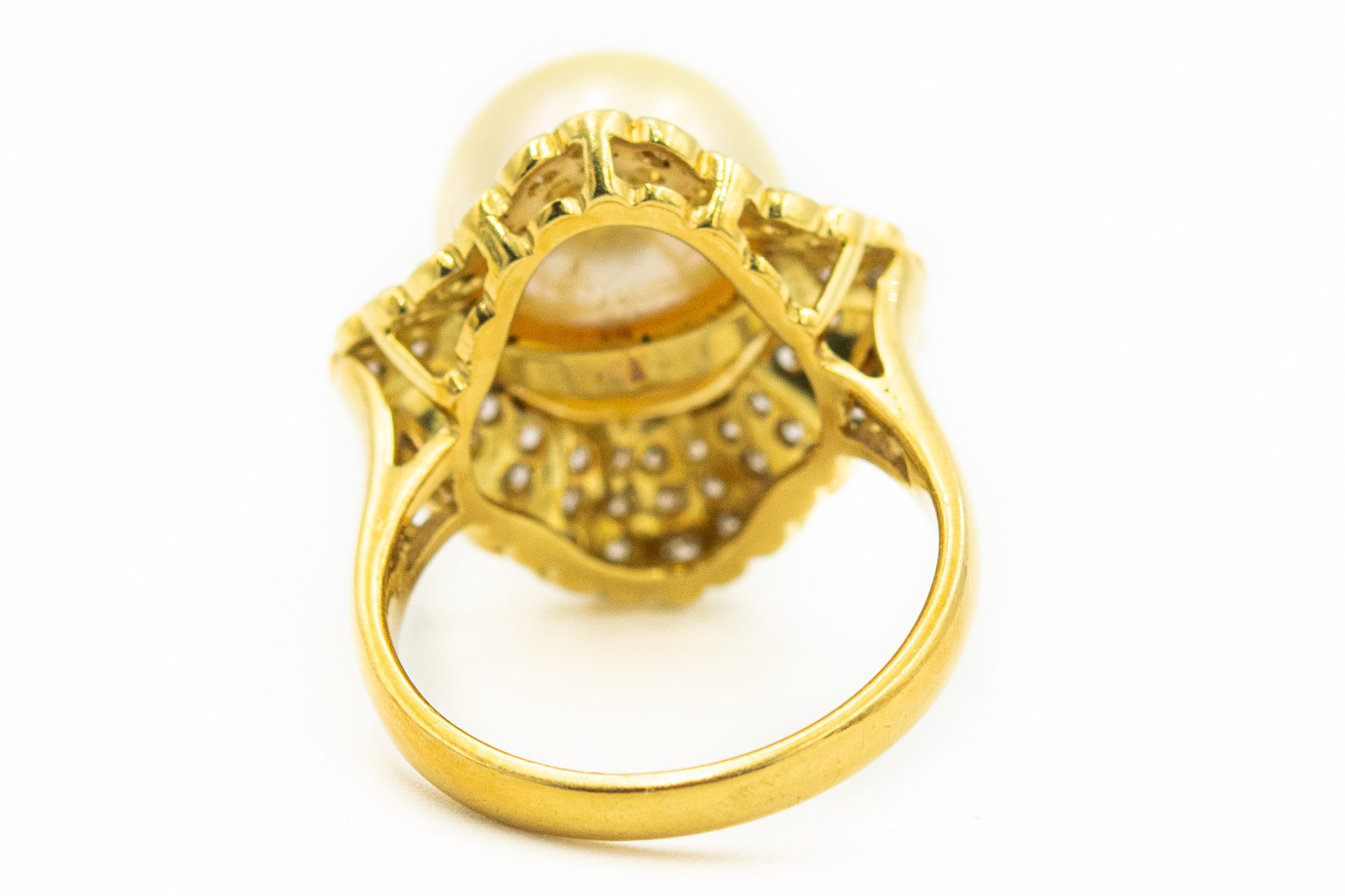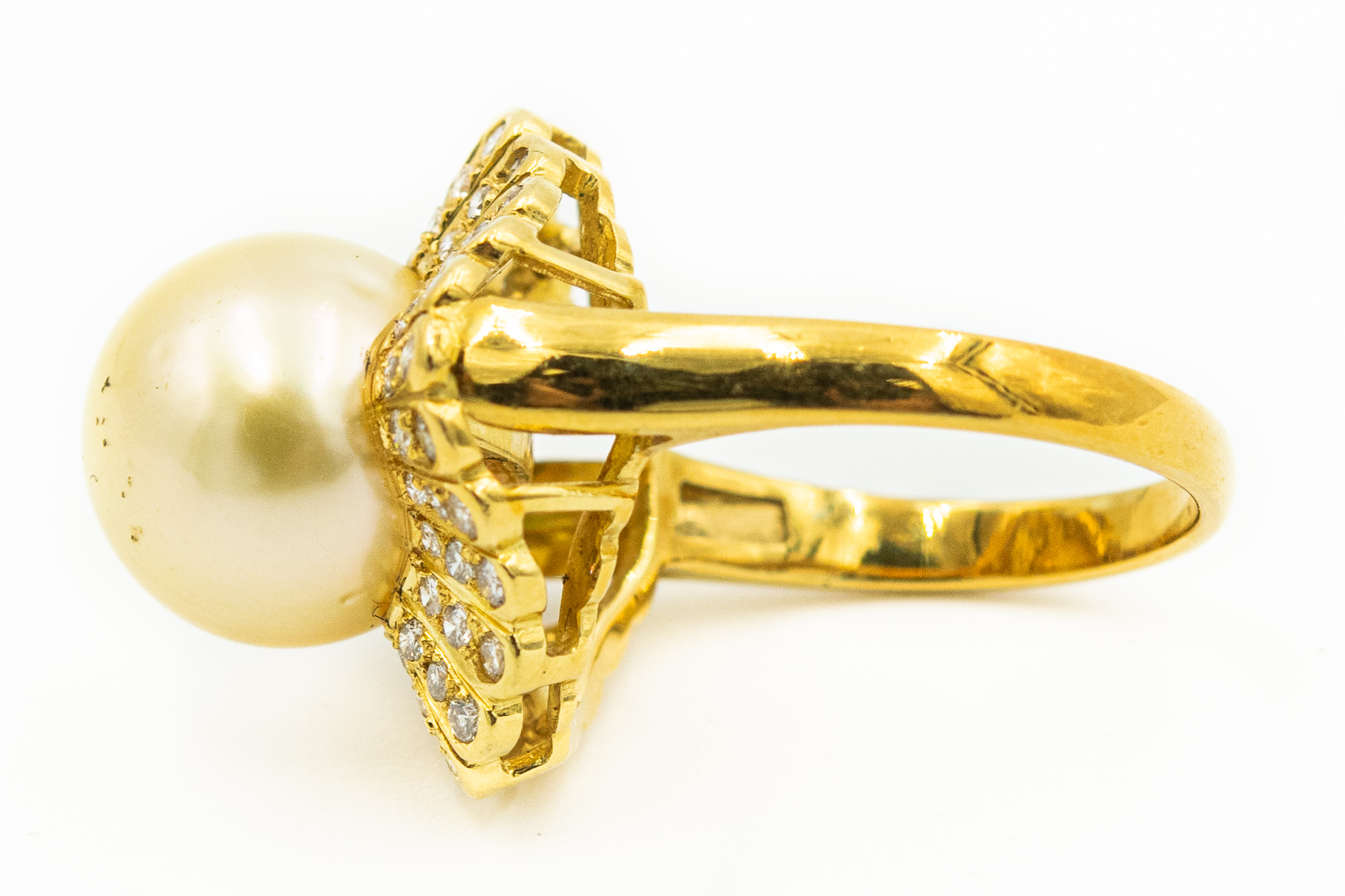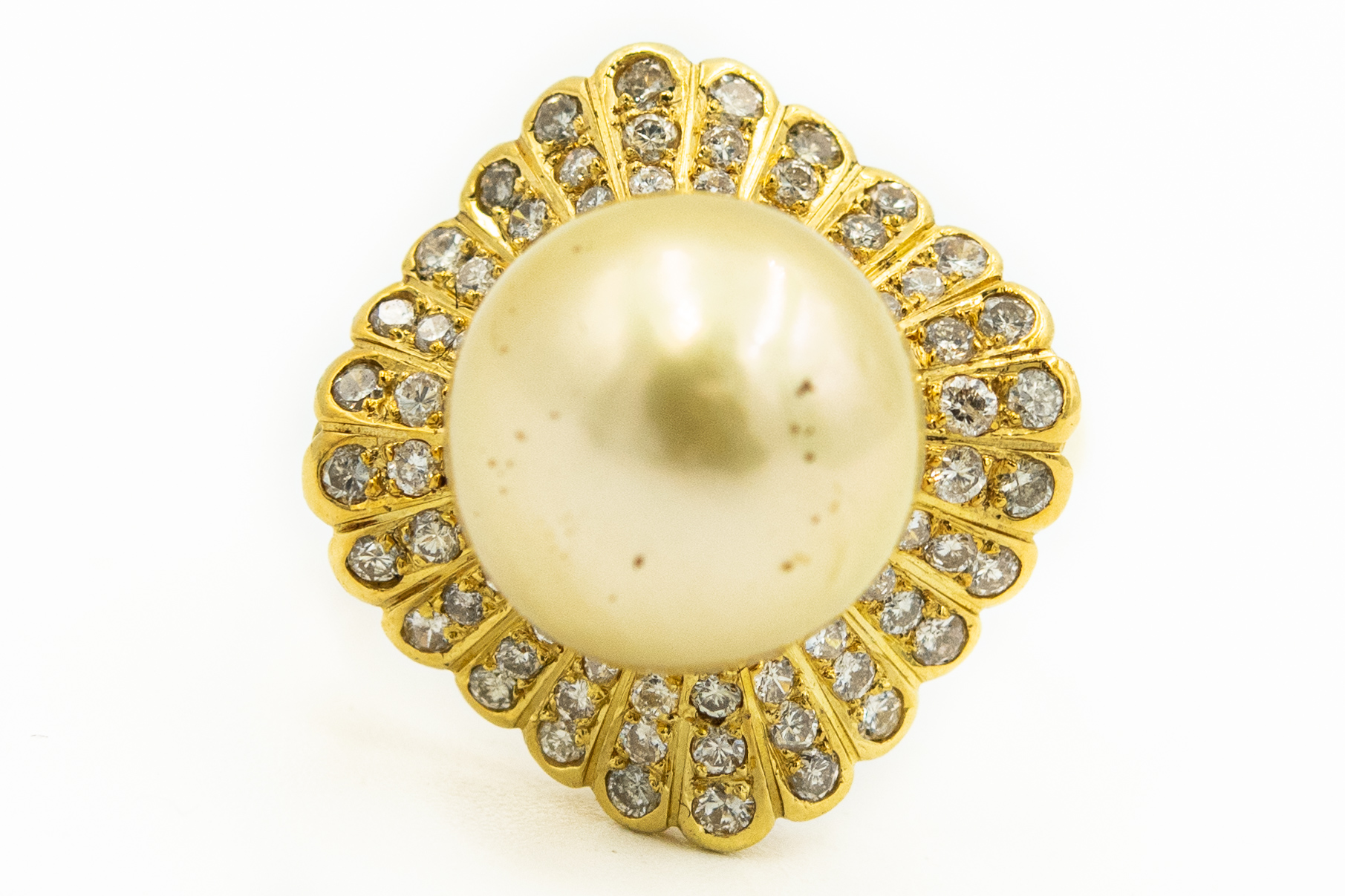 Estate Yellow Gold South Sea Pearl and Diamond Ring; 14k yellow gold; 5.70dwt/8.80g; pearl 12.00mm; 102 diamonds 1.75cts; Ring Size 6 1/2