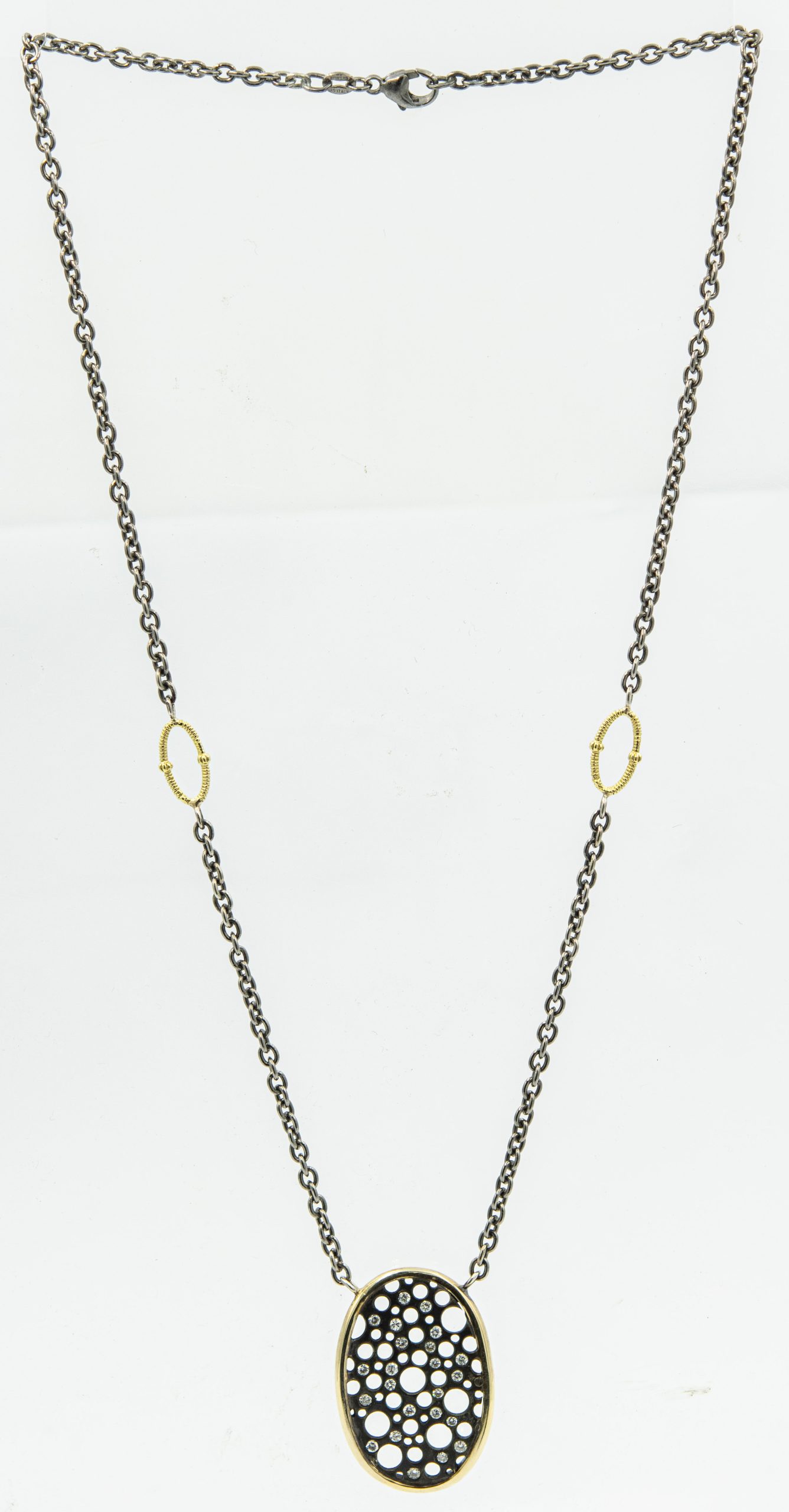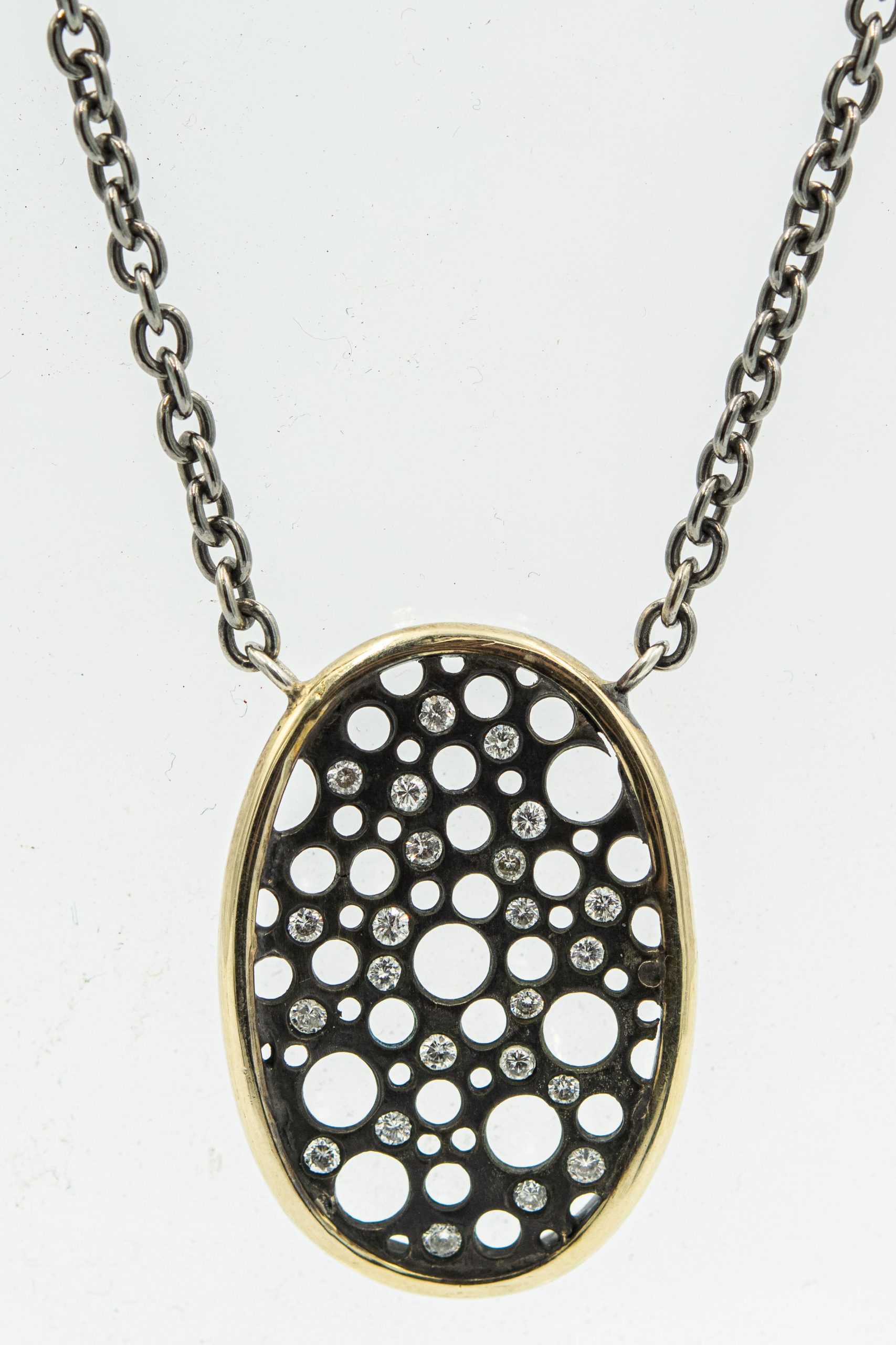 Estate Yellow Gold Sterling Silver and Diamond Necklace; 18k yellow gold; sterling silver. The necklace features an oval pendant studded with 22 round brilliant cut diamonds weighing approx. .75cts combined set. The are set in rhodium plated sterling silver with 18K yellow gold highlights and weighs 20.0g and measures 20".