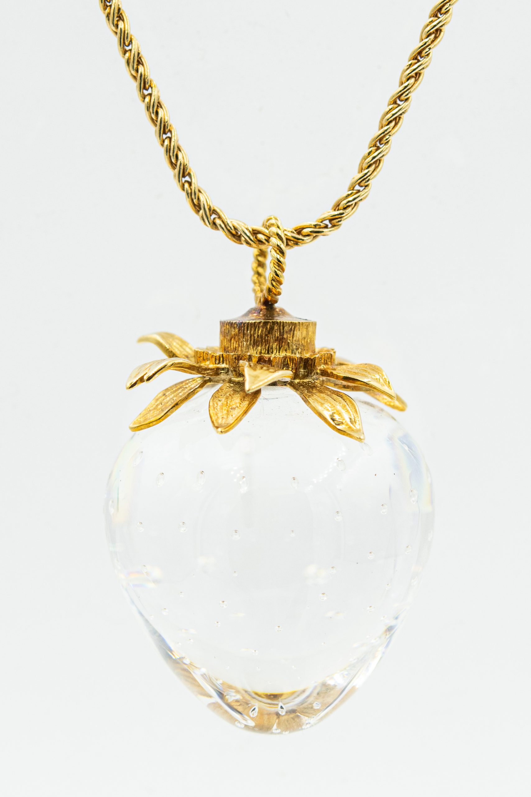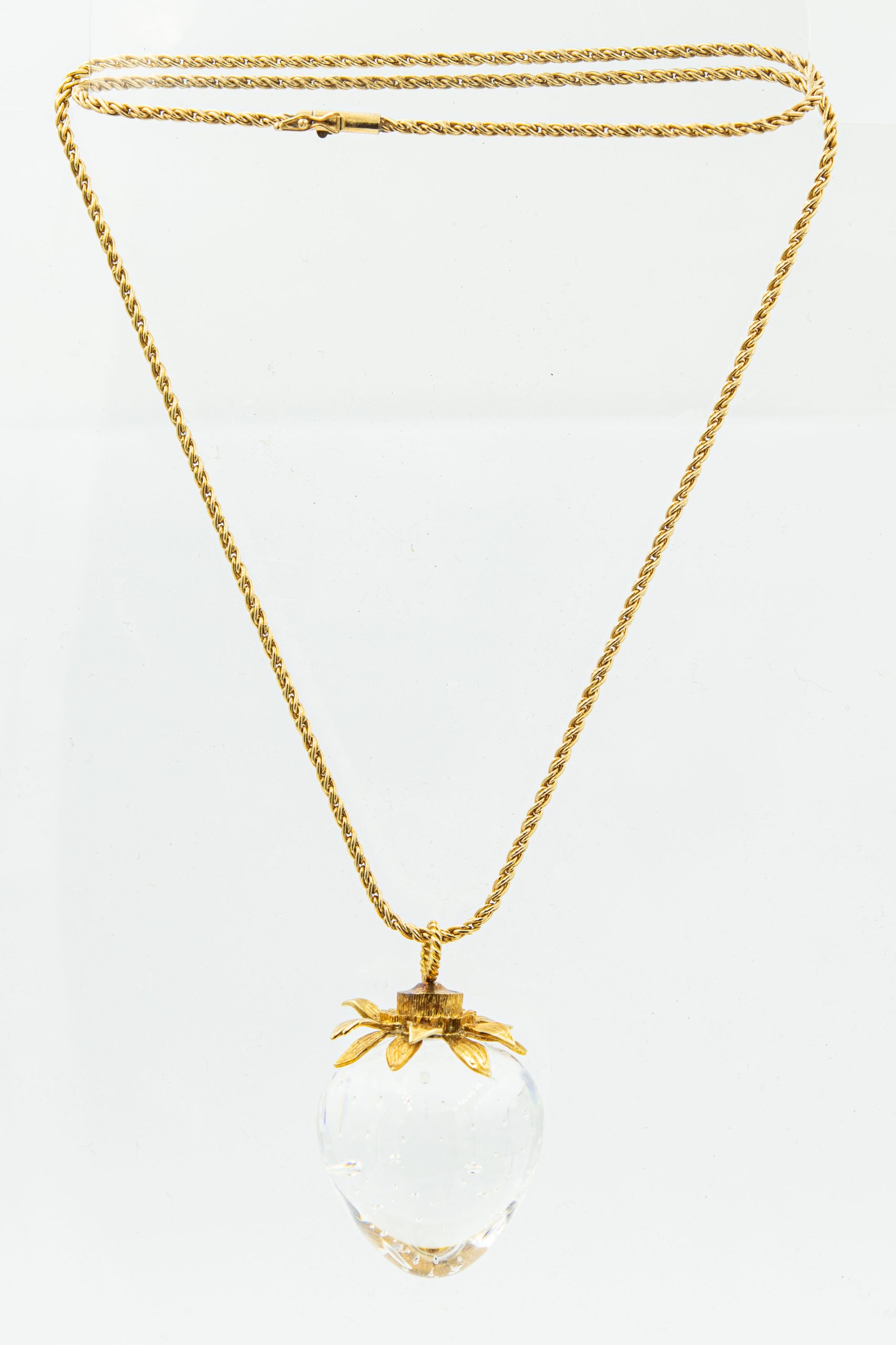 Estate Yellow Gold Steuben Crystal Strawberry Pendant Necklace. The necklace features a glass pendant with an 18k stalk suspended from an 14k yellow gold chain that measures 24" long. It weighs 41.8dwt/65.01g. The berry pendant measures 50.6mm x 31.0mm.