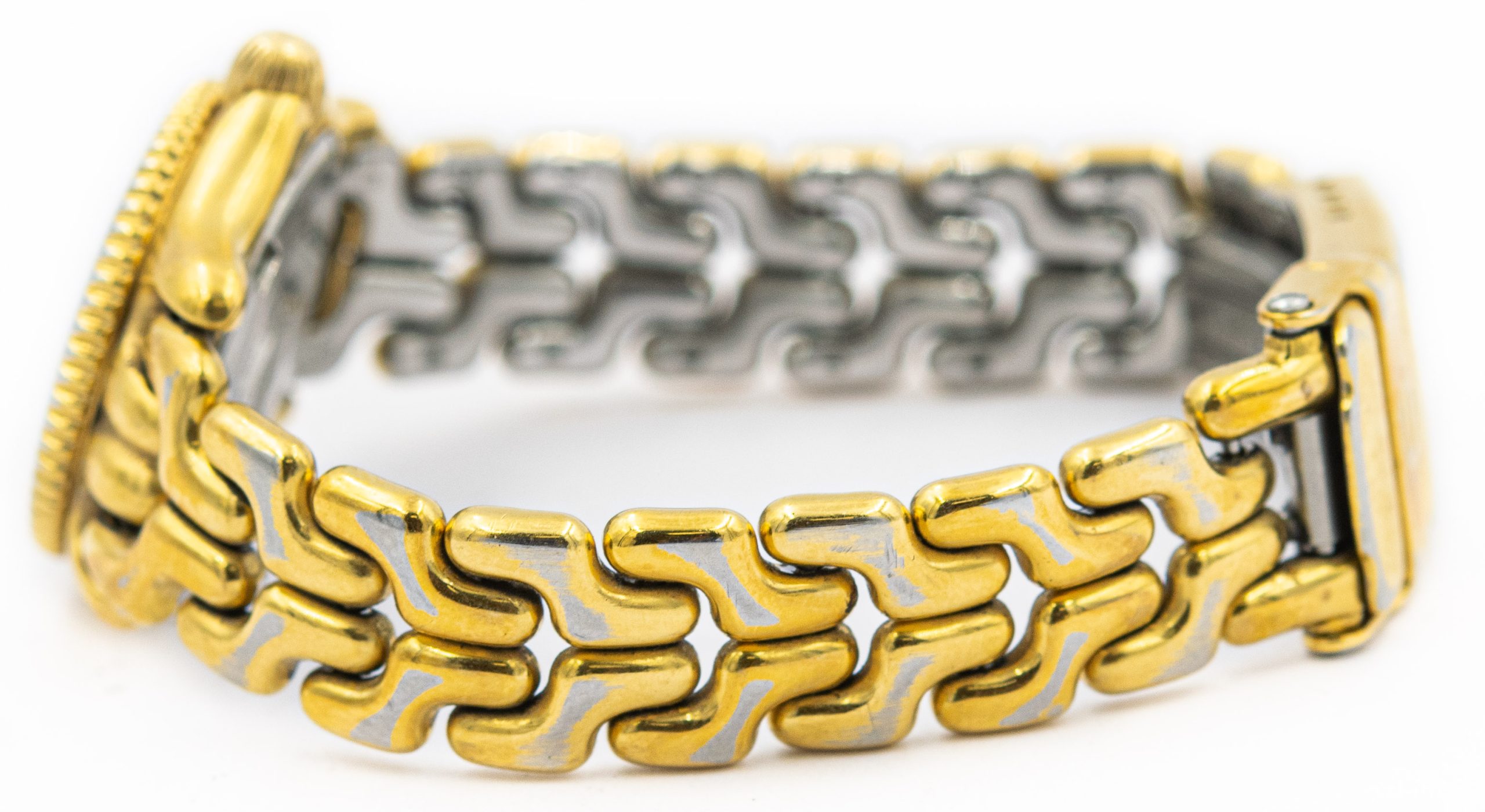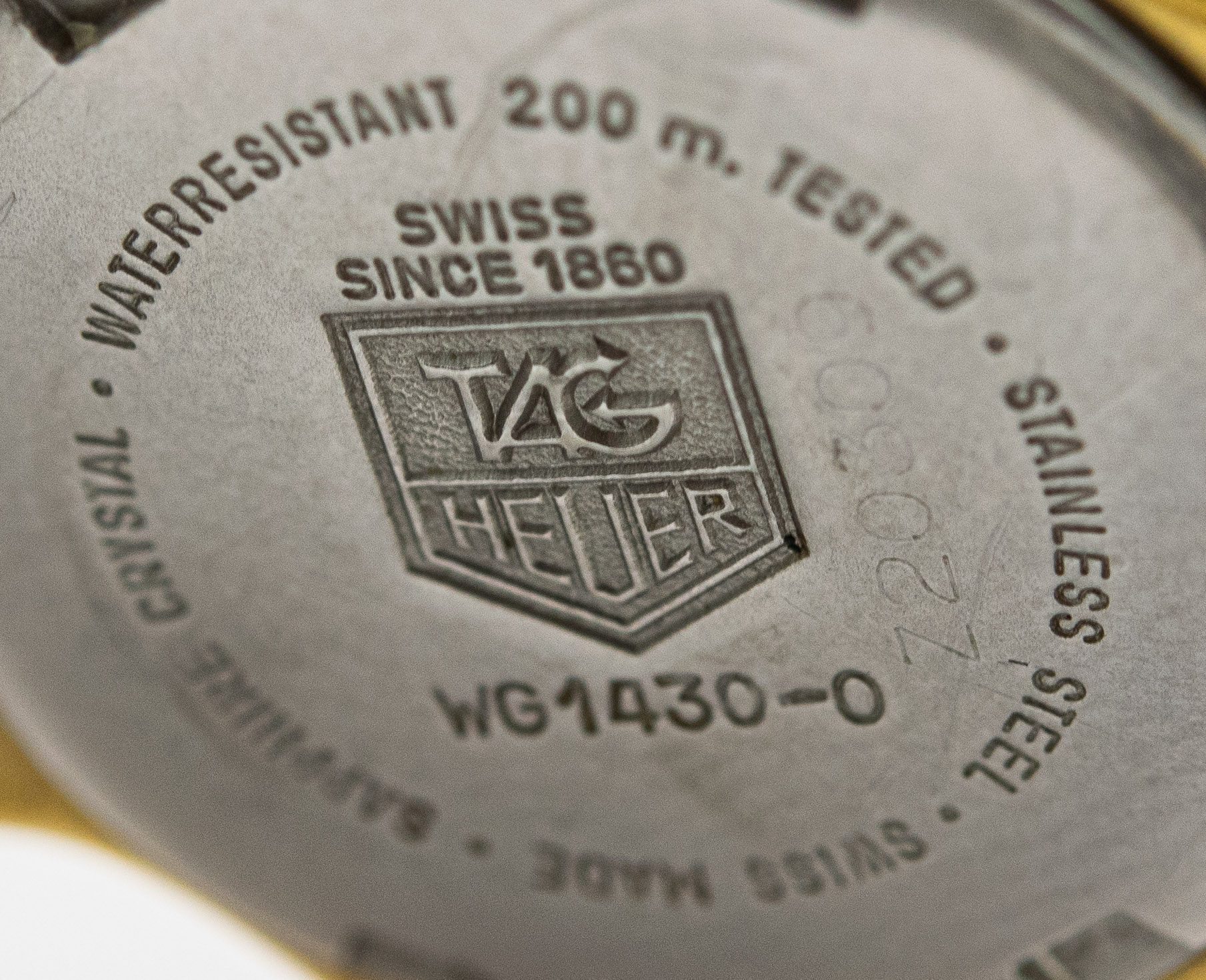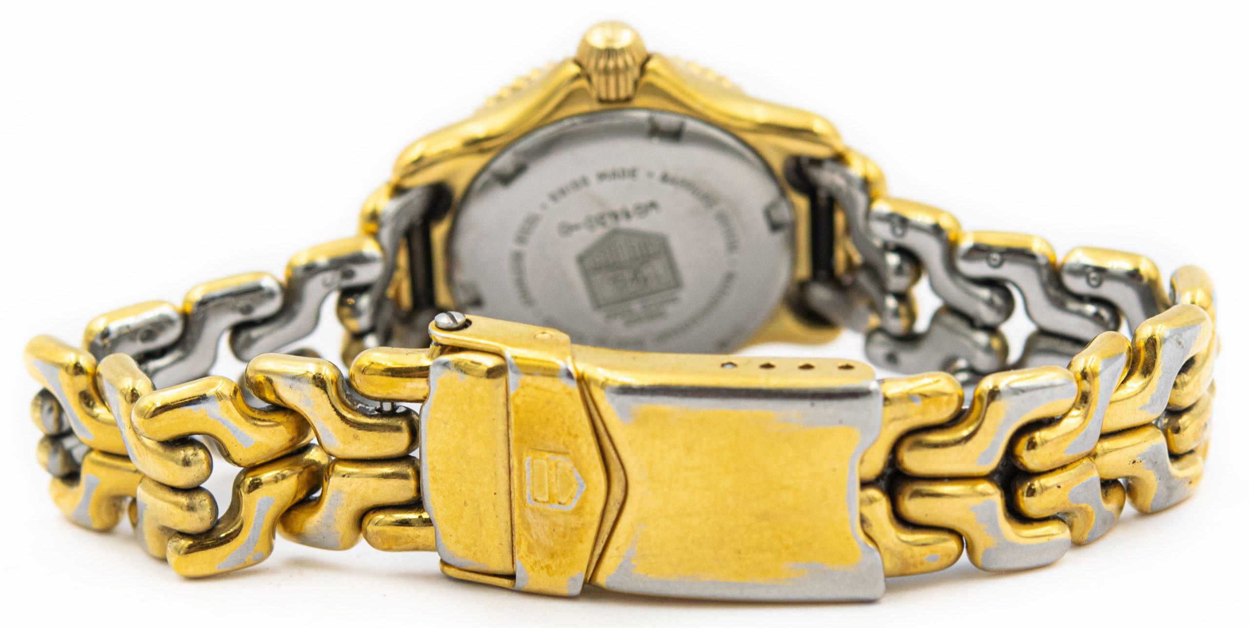 Ladies Mini Gold Plated TAG Heuer Professional 200 Meter, WG1430 Wristwatch Circa 1990's. This is a ladies "mini" wristwatch by TAG Heuer in a three piece gold plated circular case is topped with a bidirectional bezel that measures 28.00mm x 28.00mm including the crown. The watch is attached to a matching gold plated Heuer bracelet that measures 6 3/4" long. The watch has the original Swiss Tag Heuer quartz movement that is in good running condition. The watch is topped with a white painted dial with dot indexes and date window at 3 o'clock. As you can see from the photos the watch is in overall fair condition. It does show quite a bit of gold wear on the watch.