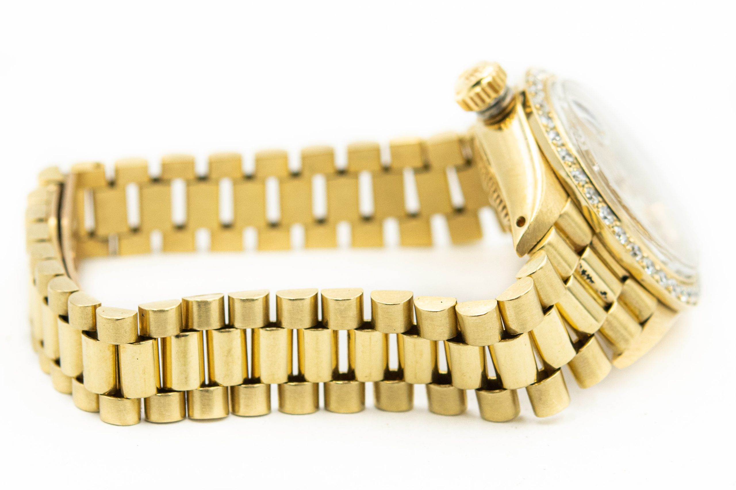 Ladies Rolex Datejust Wristwatch with Solid Gold Diamond Bezel and Dial Model Ref 6917. This is a ladies 18K yellow gold Datejust Rolex Ref 6917 Serial #6.749.931 wristwatch. It features a three-body case construction, screwed-down case back and crown, Aftermarket diamond bezel set with 32 round brilliant cut diamonds weighing 1.75cts combined. The watch has a plastic crystal with "cyclops" lens, Aftermarket diamond dial with applied indexes and aperture for the date at 3:00 o'clock. It has a Cal. 2030 rhodium-plated 28 jewel movement with "oeil-de-perdrix" decoration, straight line lever escapement, monometallic balance that is in running condition. Please note the watch will need an overhaul in order to keep accurate time. The watch is attached to a Rolex Jubilee 18K yellow gold bracelet that measures 6 1/2" long with the watch. The watch is in overall good condition.
