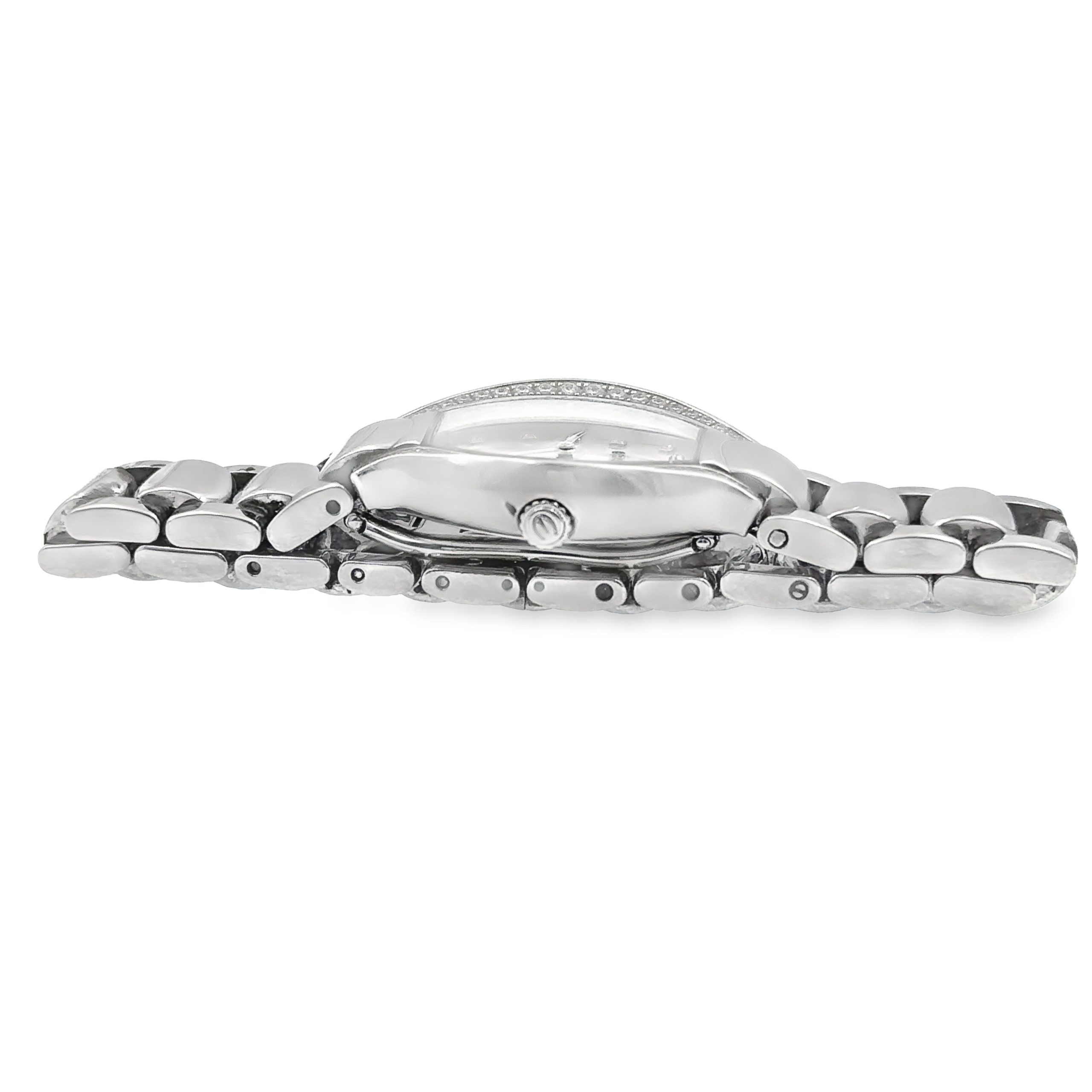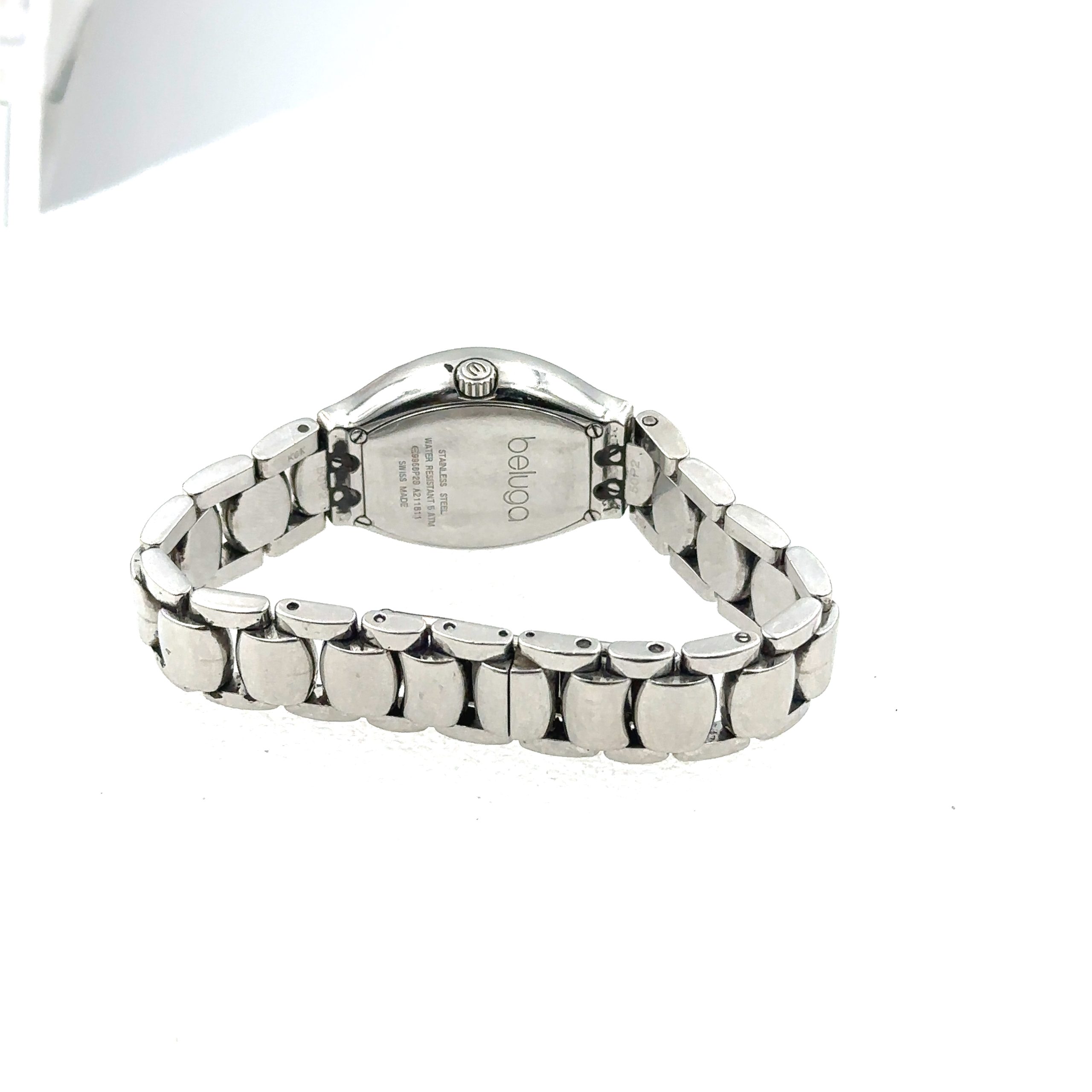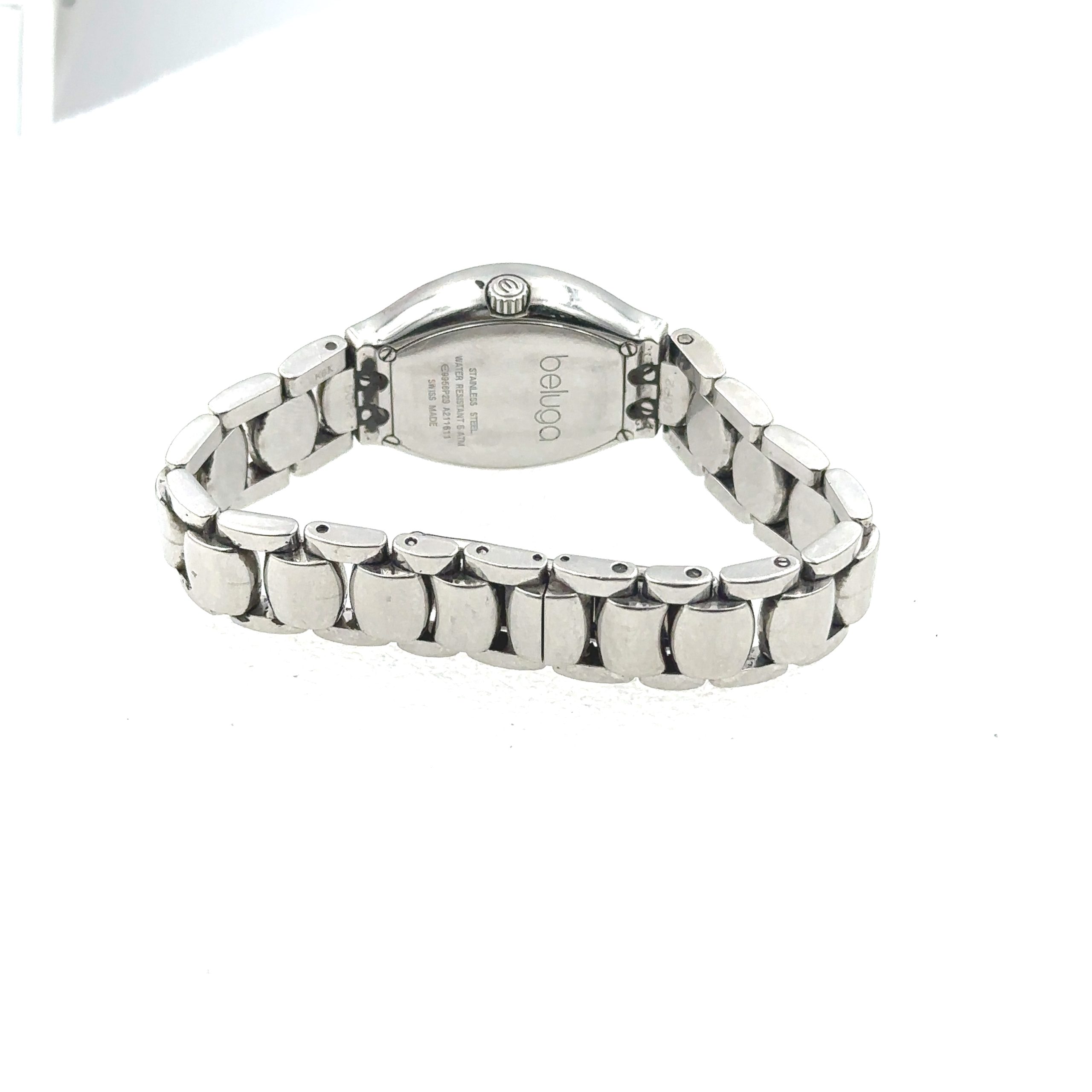 Ladies Steel and Diamond Beluga MOP Wristwatch Model E9956P2S by Ebel. The watch features a tonneau shaped two piece case that measures 35mm x 27.25mm including the crown. It is framed with 44 diamonds and has an intergraded matching steel bracelet that measures 6 1/4" in length. The watch also features a mother-of-pearl diamond dial. As you can see from the photos the watch is in overall good condition. It will need a polish.