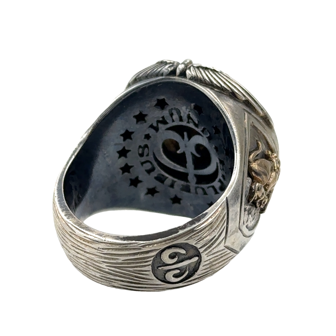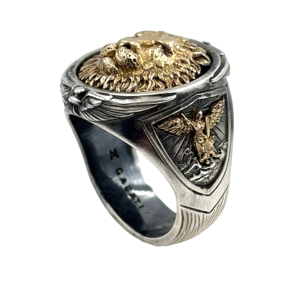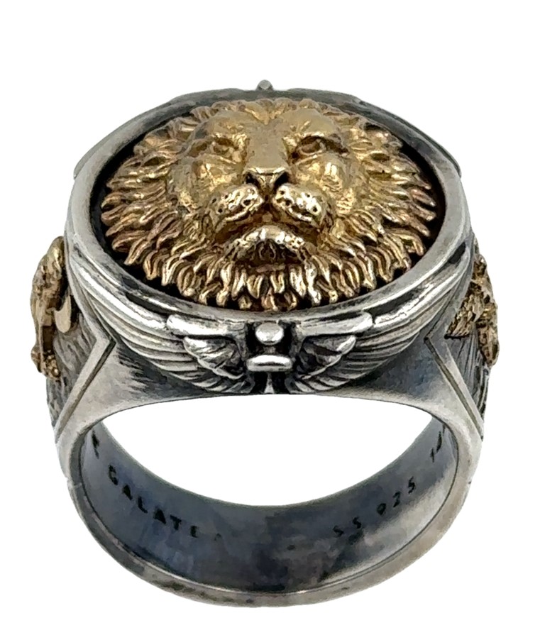Sterling Silver & 14K Yellow Gold Lion's Ring by Galatea, featuring a highly textured lion's head flanked by an Archangel and a Lion with Cubs in solid 14K gold on sterling silver. The ring weighs 21.2 grams (13.60 dwt) and is a size 9 1/2. The lion symbolizes courage and strength—the King of the Jungle. The Archangel symbolizes protection from evil. The lion carrying its cub represents caring for family, protecting the weak, young, and innocent. Wings with a sword in the center symbolize freedom and physical strength, while wings with a brush symbolize creativity, intellectual and spiritual balance. The ring is engraved underneath with "E Pluribus Unum," meaning "Out of many, one." This ring is crafted for the man who embodies great strength and courage. Retail price: $2,100.