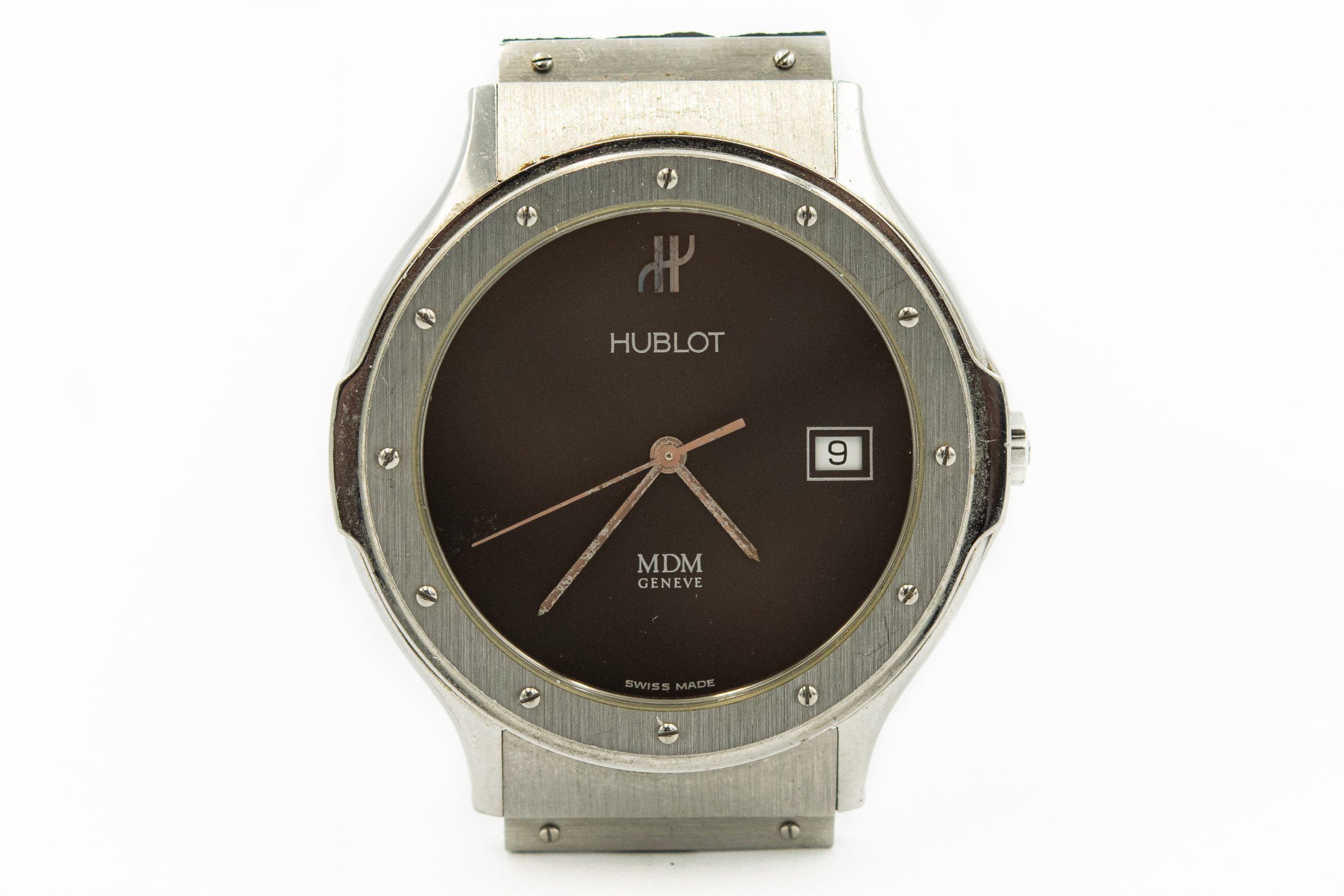 Men's Classic Hublot MDM Steel Wristwatch Ref 1521.100. The watch features a three piece waterproof case secured with 12 screws. It has a quartz movement that is in good running condition. The watch is topped with a black dial. Sorry the band is cracked and will need to be replaced. The case measures 36mm x 44mm lug to lug.