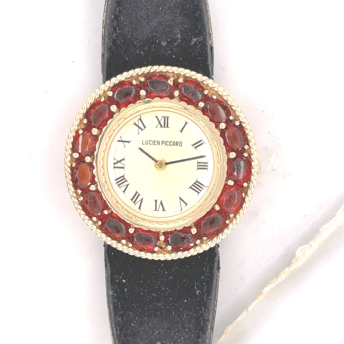 MK & DK Personal Collection - Ladies 14K Yellow and Gold Citrine Wristwatch by Lucien Piccard Circa 1960's. The watch features a two piece circular 14k yellow gold case framed with oval faceted citrine's. It measures 34mm in width (Serial #C8982) and is signed "Lucien Piccard". The watch has a 17 jewel high grade Swiss movement signed Lucien Piccard. It is topped with a gold painted dial with Roman numerals. As you can see the watch is in overall excellent condition.