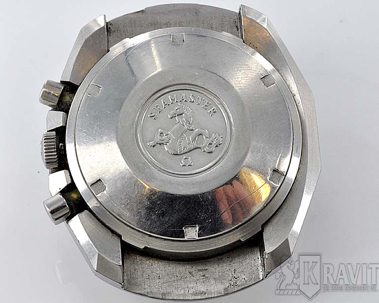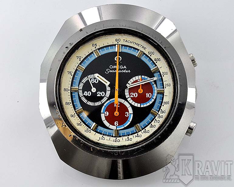 MK Personal Collection Men's Omega Anakin Skywalker Chronograph Ref 145.023 Cal 861 Circa 1969. The watch features a rare tungsten coated steel two piece massive case that measures 51mm x 45mm including the chrono buttons. It is signed on the inside back case "Omega Watch Co Fab.Swiss 145.XXX,". It has a Cal 861 movement copper-colored, 17 jewels, straight line lever escapement, monometallic balance, shock-absorber, self-compensating Breguet balance spring (Serial # 31.XXX,XXX) which dates the watch to around 1969. The watch is in working condition. It is topped with an original black and blue dial with tritium coated indexes, subsidiary dials for the seconds, the 12-hour and 30-minute tri-colored registers and Tritium-coated steel "bâton" hands and outer white painted tachymeter. This is a great looking watch and highly collectible. As you can see from the photos the watch is in overall good condition.