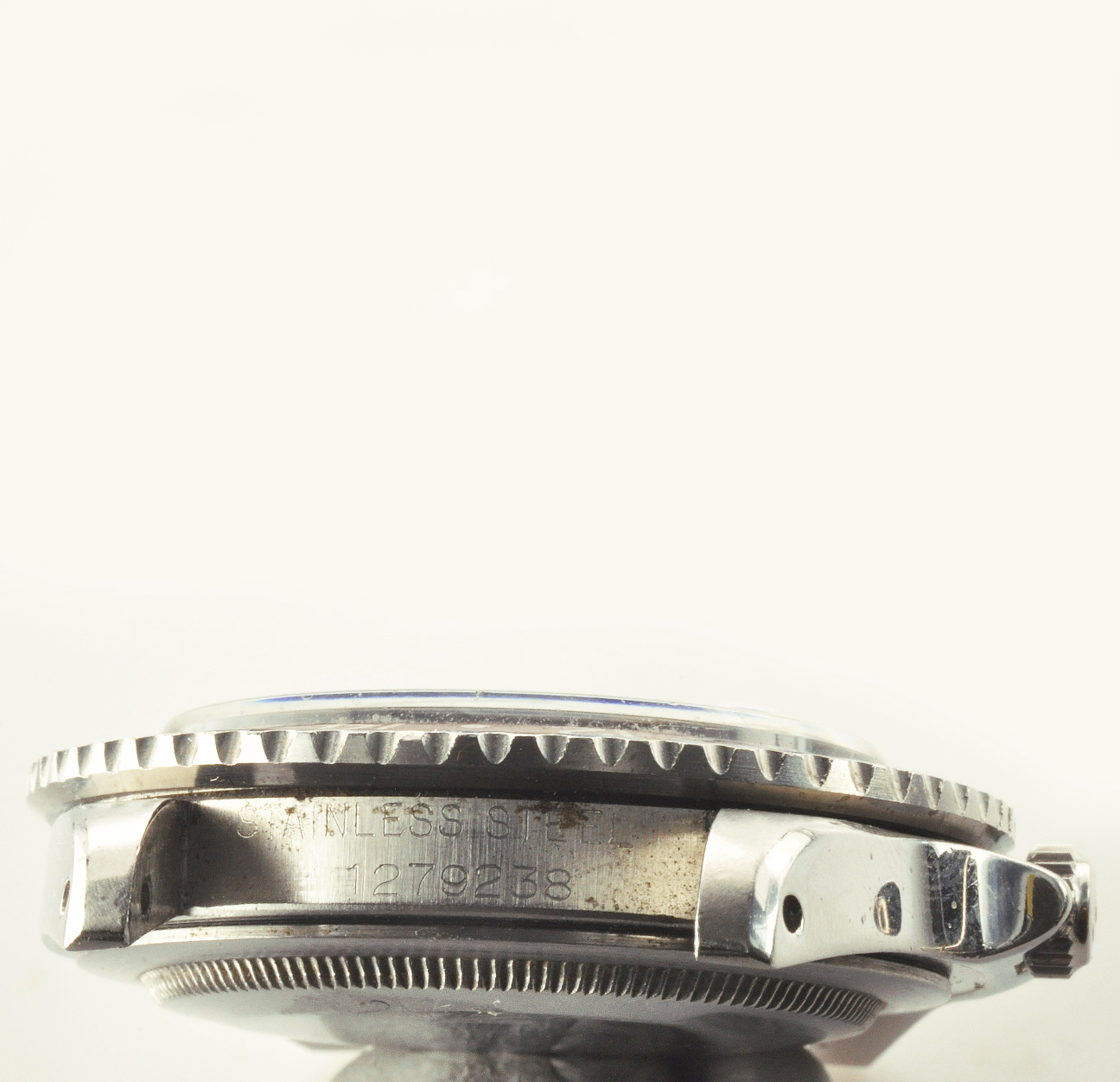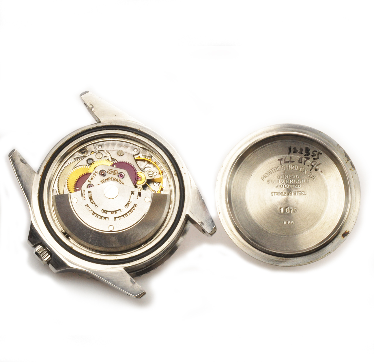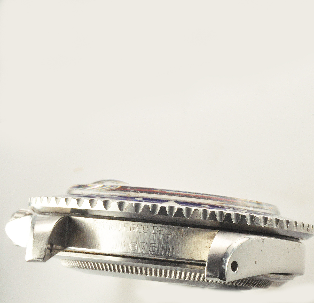MK Personal Collection The present lot is part of a larger privately held collection and is intended for exhibition purposes only. This is a men's Rolex GMT Master Steel Wristwatch Ref 1675 Circa 1965. This is a very fine example of a vintage Rolex GMT Master Ref 1675 from 1965 with an original dial. The watch has a three piece steel oyster case with a screw down waterproof back that is stamped on the back inside cover "1675 II.65, Ref 1675 Serial # 1.279.238". It has a high grade Cal. 1560 rhodium-plated Rolex movement with 26 jewels, straight line lever escapement, monometallic balance adjusted to temperatures and 5 positions, shock-absorber, self-compensating free-sprung Breguet balance spring, Microstella regulating screws Serial # 97.979 that is in very good running condition. It is topped with an original black GMT Master dial and GMT hand. The watch is in overall very good condition it just needs a good polish. Rolex launched the GMT-Master in 1954 in order to provide pilots a watch that could read 24 hour time for a selected time zone. Following the success of this model, in 1959 Rolex introduced its successor, the reference 1675, which Rolex produced until 1980. This example features a beautifully Pepsi bezel The movement is stamped "ROX" indicating it was made for the US market. The inside case back is stamped, II 65, indicating is it from the second quarter of 1965.