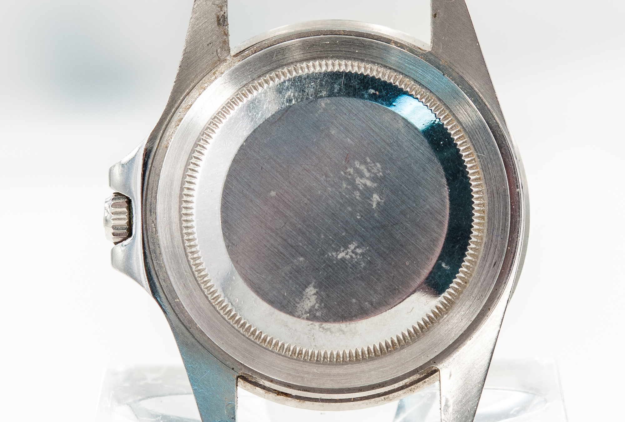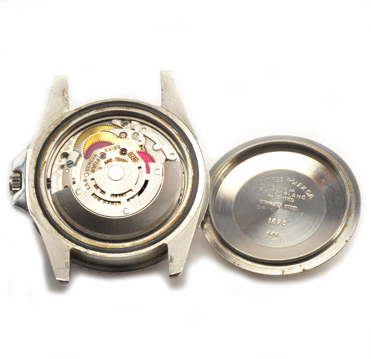 MK Personal Collection The present lot is part of a larger privately held collection and is intended for exhibition purposes only. Men's Rolex GMT Master Steel Wristwatch Ref 1675 Circa 1966. This is a very fine example of a vintage Rolex GMT Master Ref 1675 from 1966 with an original dial. The watch has a three piece steel oyster case with a screw down waterproof back that is stamped on the back inside cover "1675 II.66, Ref 1675 Serial #1.428.896". The watch has a high grade Cal. 1570 rhodium-plated Rolex movement with 26 jewels, straight line lever escapement, monometallic balance adjusted to temperatures and 5 positions, shock-absorber, self-compensating free-sprung Breguet balance spring, Microstella regulating screws Serial # D100.888 that is in very good running condition. It is topped with an original black GMT Master dial and GMT hand. The watch is in overall very good condition. Rolex launched the GMT-Master in 1954 in order to provide pilots a watch that could read 24 hour time for a selected time zone. Following the success of this model, in 1959 Rolex introduced its successor, the reference 1675, which Rolex produced until 1980. This example features a beautifully faded bezel that has turned light blue and a purple-ish color giving some uniqueness to this GMT. The movement is stamped "ROX" indicating it was made for the US market. The inside case back is stamped, II 66, indicating is it from the second quarter of 1966