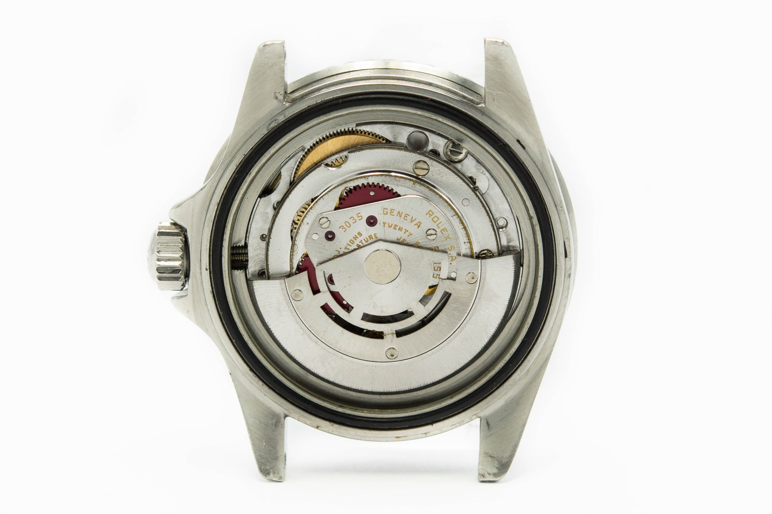 MK Personal Collection Men's Rolex Steel Submariner Wristwatch Ref 16800 Circa 1986. This is a fine men's Rolex Steel Submariner wristwatch in a classic three piece Oyster case, Ref 16800 and Serial #9.206.817. The watch measures 46.00mm x 44.00mm. It has a high grade Swiss Rolex Cal. 3035 movement that is in good working condition. It is rhodium-plated with 27 jewels, straight line lever escapement, monometallic balance adjusted to temperatures and 5 positions, shock-absorber, self-compensating free-sprung Breguet balance-spring (Serial # 1.403.230). The watch is topped with an original black dial with with dot indexes and steel chrome bezels . The watch is in overall good condition and as you can see the center sweep second hand is missing the lume but it's an easy fix. The oyster bracelet is a little loose. It measures 8" in length.