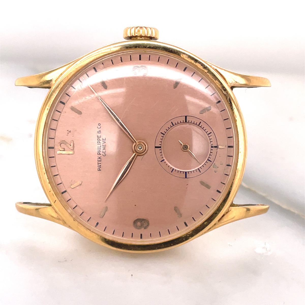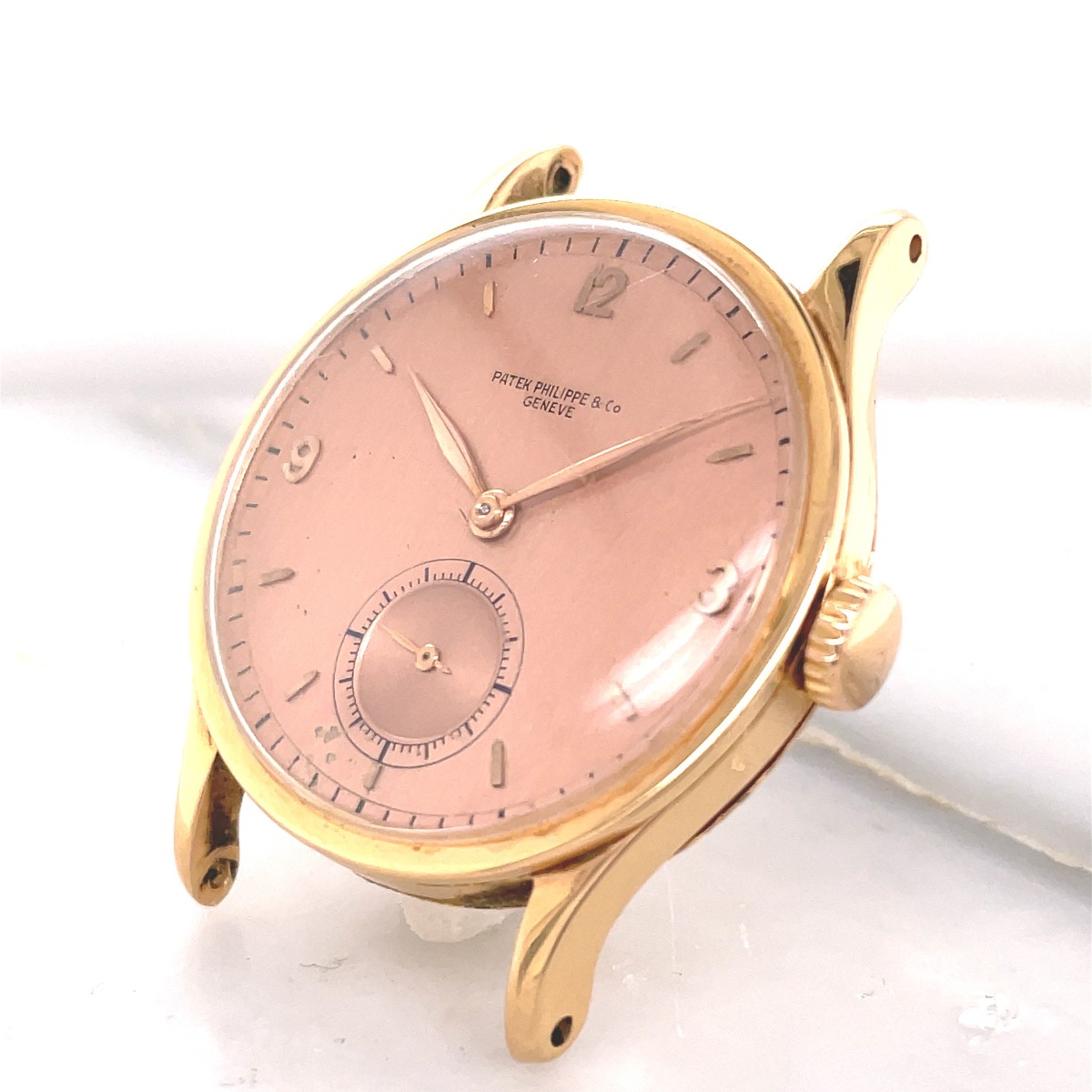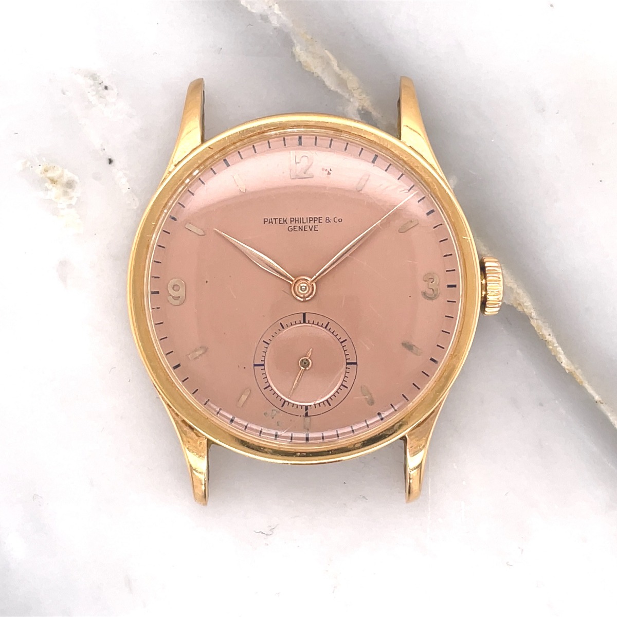 MK Personal Collection The present lot is part of a larger privately held collection and is intended for exhibition purpose. Patek Philippe Oversized Calatrava 18k Pink Gold Wristwatch Ref 570 Circa 1941/2. This very fine and rare men's oversized Patek Philippe Calatrava wrist watch is in 18K pink gold and it measures 35mm wide without the crown x 44mm lug to lug. It has a three-body case construction with a flat bezel and concave lugs (Serial #297,XXX). The watch has a super rare pink dial with applied pink gold stick indexes and Art Deco numerals with subsidiary seconds and pink gold "bâton" hands (refreshed) 12''' rhodium-plated movement with "fausses côtes" decoration and 18 jewels, straight line lever escapement, monometallic balance adjusted to heat, cold, isochronism and 5 positions, Breguet balance-spring, micrometer regulator Serial # 922,XXX. Reference 570, nicknamed "Calatravone" (Italian for large Calatrava), has been a favorite amongst collectors thanks to its large case, flat bezel and vivid modernist design. Introduced in 1938, the iconic reference 570, which is a larger version of Patek Philippes reference 96, was manufactured with both subsidiary and center seconds configurations in stainless steel, yellow, white and pink gold, and platinum cases. The present example from the first series houses the caliber 12120, whilst the second series used the caliber 12400, and the last series used an antimagnetic movement - the caliber 27 AM 400.