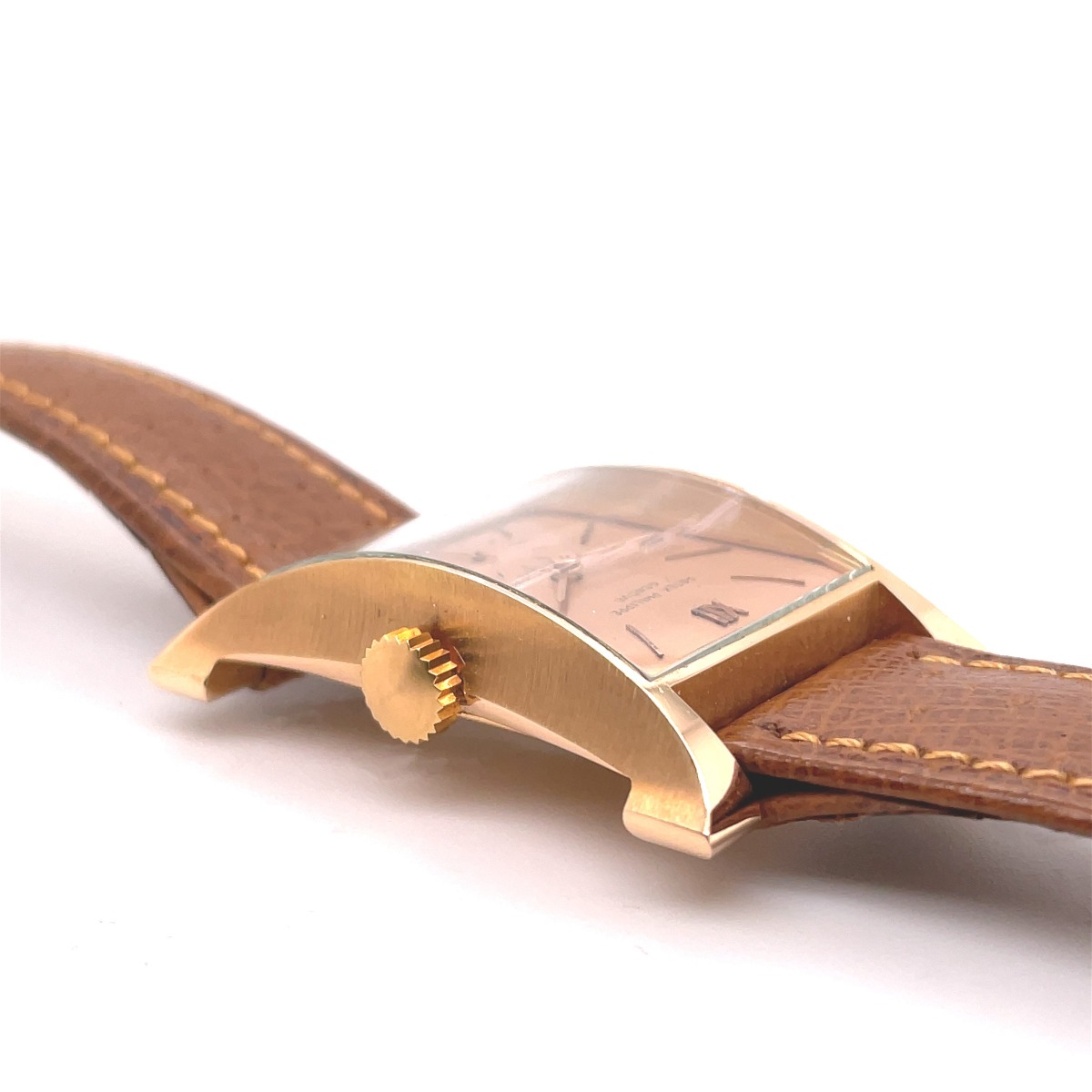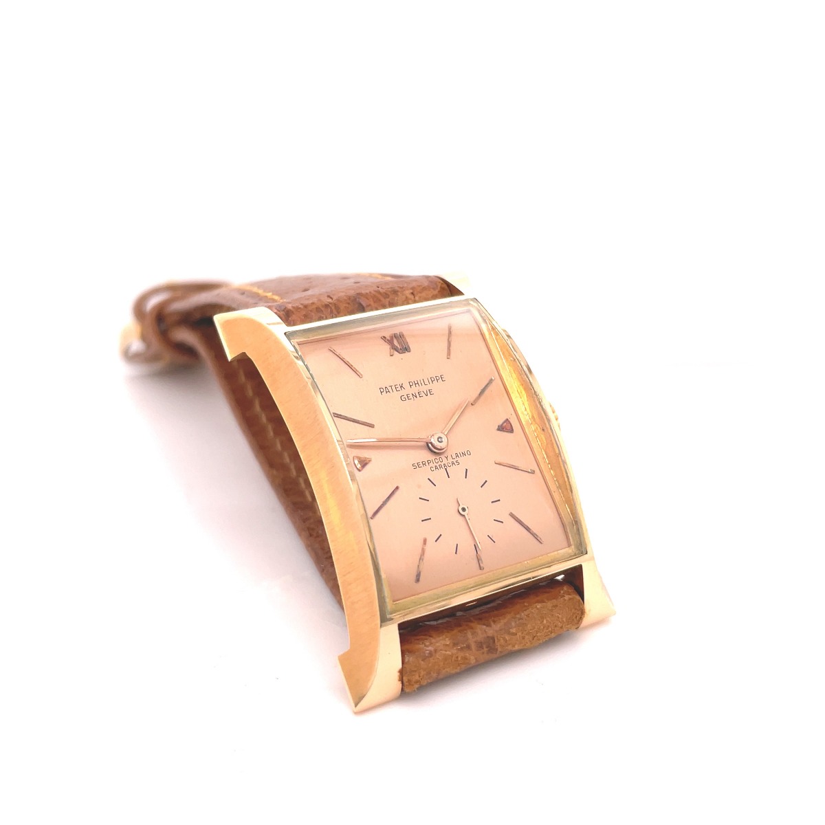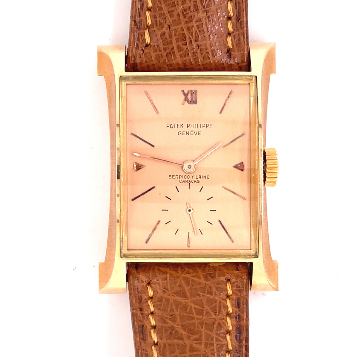 MK Personal Collection The present lot is part of a larger privately held collection and is intended for exhibition purposes only. Rectangular Rose Phillipe Patek Serpico Y Laino Caracas "Eiffel Tower" Wristwatch, Circa 1951, Gift From President Marcos Pérez Jiménez to his personal Doctor (Presidents of Venezuela 1952-1958). This fine and rare men's wristwatch by the Patek Philippe Watch Co., features a "Tour Eiffel", No. 974.926, Case No. 673.343, Ref. 2441. The watch is also called "Pagoda". Production of this reference started in 1948 and it features a two piece rectangular, flared, "bombé" 18k pink gold case also stamped S&L 18K (Serpico Y Laino) . It has a Cal. 9-90 tonneau-shaped Patek Philippe rhodium plated movement with fausses cotes decoration, 18 jewels, straight-line lever escapement, bimetallic compensation balance, self-compensating Breguet balance spring, micrometer regulator that is in excellent running condition. The watch is topped with an original pink painted dial with applied pink gold stick and arrow indexes. The watch is signed above sub-seconds "Serpico Y Laino Caracas", which is the retailer. The watch is in overall NOS condition. Accompanied with the original Patek Philippe band terminating with a 18K PP / S&L Buckle, amazing quality. Patek Philippe started production of the reference 2441 in 1948 and continued until at least 1955 with a total of approximately only 200 pieces made, the majority cased in yellow gold. The pink gold example of this iconic wristwatch is thought to have been produced in approximately 60 examples. This model, often referred to as the "Eiffel Tower", remains easily identifiable by its distinct flared design, resembling the base of the famous French landmark.