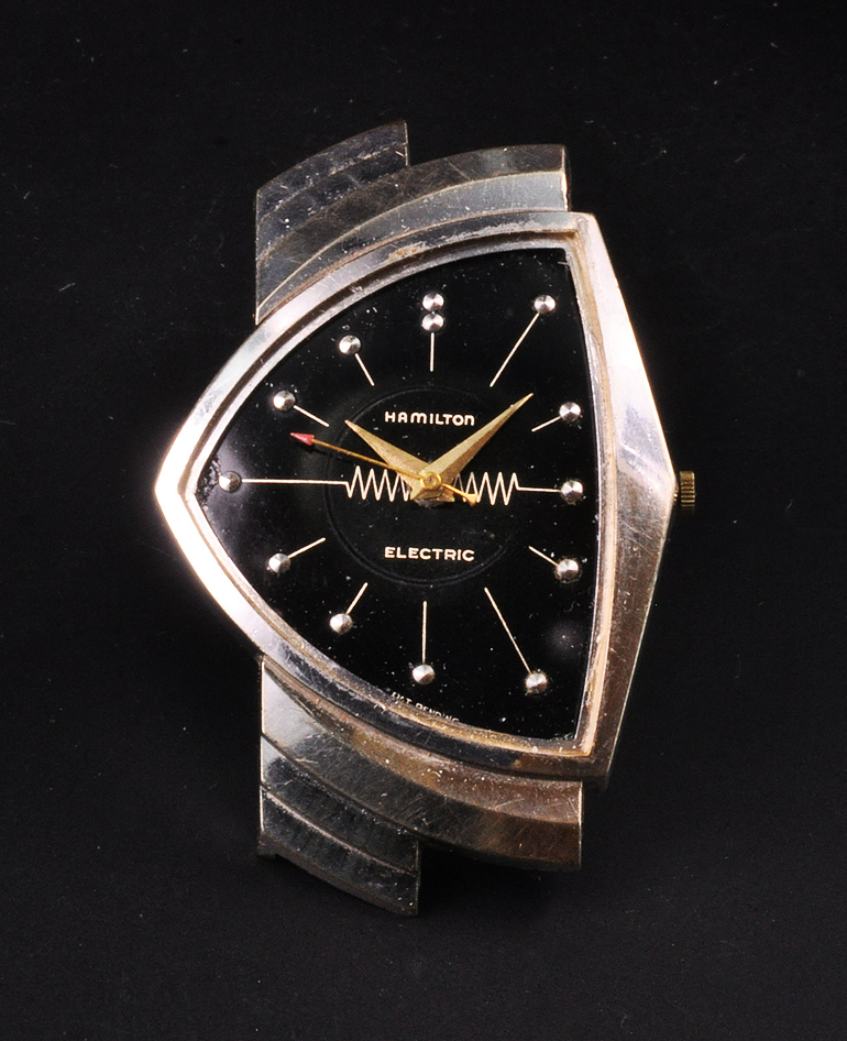 MK Personal Collection The present lot is part of a larger privately held collection and is intended for exhibition purposes only. This is a very rare 14k white gold Hamilton Ventura Pat Pending Electric wrist watch, Cal 500. This is a great looking watch by Hamilton Watch Co.. This model is called the Ventura and it is in an extremely rare 14k white gold triangular two piece case with fluted lugs. It has a Hamilton Cal 500 electric movement that is in good running condition. It is topped with an original black painted dial with white gold dot indexes. The watch is signed "Hamilton Electric" and it measures 50mm x 33m including the crown Serial # S289721, The watch is in overall excellent condition. There were fewer than 300 made in white gold. Ventura watch. Pictured in René Rondeau's book "The Watch Of The Future" on pages 164-168, it was released in January 1957 with an original price of $200.00. It is signed on the dial, case, crown, movement, strap and buckle. It runs great and keeps time to well under 30 seconds variation per day and has a brand new battery just installed. The hack function works properly, and the watch starts right up each time the crown is pushed in from the setting position to the running position. The Ventura was the first of the Hamilton Electrics released, along with the conservative Van Horn. The shape reflects the "boomerang" motif which was common in that era and was designed by Richard Arbib. Even the crown symbolized the new "Electric" watch, obviously being much too small to wind. The White Gold version is very rare, and this example has an ORIGINAL FINISH BLACK DIAL, with great uniform patina. The Ventura truly symbolizes the unique character of Hamilton Electric watches.