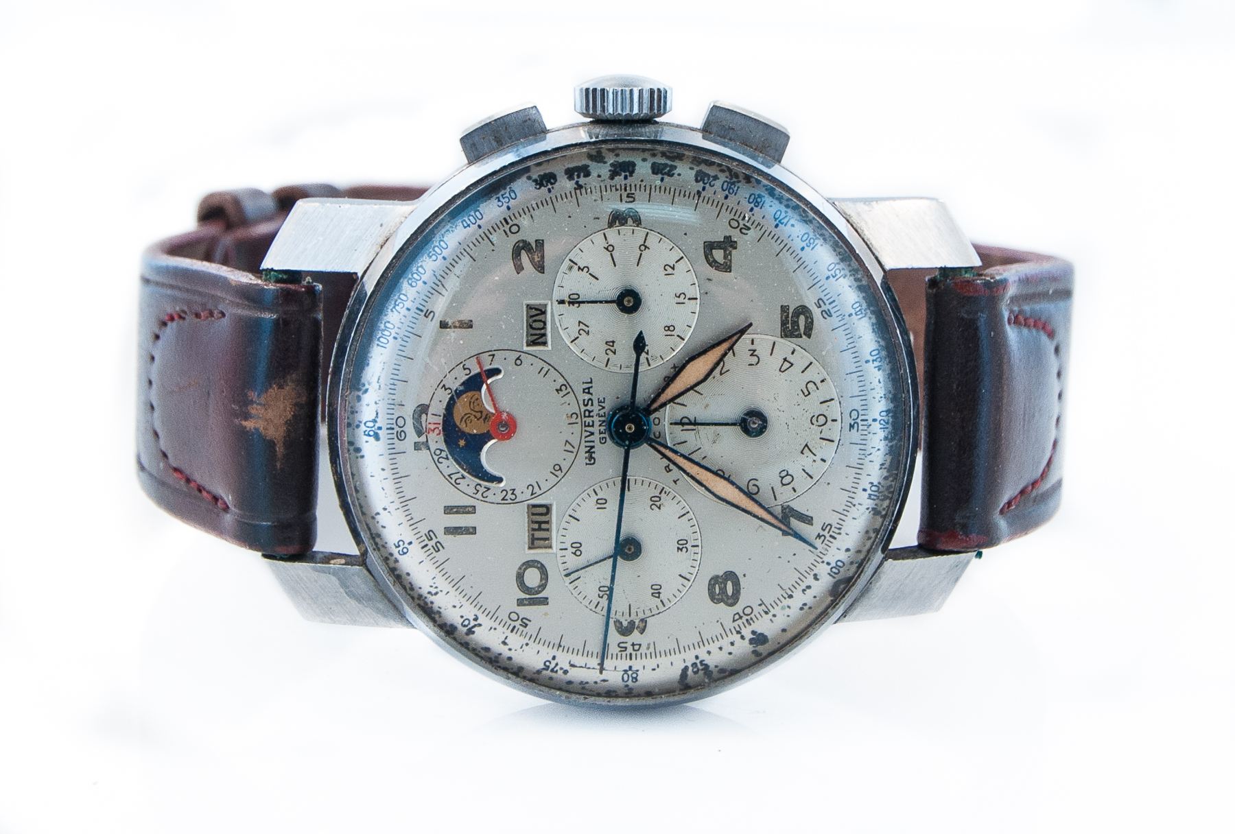 MK Personal Collection The present lot is part of a larger privately held collection and is intended for exhibition purposes only. Rare "Fat Lug" Universal Geneve Tri-Compax Chronograph Wristwatch Cal 481 Ref 22259. This three piece steel Universal Geneve so called Tri-Compax with the unusual extra wide beveled lugs in stainless steel Serial #1066916 Ref 22259 that measures 37.00mm x 43.00mm lug to lug. The watch is signed Universal Geneve Swiss. The watch has a rare Cal. 481 nickel plated 17 jewel movement with straight line lever escapement, monometallic balance, self-compensating Breguet balance-spring that is in good running condition. The watch will need an overhaul. It is topped with a rare original silver painted dial signed Universal Geneve Tri-Compax. The overall condition of the watch is very good. This model is very rare with these unusual wide oversize lugs.