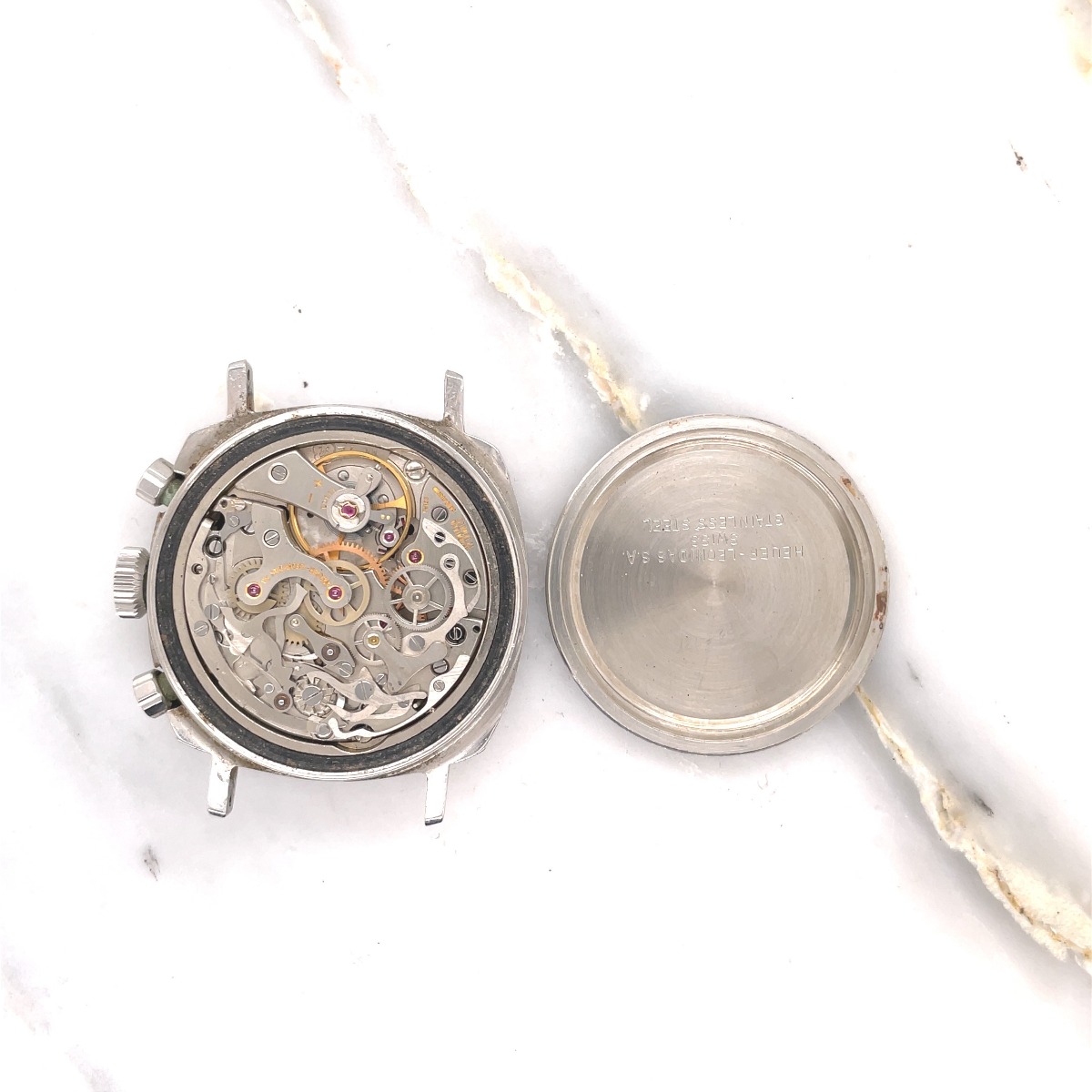 MK Personal Collection Rare Heuer Camaro Panda Dial Valjoux 72 Chronograph Wristwatch Ref 7220 Circa 1968. The watch features a two piece steel over sized case with a screw down waterproof back. It is signed on the inside back cover "Heuer-Leonidas S.A. Ref 7220 Serial # 174.899". It has a super high grade Valjoux Cal.72 manual wind movement with column wheel chronograph, rare PANDA silvered dial with applied black accented polished baton hour markers, black outer 1/5th second divisions with luminous dot five minute markers, further outer tachymetre scale to grey surround, polished pointed baton hands with black and luminous inserts, and red center chronograph hand, as you can see from the photos the watch is in overall very good condition but it does need a good polish and new crystal. The watch has been sitting in a drawer for the last 40 years. The watch was purchased from the original owner and he bought it while in the military (flying missions between the U.S. and West Germany). Swiss watch named after an American muscle car? Jack Heuer once told us that he named the watch after the Chevy Camaro because he was seeking to strengthen Heuers position in the US market by aligning the brand with US motor racing and given the popularity of the Chevy Camaro in the late 1960s and its position as the Pace car at the Indianapolis 500 in 1967 and 69 helped convince Jack that the name was a good fit.