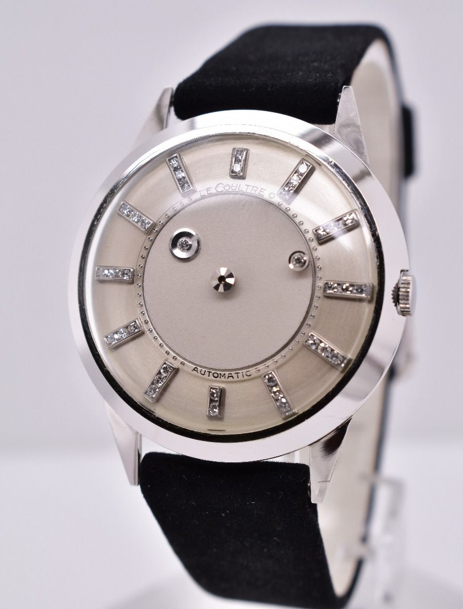 MK Personal Collection - Rare LeCoultre Galaxy Wristwatch Automatic Movement Ref 1300 Circa 1957 with Archive Papers from Jaeger-LeCoultre . The watch features a two piece solid 14k white gold circular case with applied triangular lugs that measure 42.00mm lug to lug x 35.00mm without the crown. The watch is signed on the inside of the case "Cased & Timed in the USA By LeCoultre Serial #1.246.204, Ref 1300". As you can see from the photos the watch is in overall excellent condition. The watch is attached to the original black band terminating with a 14K white gold buckle signed LeCoultre. This watch features the ultra rare automatic version and it is fitted with the legendary P 812 caliber movement with beautiful rhodium-plating. It has a 17 jewel straight line lever escapement (Serial # 1.272.824). The movement is not in good running condition and it will need a service. The watch does run but it stops after a few hours. The watch is topped with the original two-tone silver dial with applied diamond-set indexes at the center a revolving disc activated by the winding-crown with an applied diamond for the minutes and an inset diamond for the hours indication. As you can see from the photos the watch is in overall excellent condition and it is a solid 9 out of 10. Please note the last one of these highly collectible watches sold at Dr. Crott public auction in Germany, Lot 305, in 2016. There were only a handful produced. The watch is accompanied with papers from Jaeger LeCoultre Archives stating that the watch was produced in 1957, Model Galaxy .